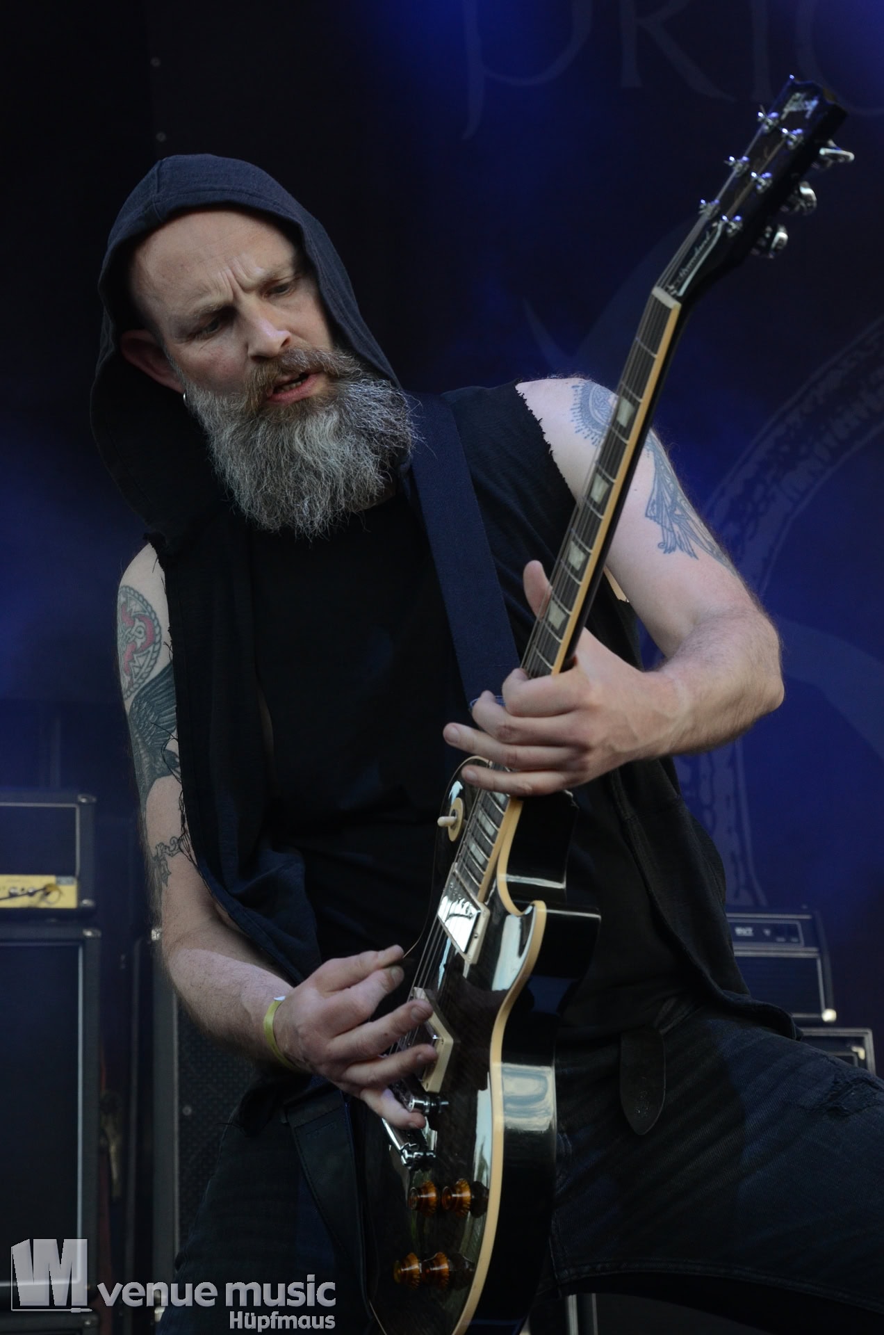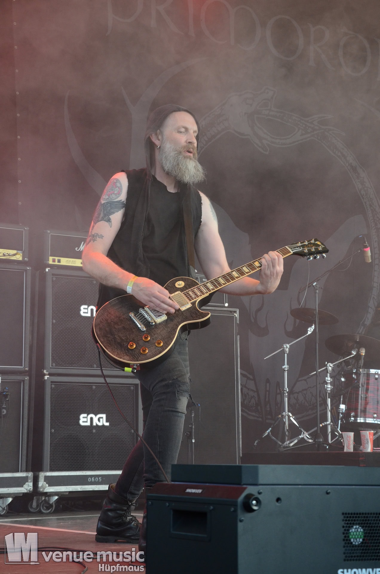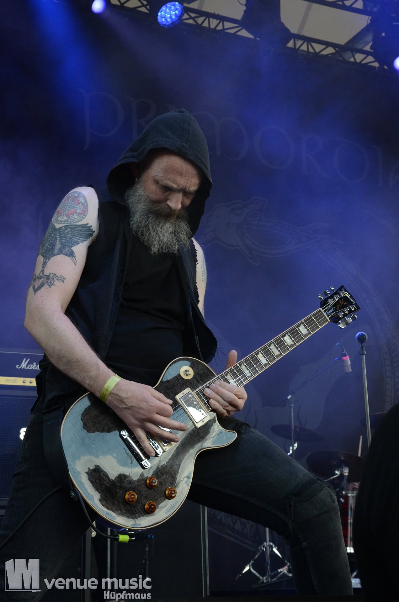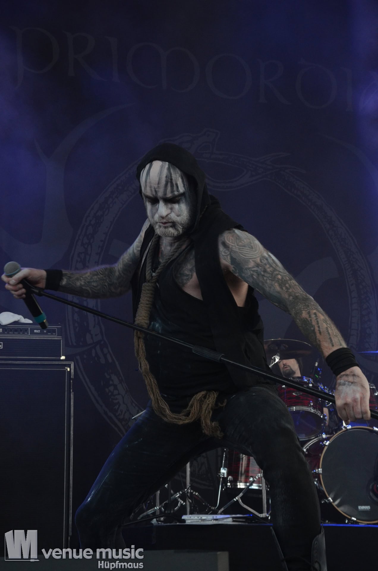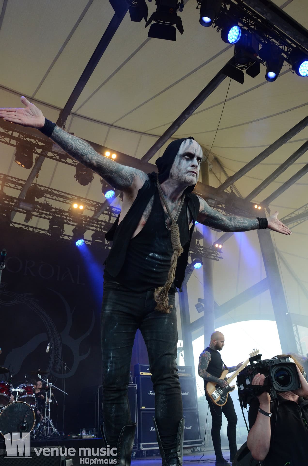 Für Primordial war es eigentlich noch viel zu früh am Tag, hätte die Musik stimmungsmäßig doch eher in die Abendstunden gepasst. Doch davon ließen sich die Iren nicht abschrecken und glänzten mit ihrer Mischung aus Black, Doom, Folk und einer Portion Düsternis. Warm gesungen hatte sich Alan „Naihmass Nemtheanga“ Averill ja bereits am Vortag mit seiner Band Dread Sovereign. Eine Stunde wussten sie gekonnt das Publikum mit Songs wie „As Rome Burns“, „Empire Falls“ oder „To Hell Or The Hangman“ (und das auch noch sehr symbolisch) zu überzeugen.