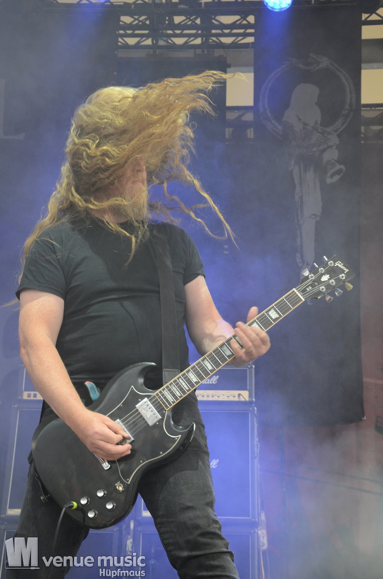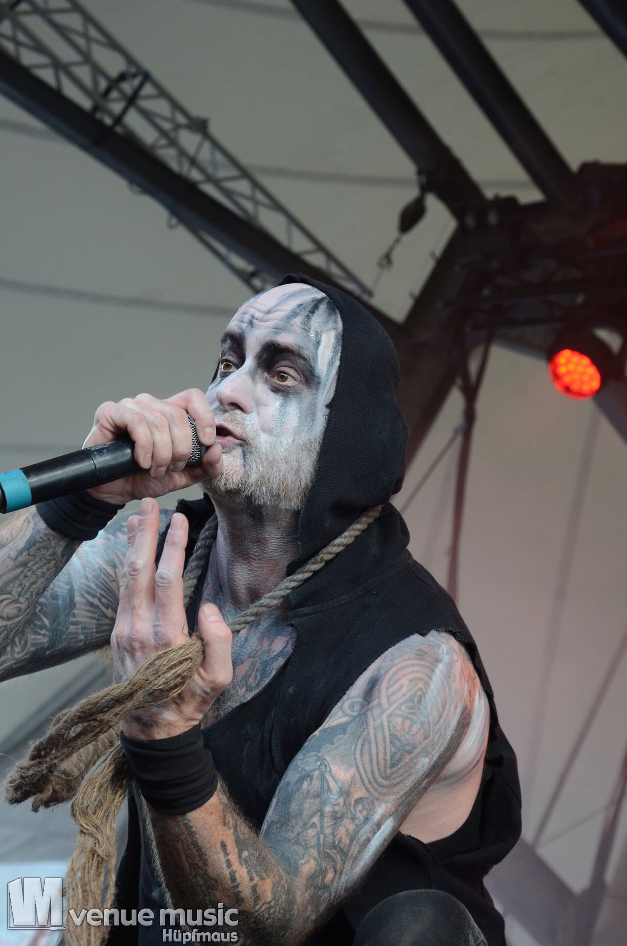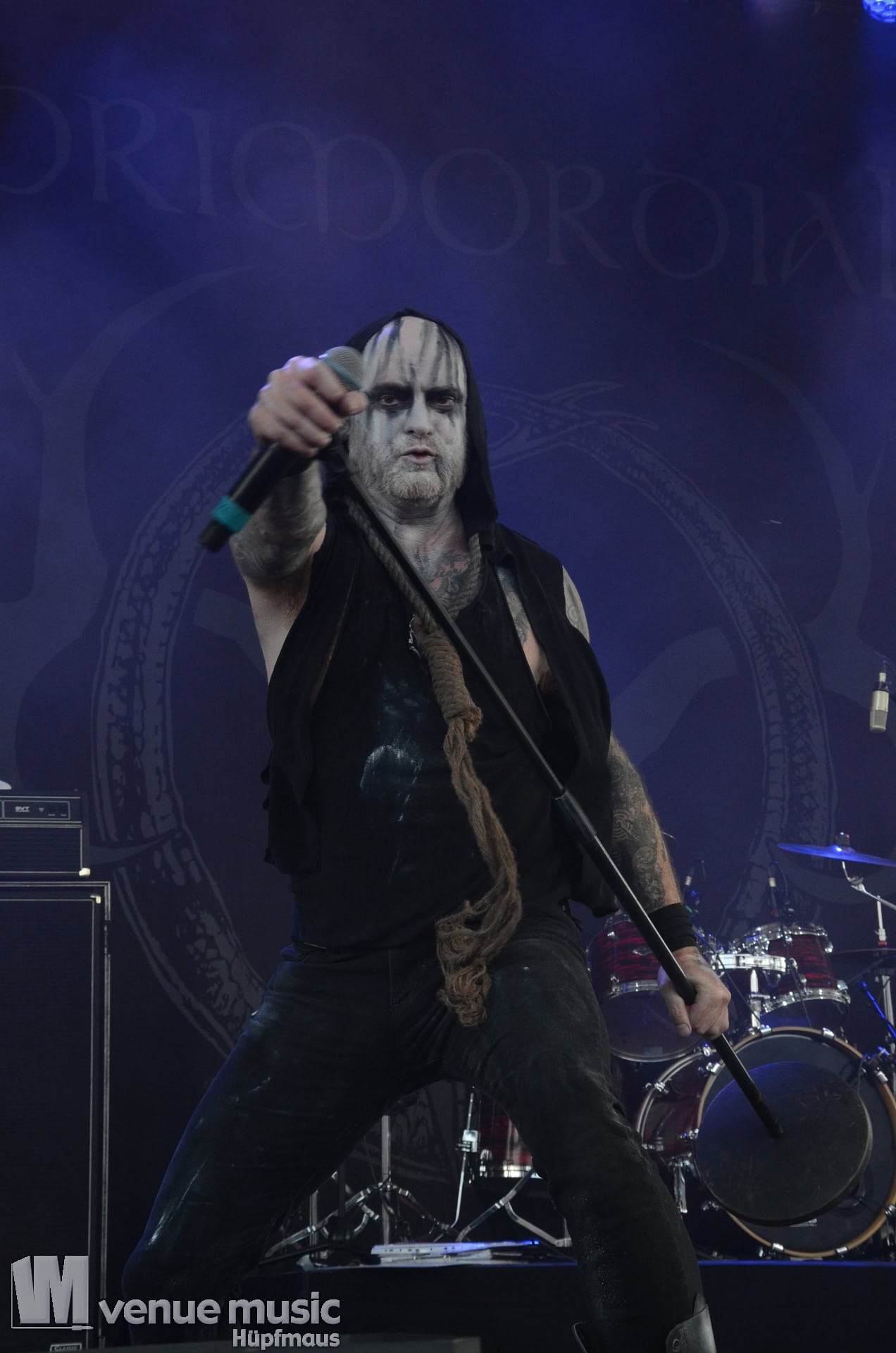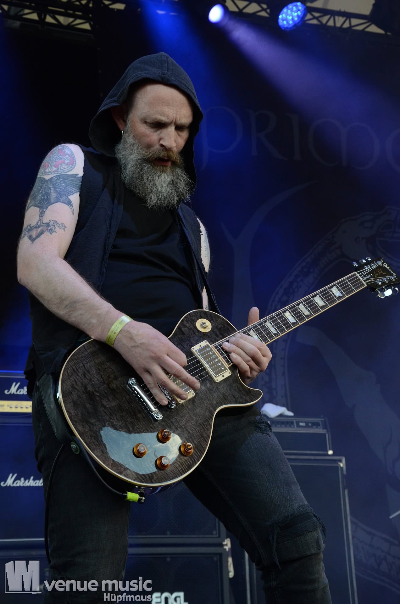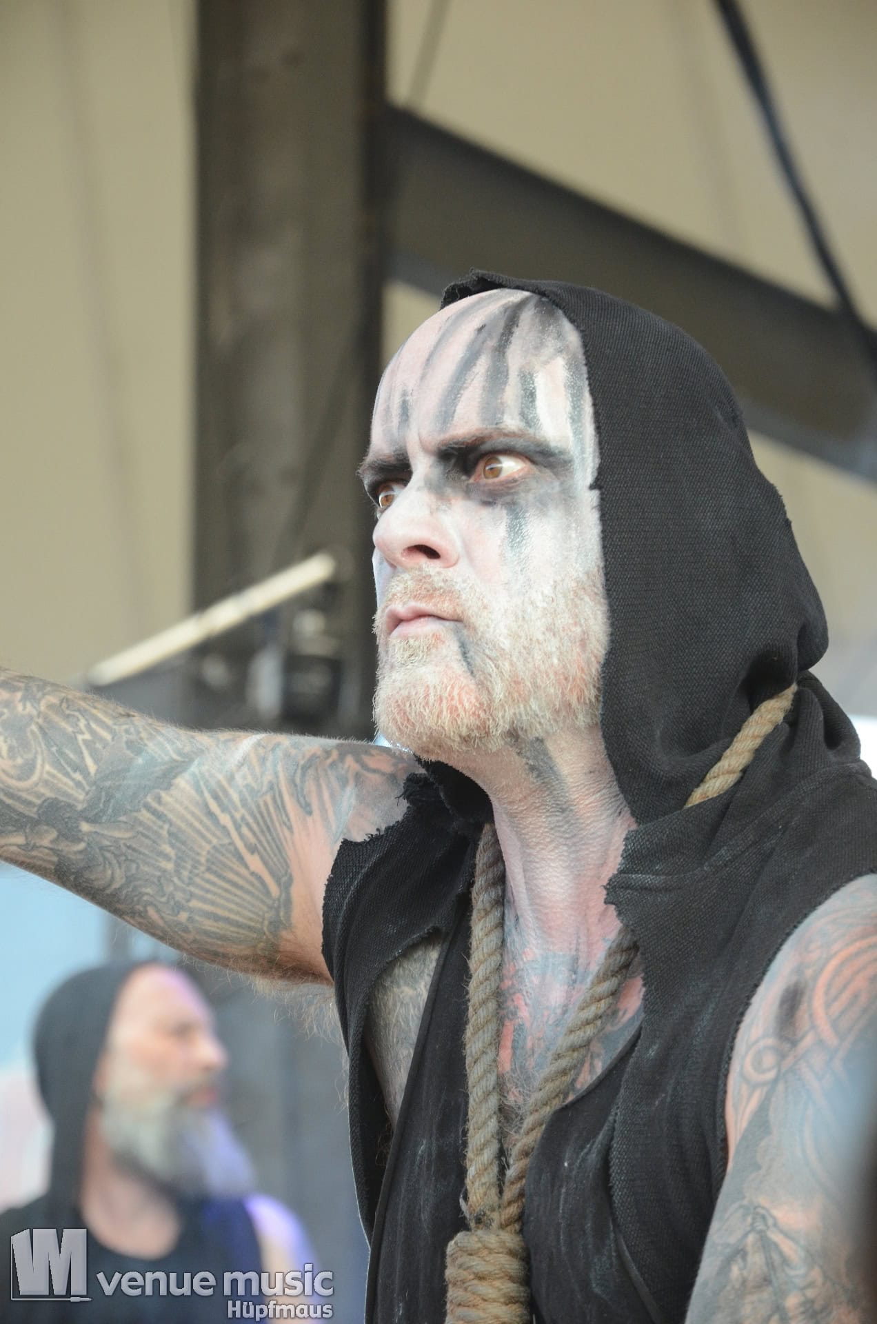 Für Primordial war es eigentlich noch viel zu früh am Tag, hätte die Musik stimmungsmäßig doch eher in die Abendstunden gepasst. Doch davon ließen sich die Iren nicht abschrecken und glänzten mit ihrer Mischung aus Black, Doom, Folk und einer Portion Düsternis. Warm gesungen hatte sich Alan „Naihmass Nemtheanga“ Averill ja bereits am Vortag mit seiner Band Dread Sovereign. Eine Stunde wussten sie gekonnt das Publikum mit Songs wie „As Rome Burns“, „Empire Falls“ oder „To Hell Or The Hangman“ (und das auch noch sehr symbolisch) zu überzeugen.