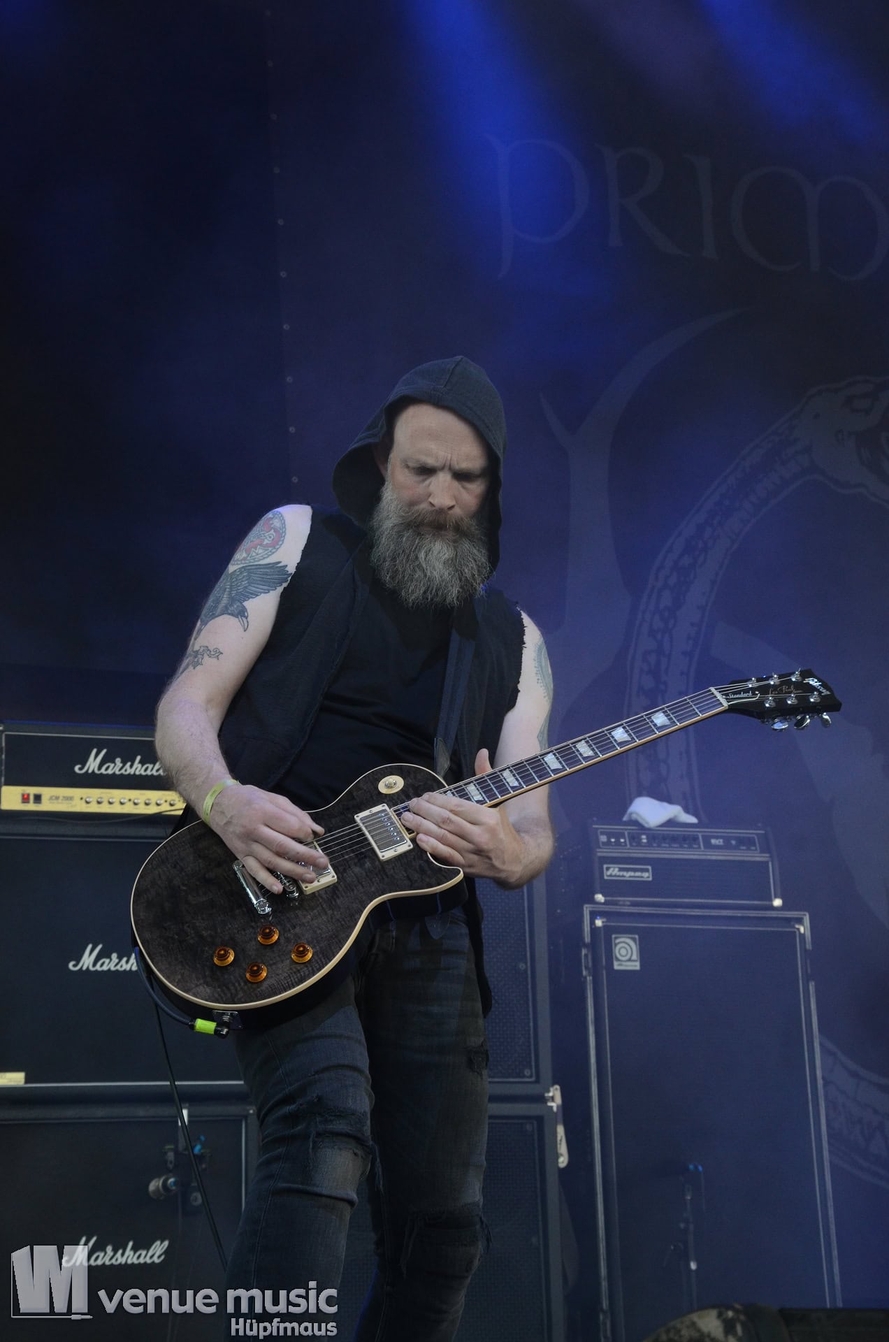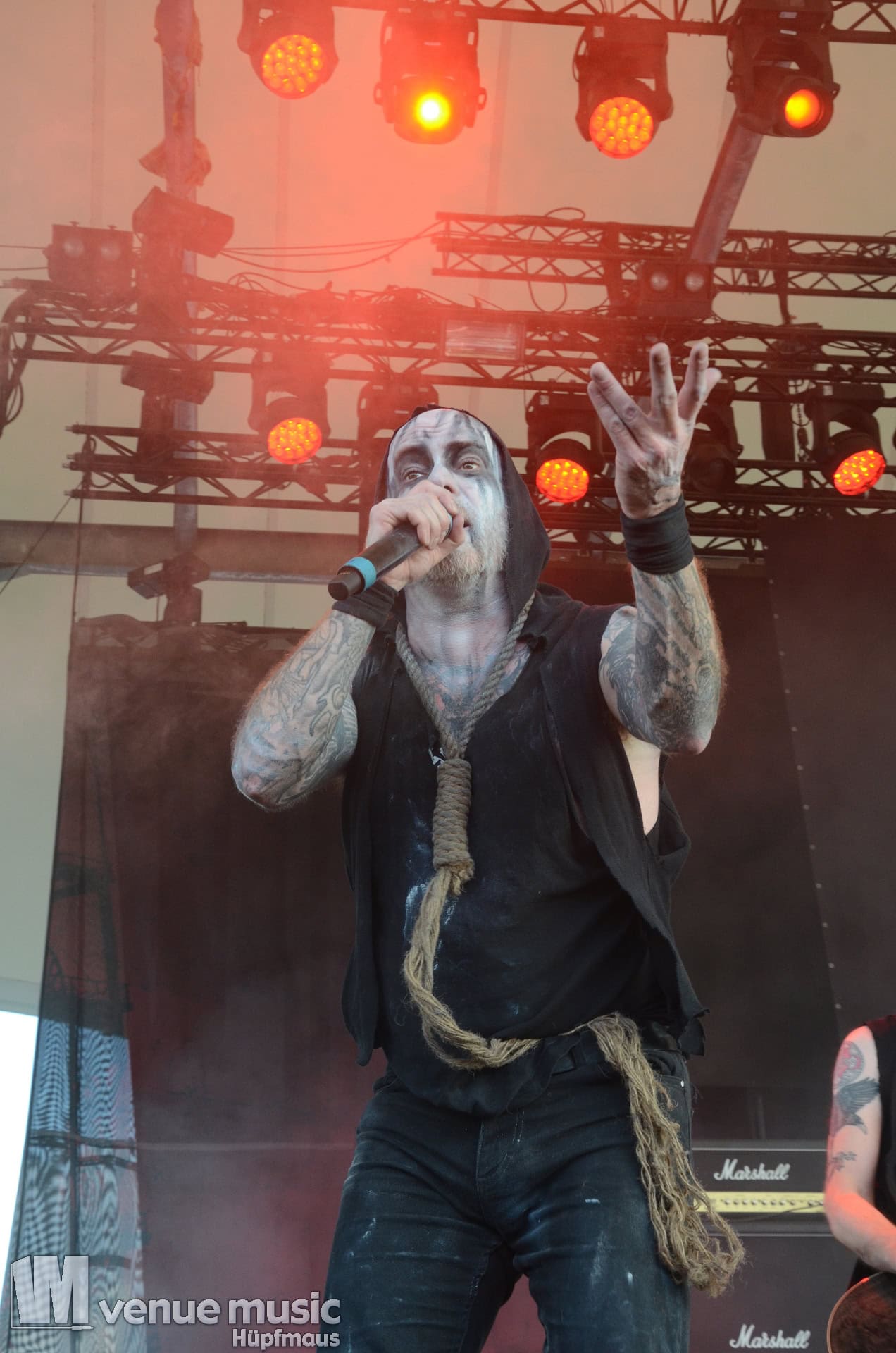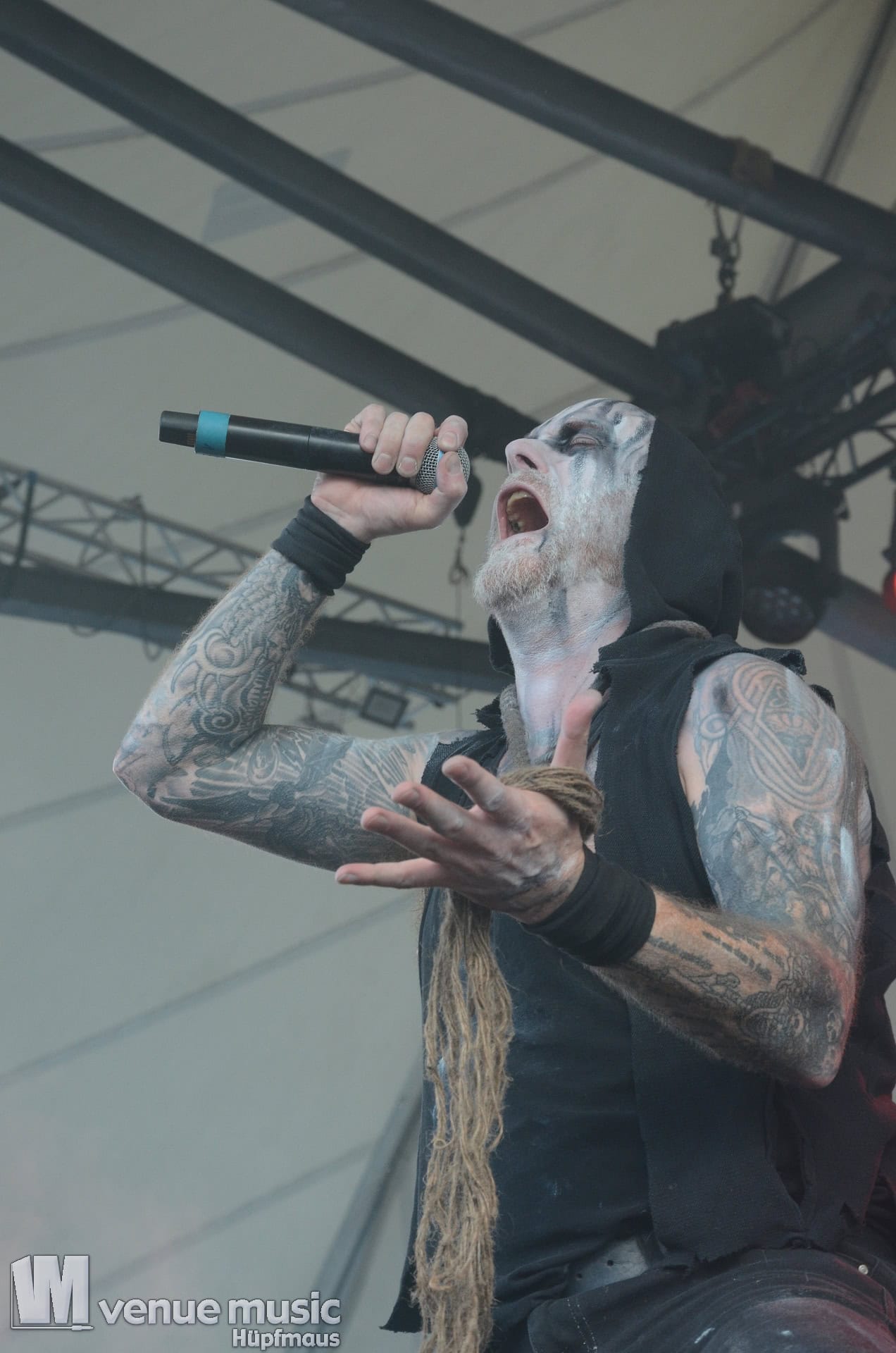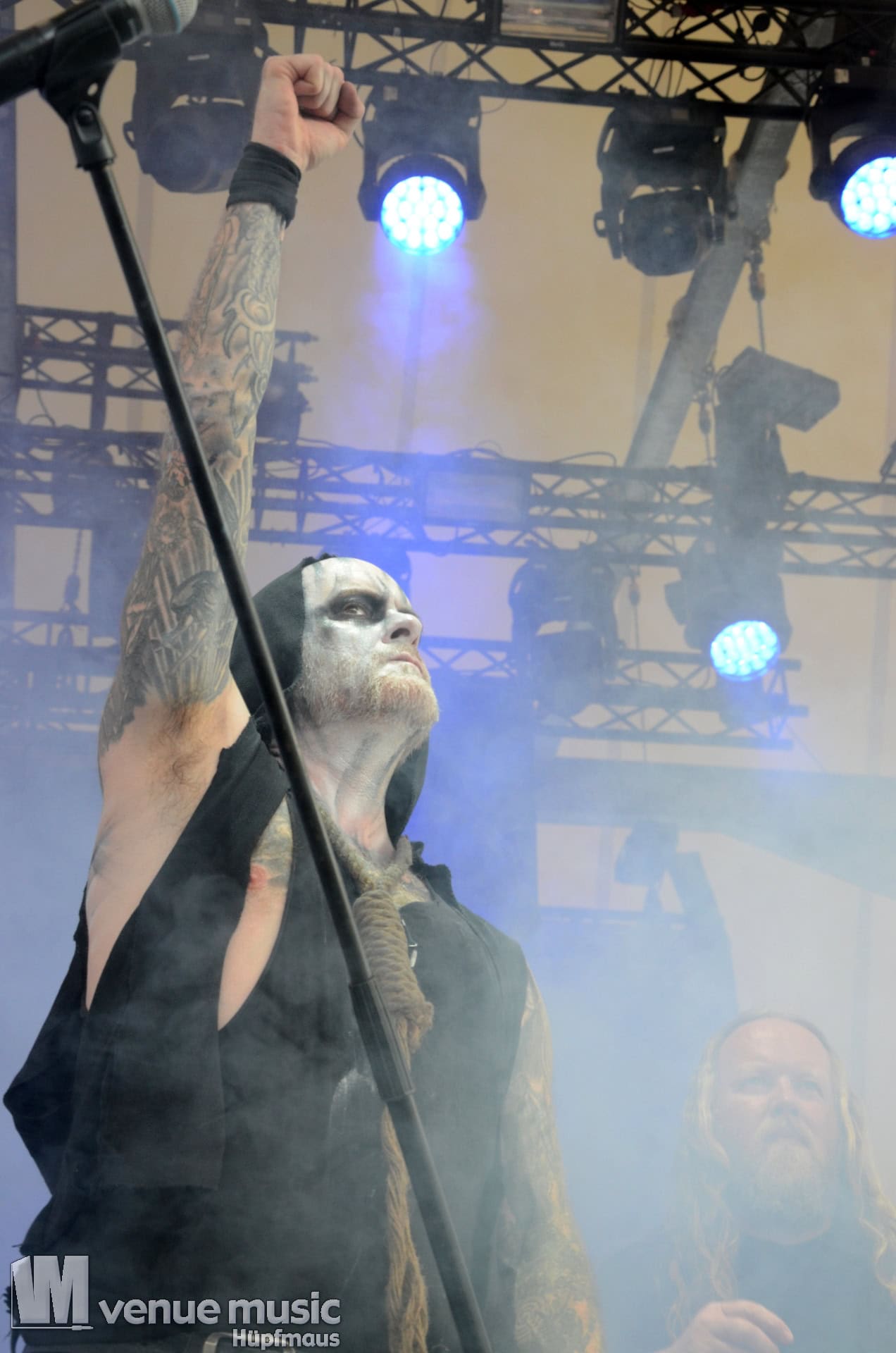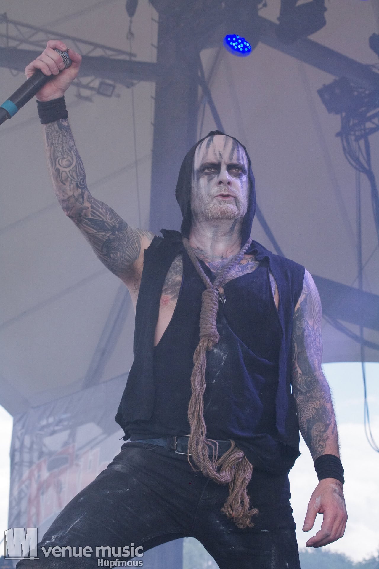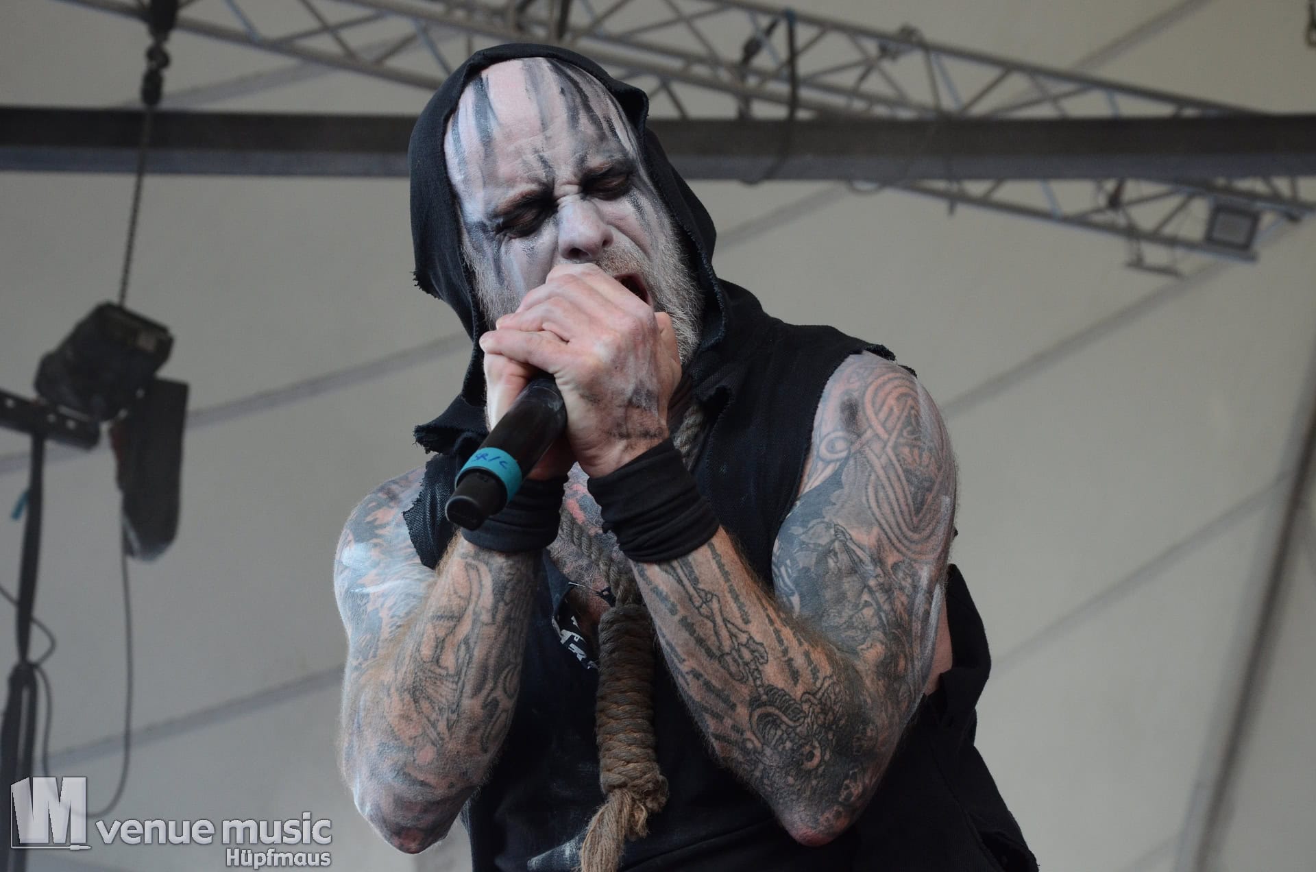 Für Primordial war es eigentlich noch viel zu früh am Tag, hätte die Musik stimmungsmäßig doch eher in die Abendstunden gepasst. Doch davon ließen sich die Iren nicht abschrecken und glänzten mit ihrer Mischung aus Black, Doom, Folk und einer Portion Düsternis. Warm gesungen hatte sich Alan „Naihmass Nemtheanga“ Averill ja bereits am Vortag mit seiner Band Dread Sovereign. Eine Stunde wussten sie gekonnt das Publikum mit Songs wie „As Rome Burns“, „Empire Falls“ oder „To Hell Or The Hangman“ (und das auch noch sehr symbolisch) zu überzeugen.