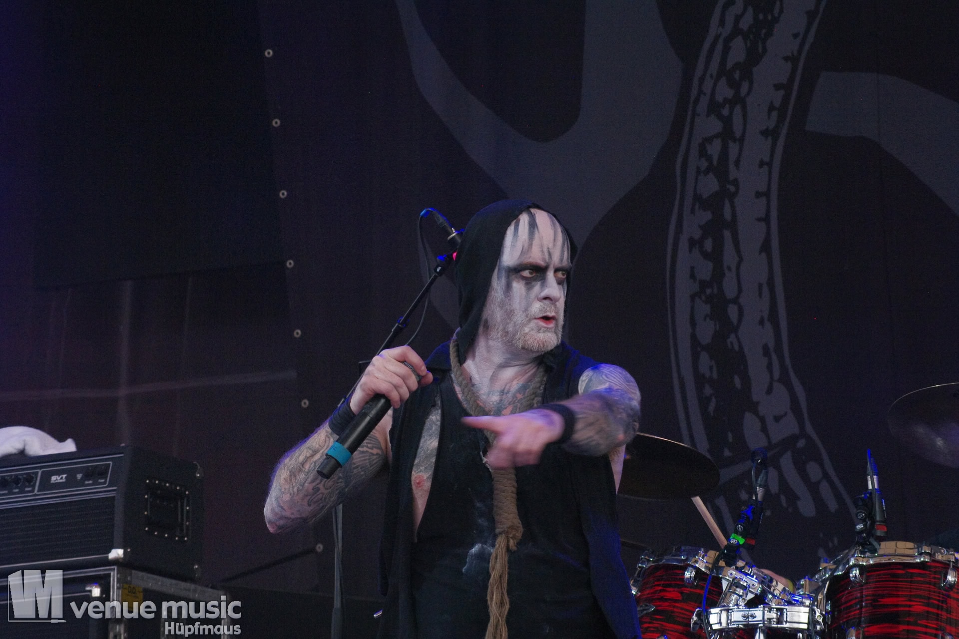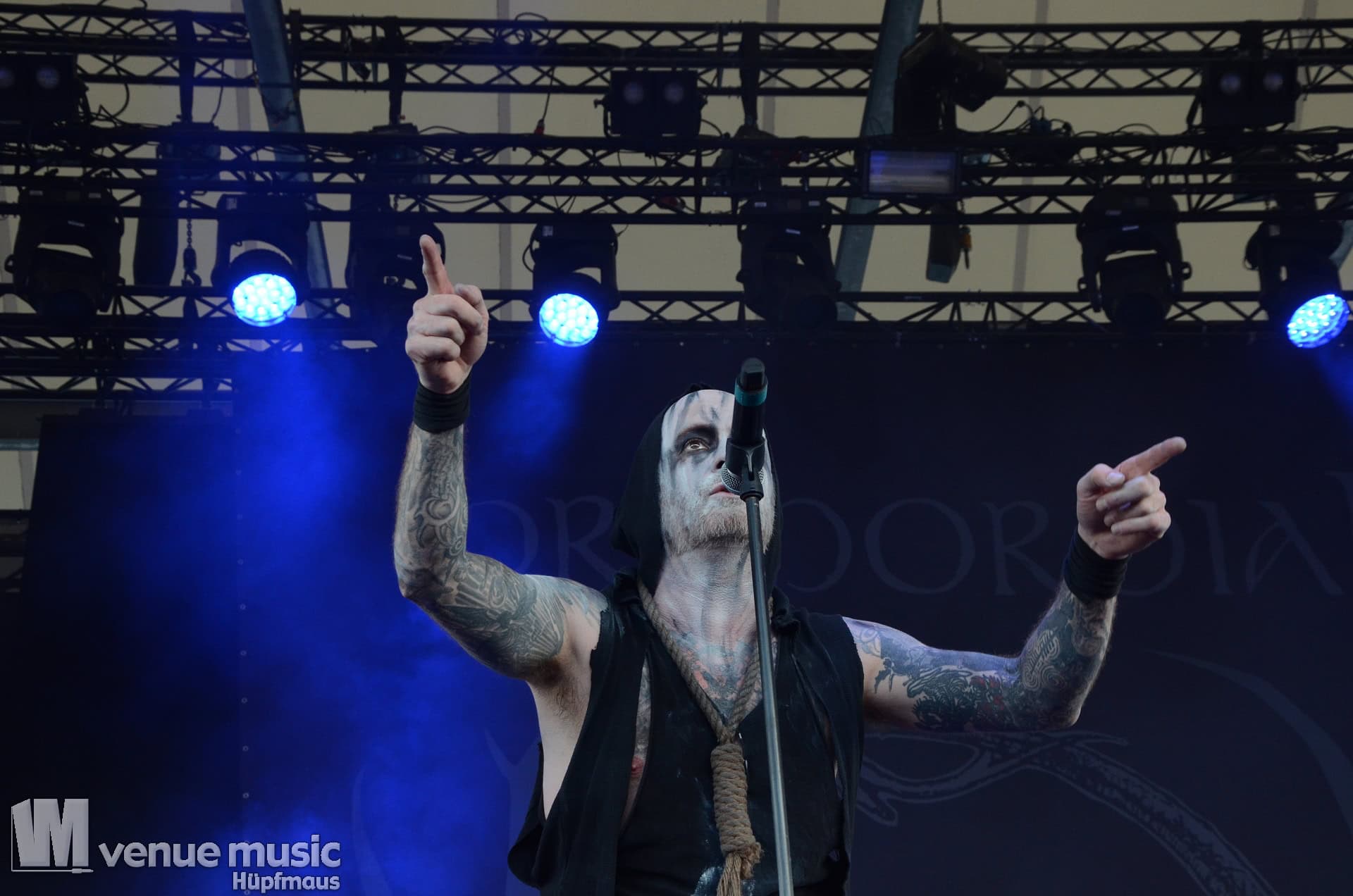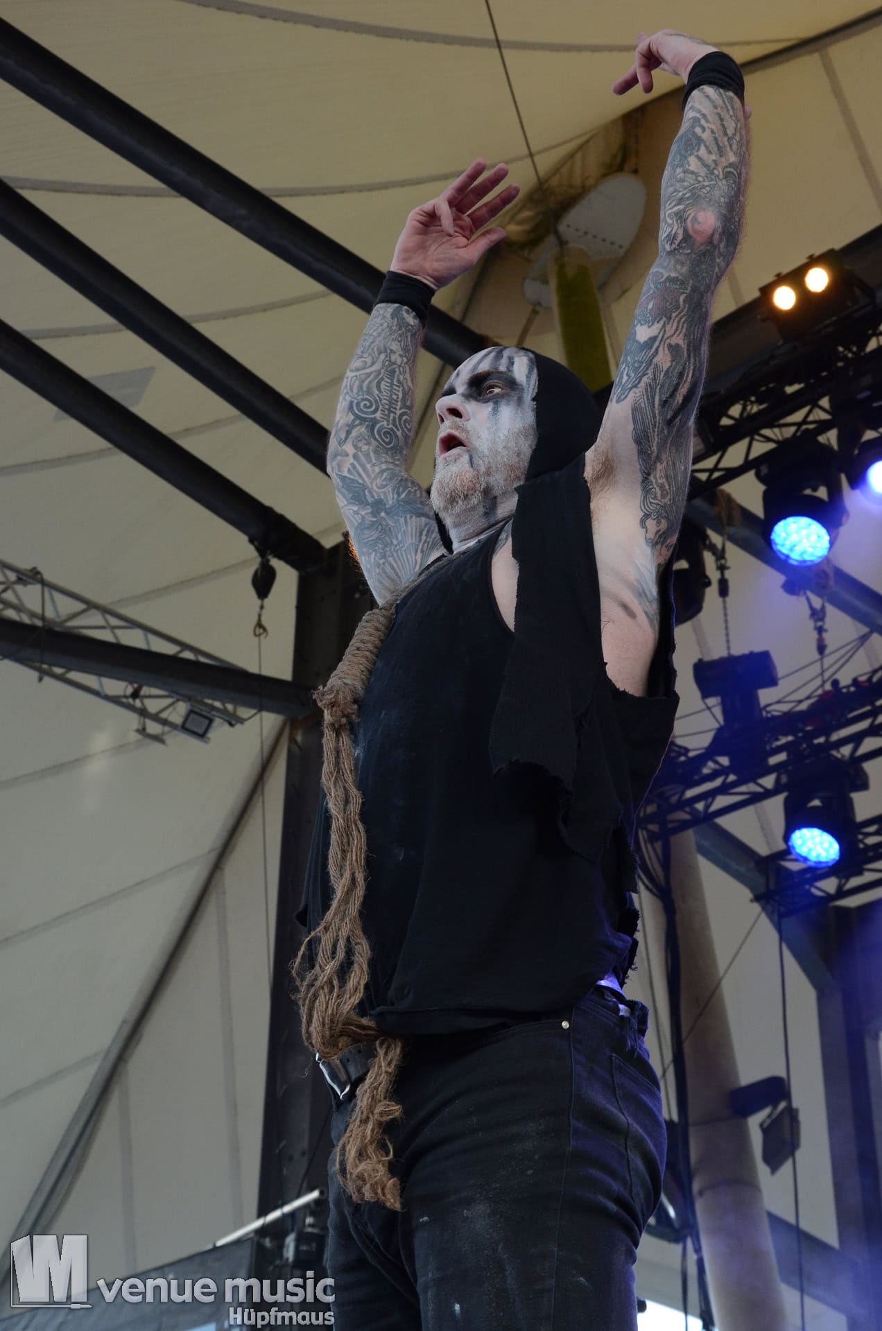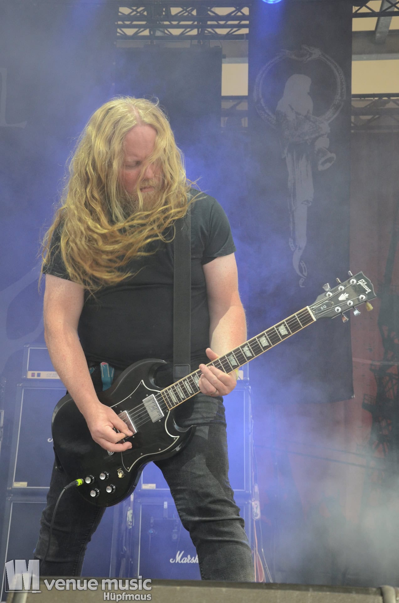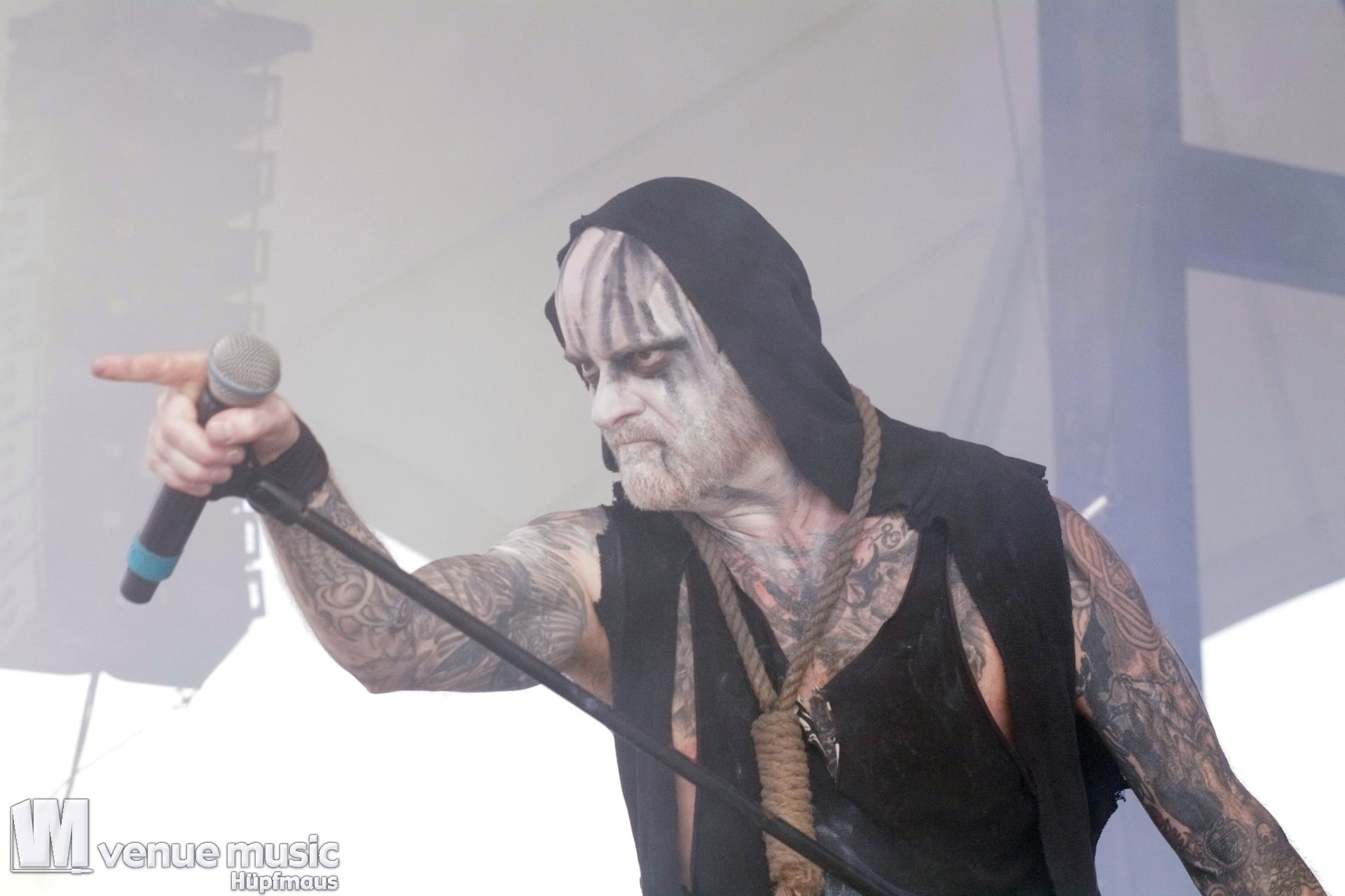 Für Primordial war es eigentlich noch viel zu früh am Tag, hätte die Musik stimmungsmäßig doch eher in die Abendstunden gepasst. Doch davon ließen sich die Iren nicht abschrecken und glänzten mit ihrer Mischung aus Black, Doom, Folk und einer Portion Düsternis. Warm gesungen hatte sich Alan „Naihmass Nemtheanga“ Averill ja bereits am Vortag mit seiner Band Dread Sovereign. Eine Stunde wussten sie gekonnt das Publikum mit Songs wie „As Rome Burns“, „Empire Falls“ oder „To Hell Or The Hangman“ (und das auch noch sehr symbolisch) zu überzeugen.