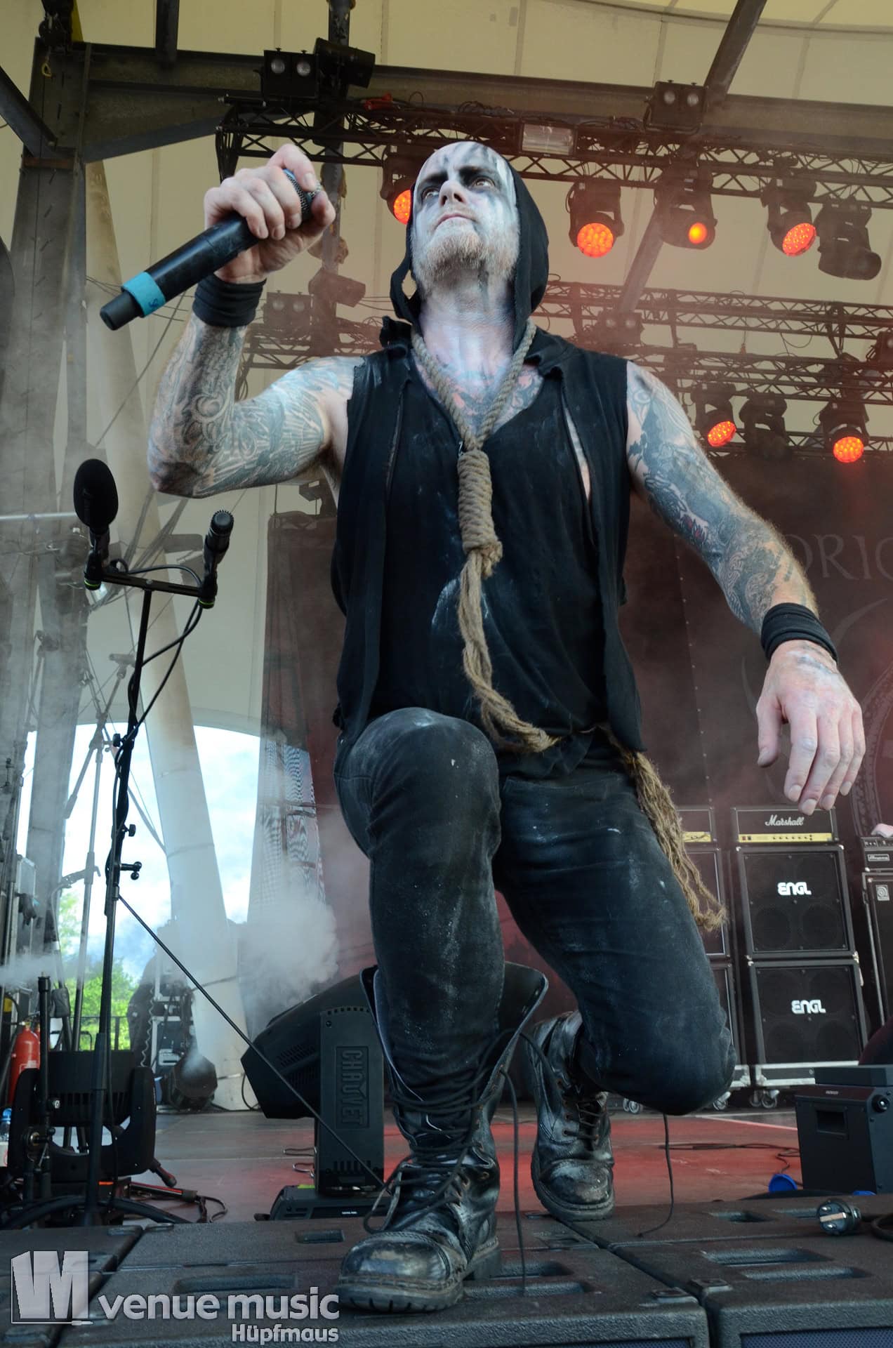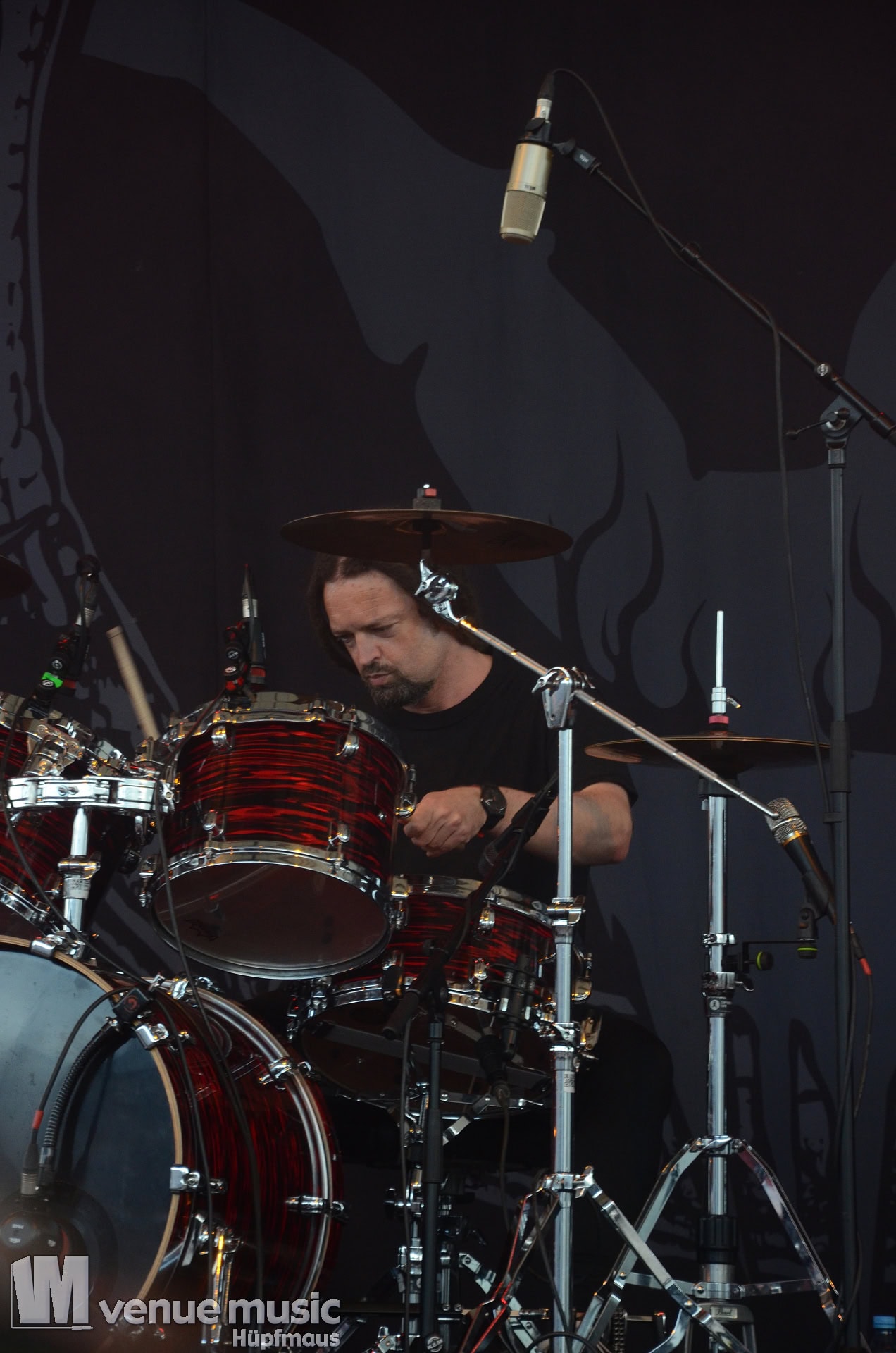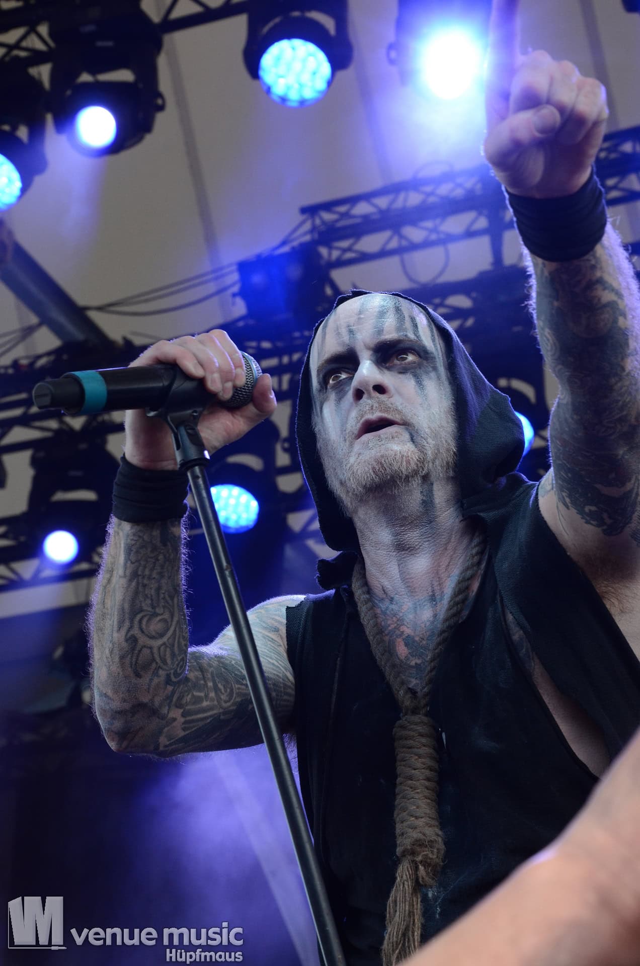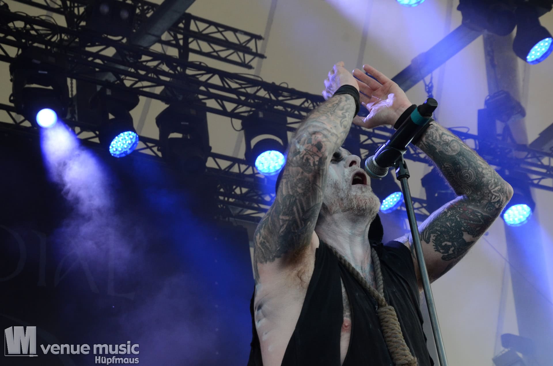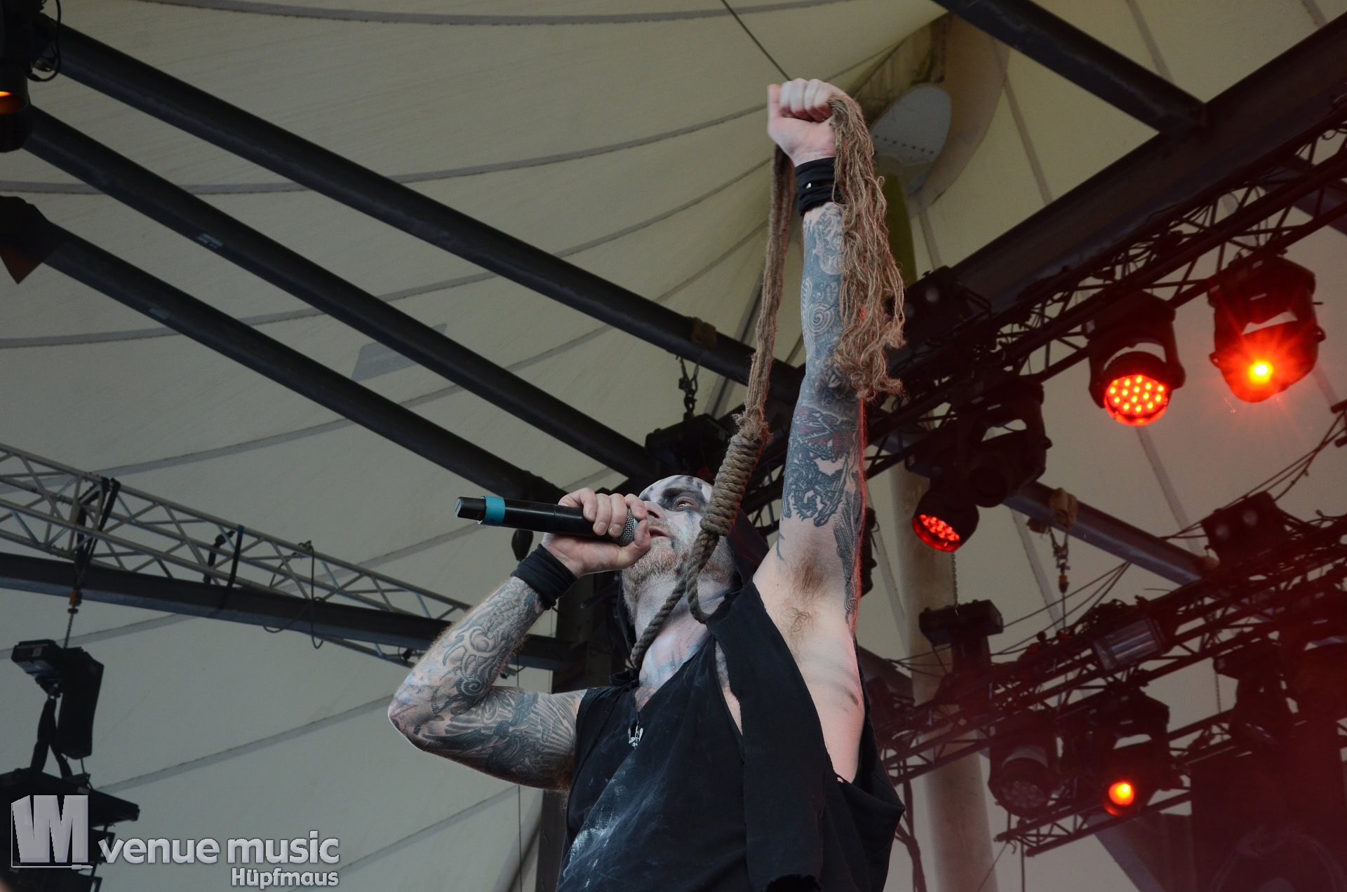 Für Primordial war es eigentlich noch viel zu früh am Tag, hätte die Musik stimmungsmäßig doch eher in die Abendstunden gepasst. Doch davon ließen sich die Iren nicht abschrecken und glänzten mit ihrer Mischung aus Black, Doom, Folk und einer Portion Düsternis. Warm gesungen hatte sich Alan „Naihmass Nemtheanga“ Averill ja bereits am Vortag mit seiner Band Dread Sovereign. Eine Stunde wussten sie gekonnt das Publikum mit Songs wie „As Rome Burns“, „Empire Falls“ oder „To Hell Or The Hangman“ (und das auch noch sehr symbolisch) zu überzeugen.