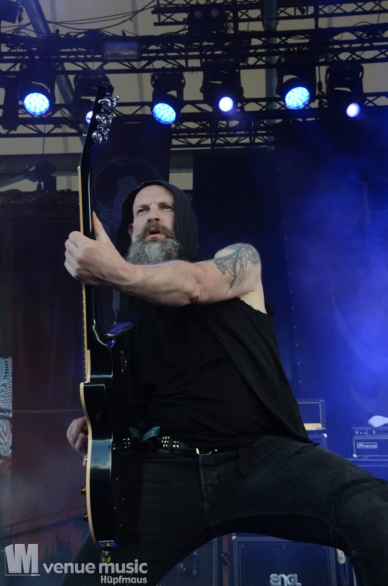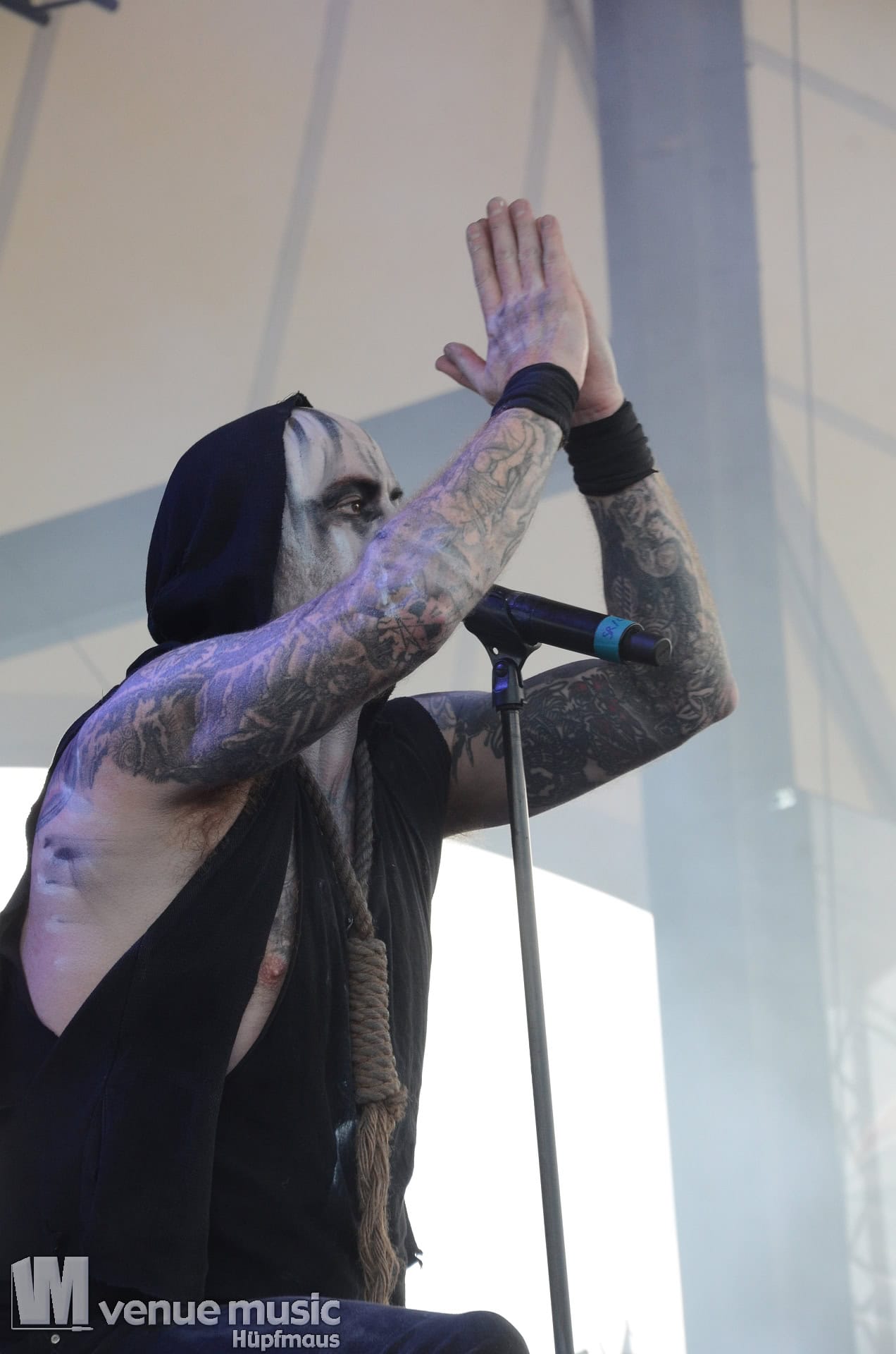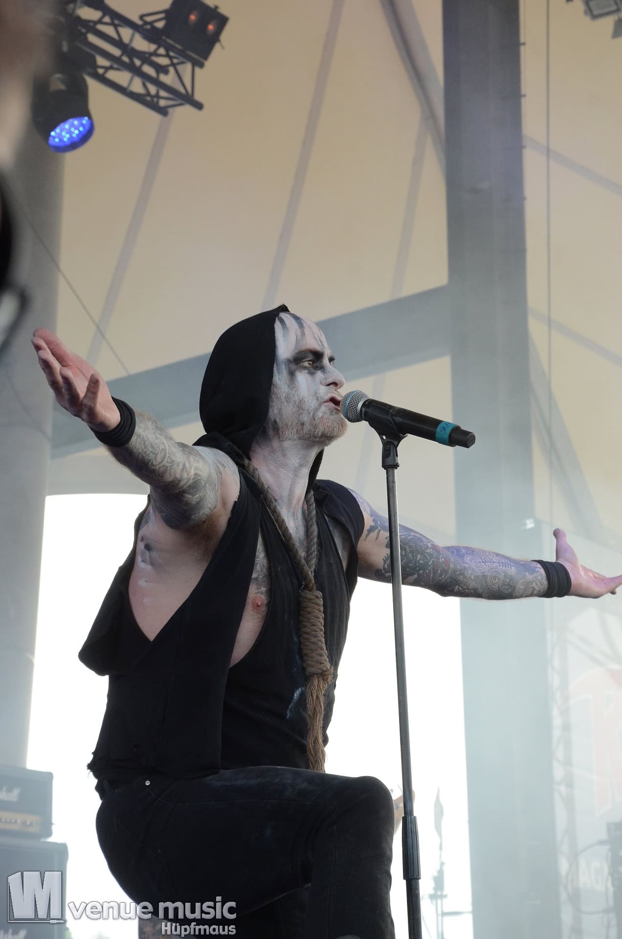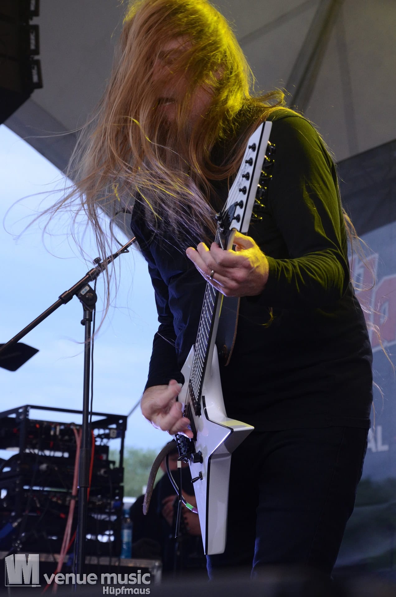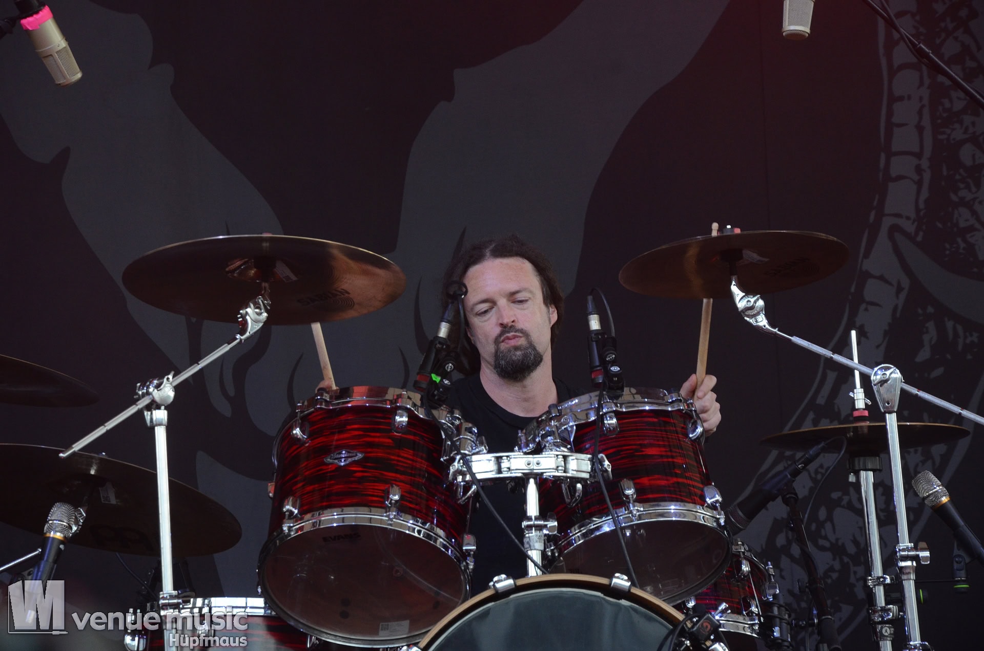 Für Primordial war es eigentlich noch viel zu früh am Tag, hätte die Musik stimmungsmäßig doch eher in die Abendstunden gepasst. Doch davon ließen sich die Iren nicht abschrecken und glänzten mit ihrer Mischung aus Black, Doom, Folk und einer Portion Düsternis. Warm gesungen hatte sich Alan „Naihmass Nemtheanga“ Averill ja bereits am Vortag mit seiner Band Dread Sovereign. Eine Stunde wussten sie gekonnt das Publikum mit Songs wie „As Rome Burns“, „Empire Falls“ oder „To Hell Or The Hangman“ (und das auch noch sehr symbolisch) zu überzeugen.