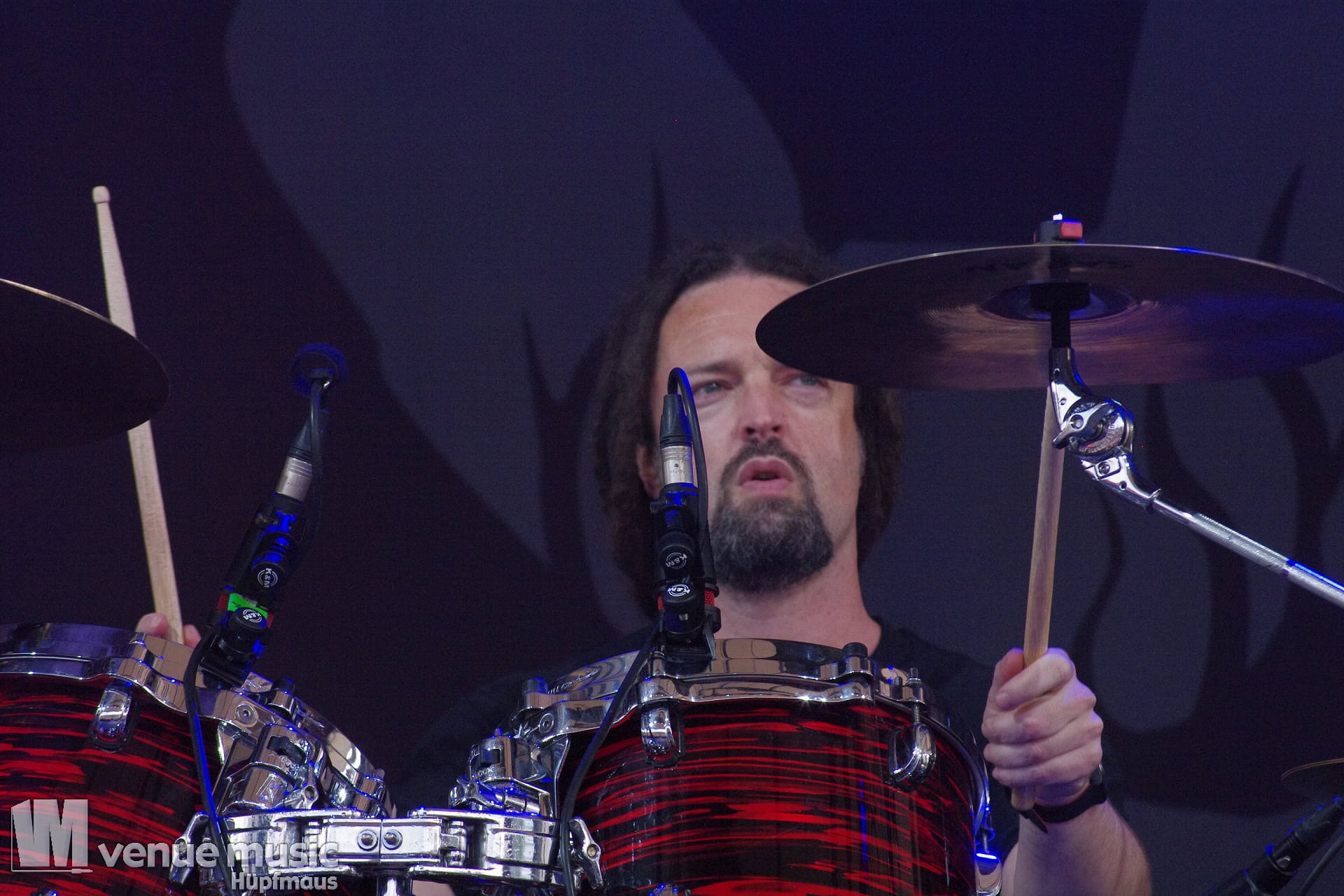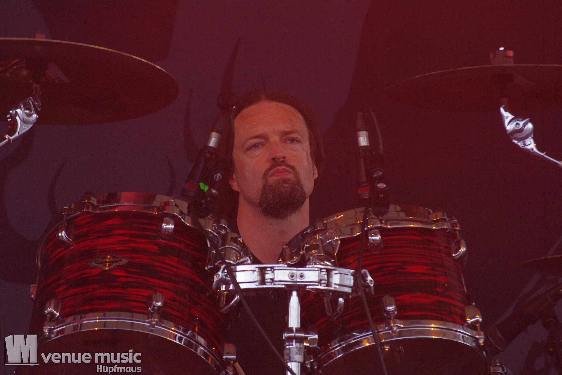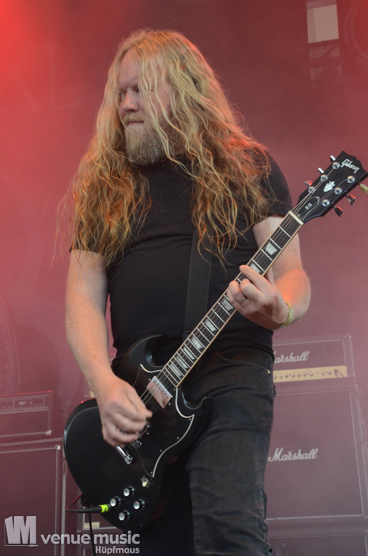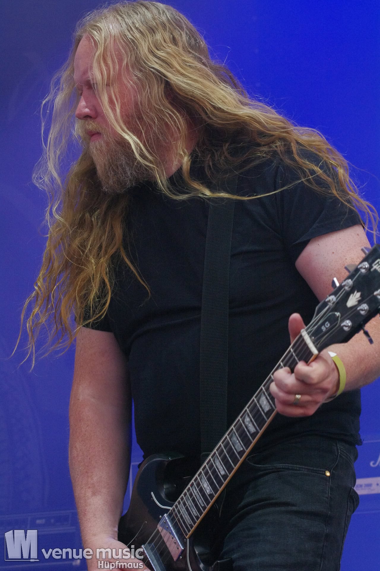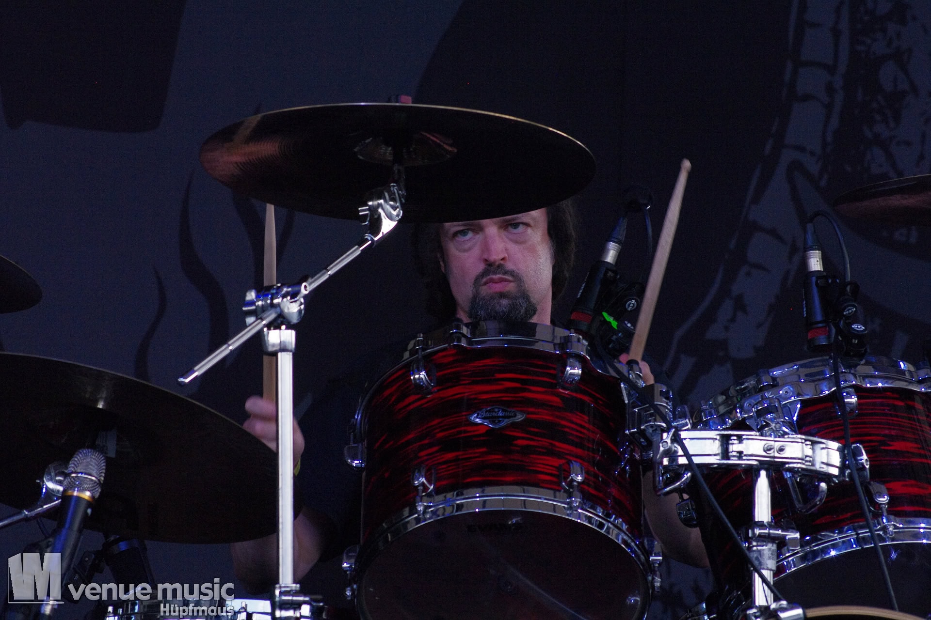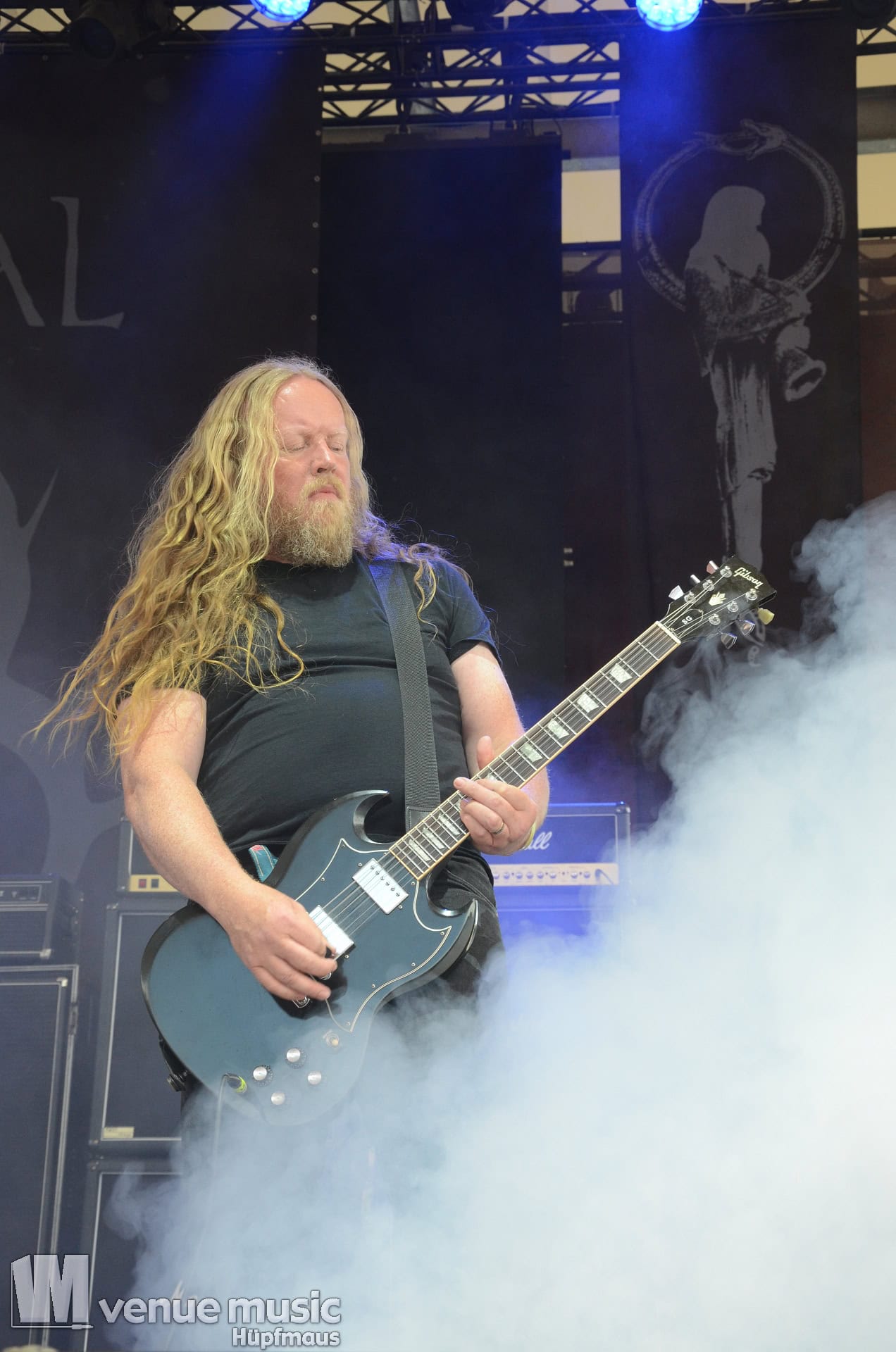 Für Primordial war es eigentlich noch viel zu früh am Tag, hätte die Musik stimmungsmäßig doch eher in die Abendstunden gepasst. Doch davon ließen sich die Iren nicht abschrecken und glänzten mit ihrer Mischung aus Black, Doom, Folk und einer Portion Düsternis. Warm gesungen hatte sich Alan „Naihmass Nemtheanga“ Averill ja bereits am Vortag mit seiner Band Dread Sovereign. Eine Stunde wussten sie gekonnt das Publikum mit Songs wie „As Rome Burns“, „Empire Falls“ oder „To Hell Or The Hangman“ (und das auch noch sehr symbolisch) zu überzeugen.