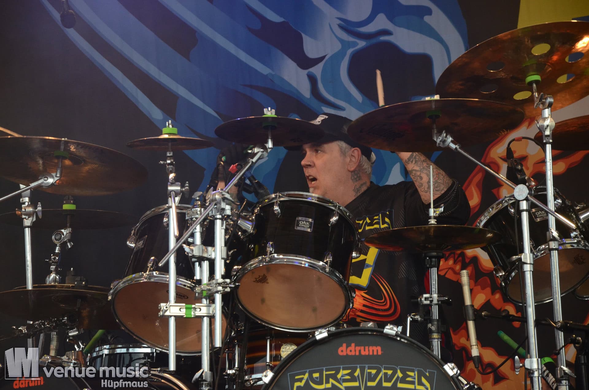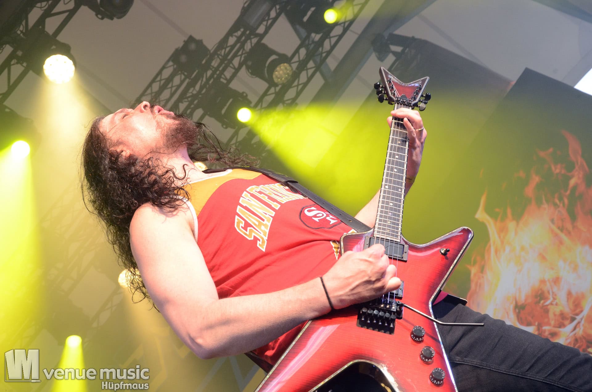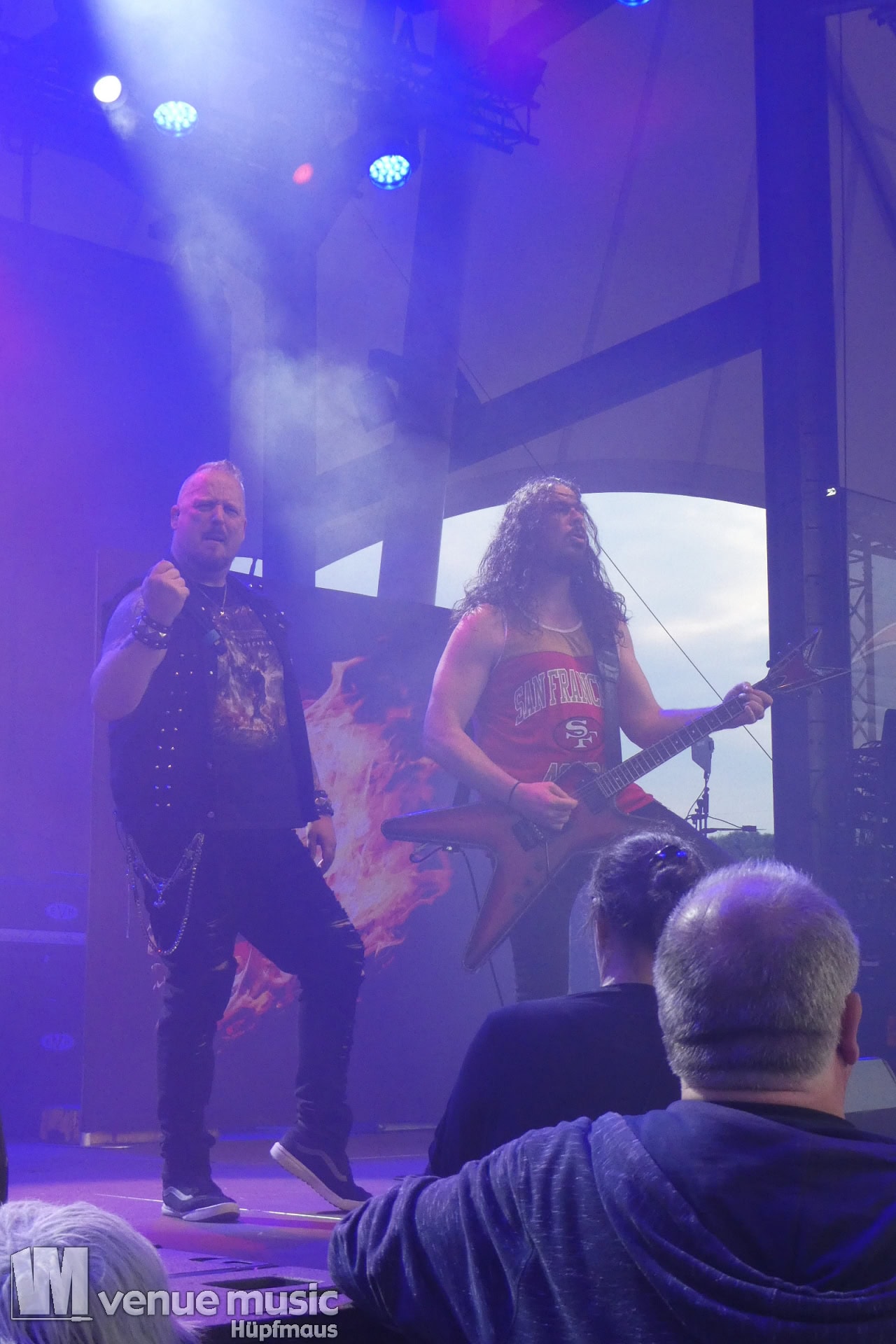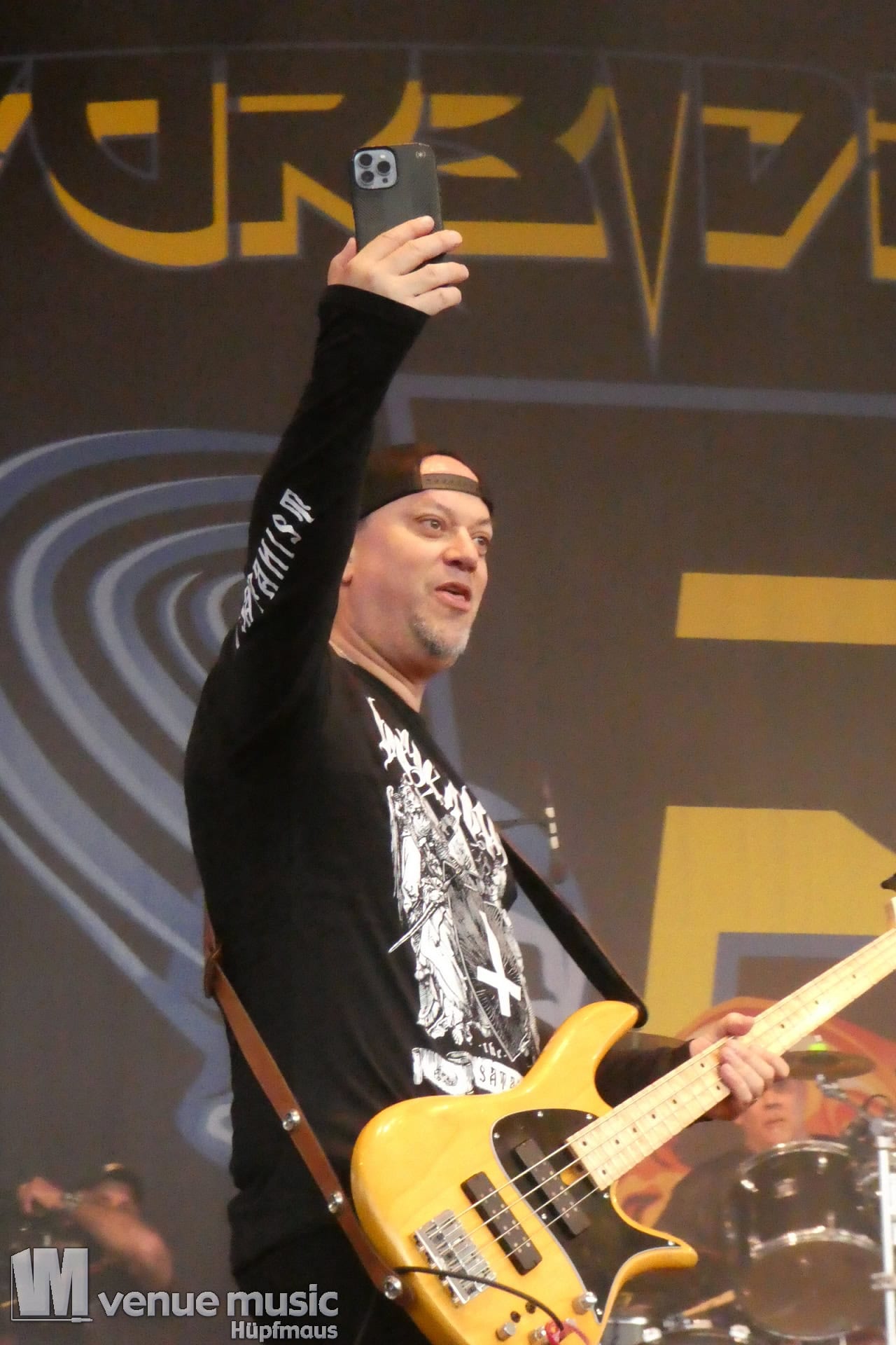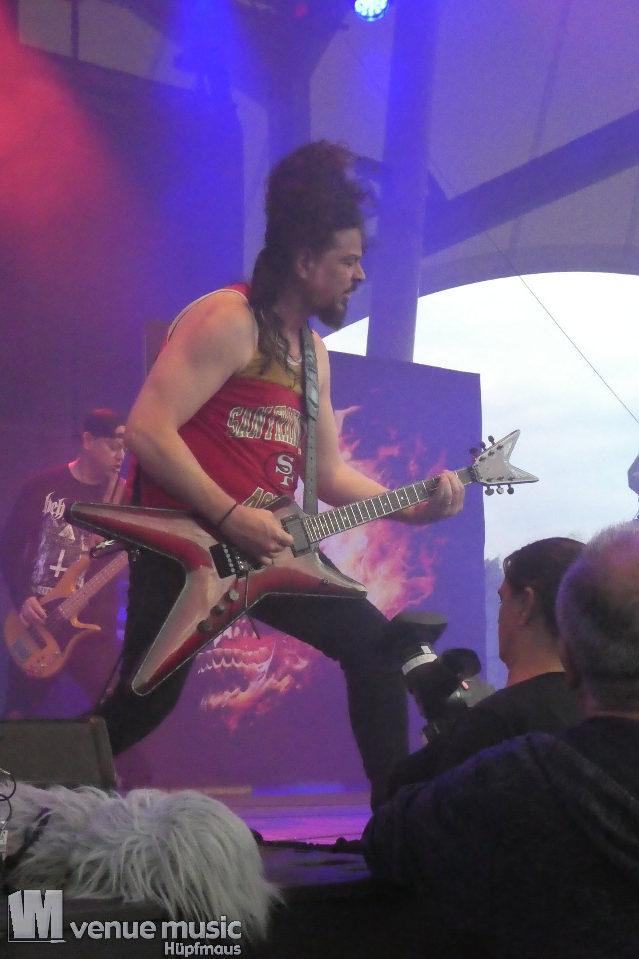 Als nächstes war dann eine der Bands dran, auf die wir uns sehr gefreut hatten: Forbidden. Grade erst wieder aktiv und mit zwei frischen Kräften an Drums und Vocals gaben sie auf der Bühne so richtig Gas. Thrash Metal aus der Bay Area vom Feinsten! Gelten doch auch ihre ersten beiden Alben „Forbidden Evil“ und „Twisted into Form“ aus den Jahren 1988 bzw. 1990 als Genre-Klassiker. Spätestens jetzt gab es im Publikum kein Halten mehr, das Amphitheater wurde zum Hexenkessel und die Graben-Security hatte ihre Mühe mit den Crowdsurfern. Denn leider muss man sagen, waren das auch alles keine Graben-Spezialisten um es mal gelinde auszudrücken. Glücklicherweise gab es bei den meisten Bands kaum Crowdsurfer. Doch hier mussten sie richtig ran.