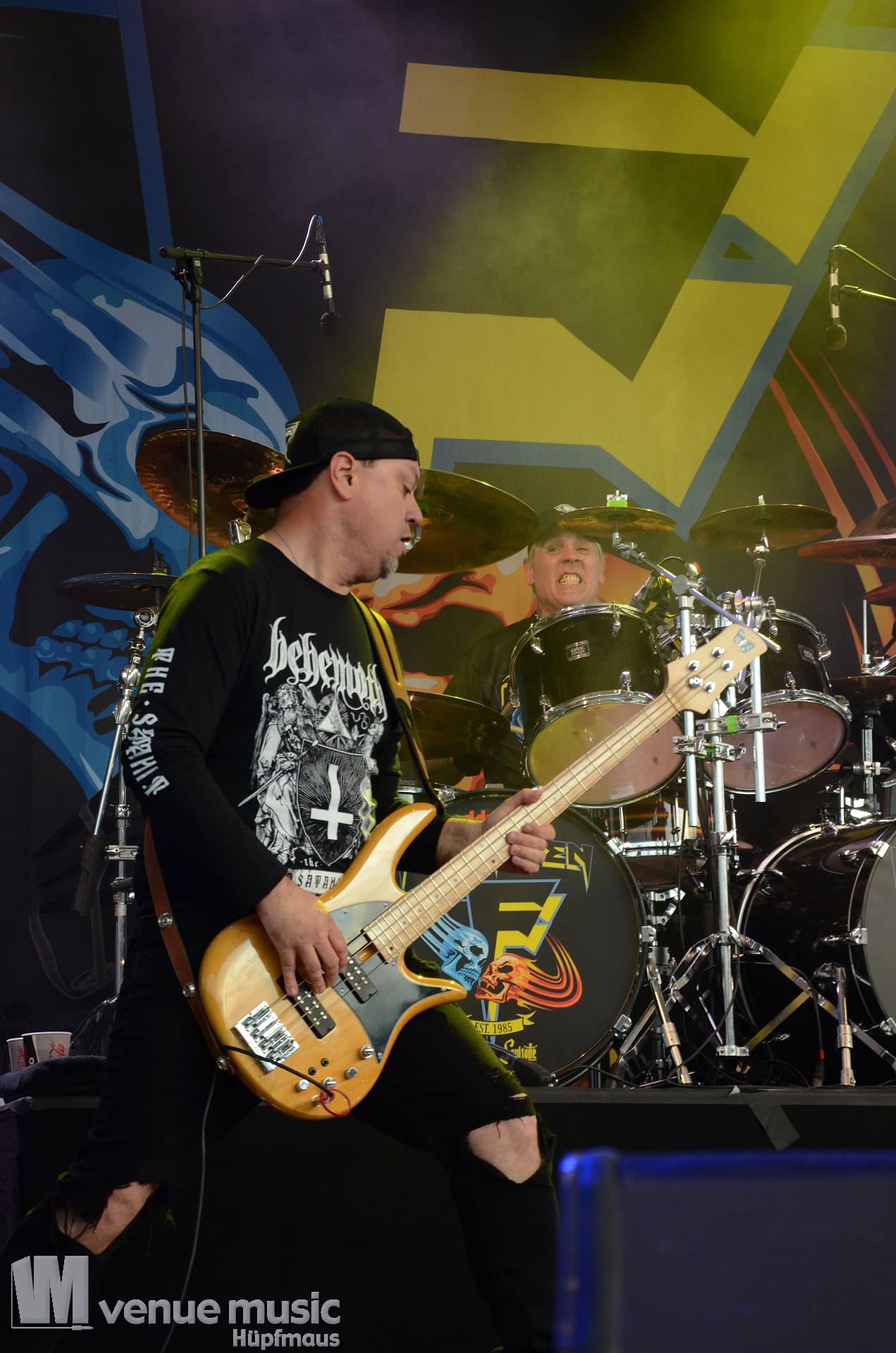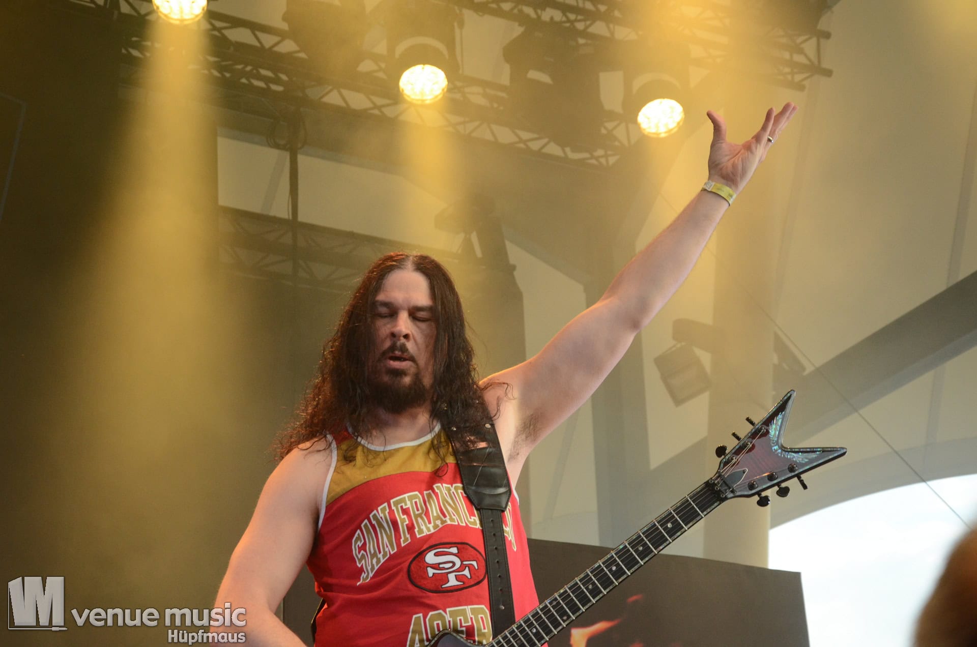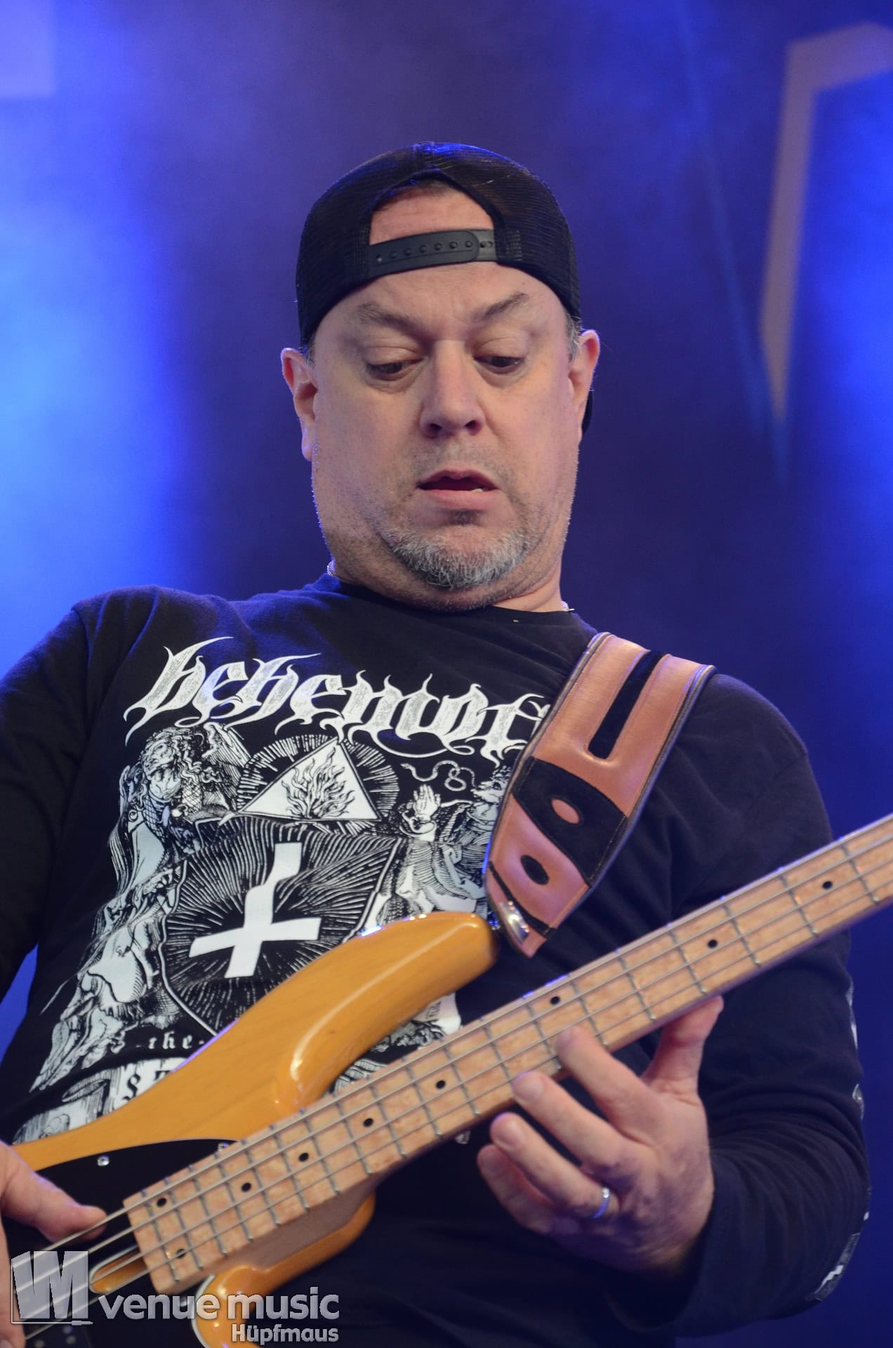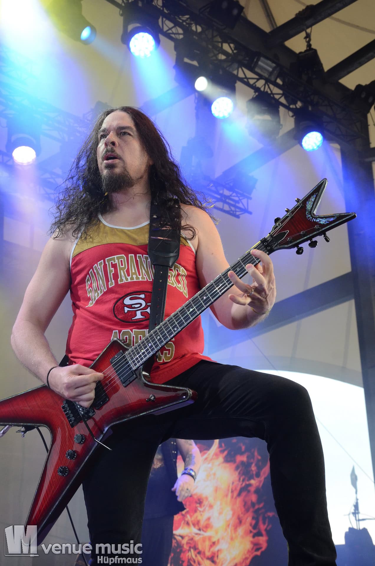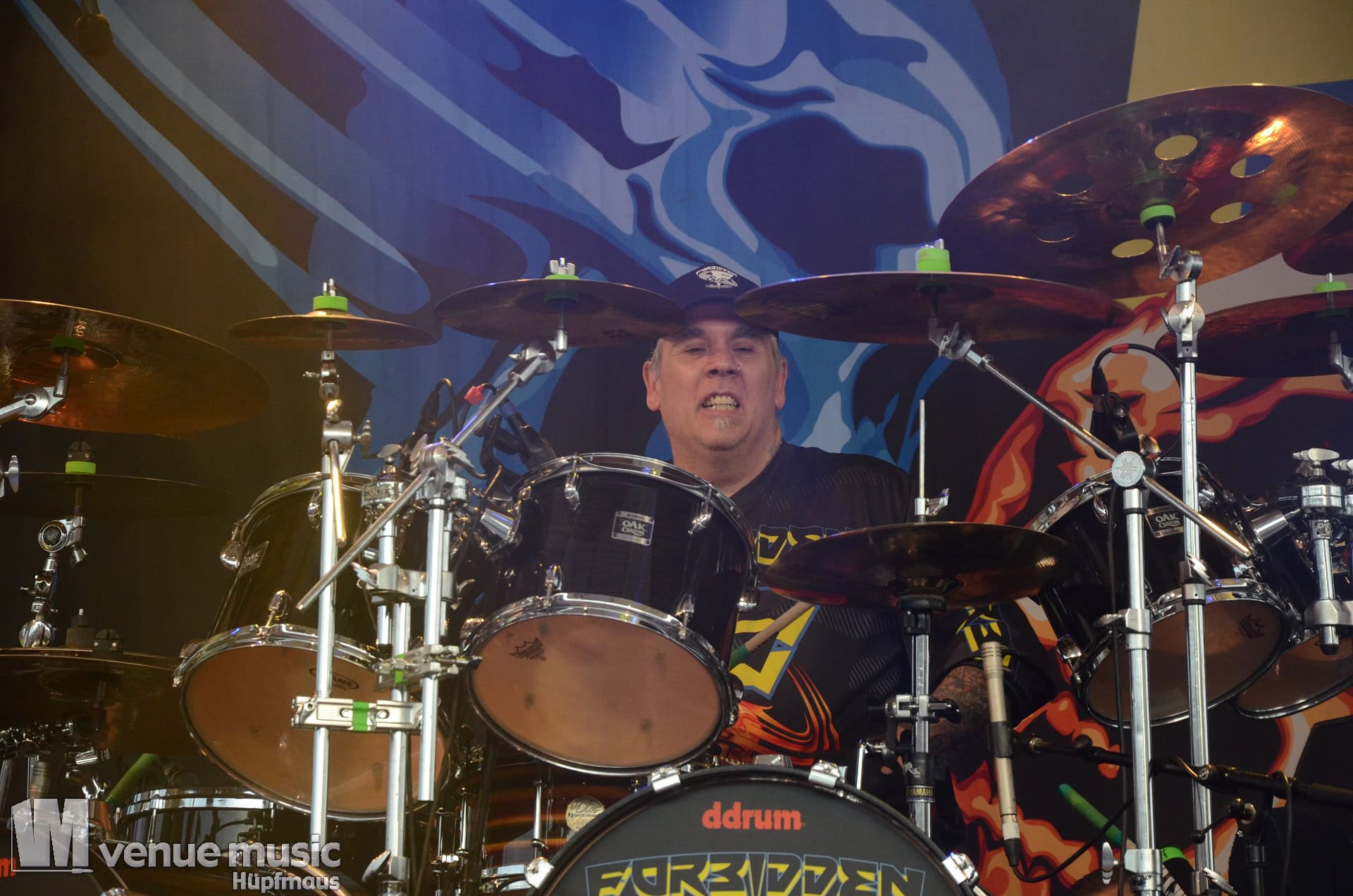 Als nächstes war dann eine der Bands dran, auf die wir uns sehr gefreut hatten: Forbidden. Grade erst wieder aktiv und mit zwei frischen Kräften an Drums und Vocals gaben sie auf der Bühne so richtig Gas. Thrash Metal aus der Bay Area vom Feinsten! Gelten doch auch ihre ersten beiden Alben „Forbidden Evil“ und „Twisted into Form“ aus den Jahren 1988 bzw. 1990 als Genre-Klassiker. Spätestens jetzt gab es im Publikum kein Halten mehr, das Amphitheater wurde zum Hexenkessel und die Graben-Security hatte ihre Mühe mit den Crowdsurfern. Denn leider muss man sagen, waren das auch alles keine Graben-Spezialisten um es mal gelinde auszudrücken. Glücklicherweise gab es bei den meisten Bands kaum Crowdsurfer. Doch hier mussten sie richtig ran.
