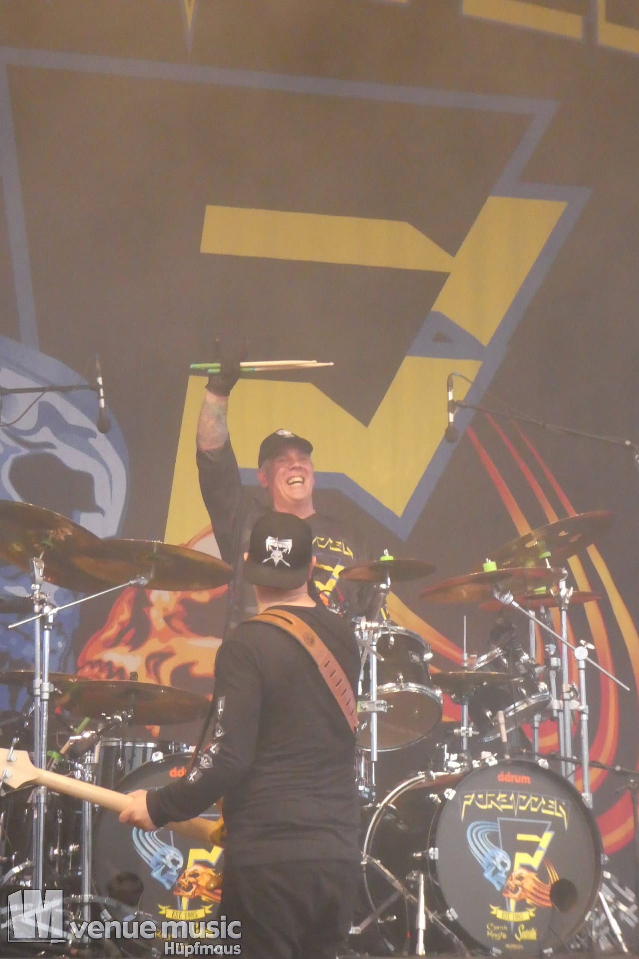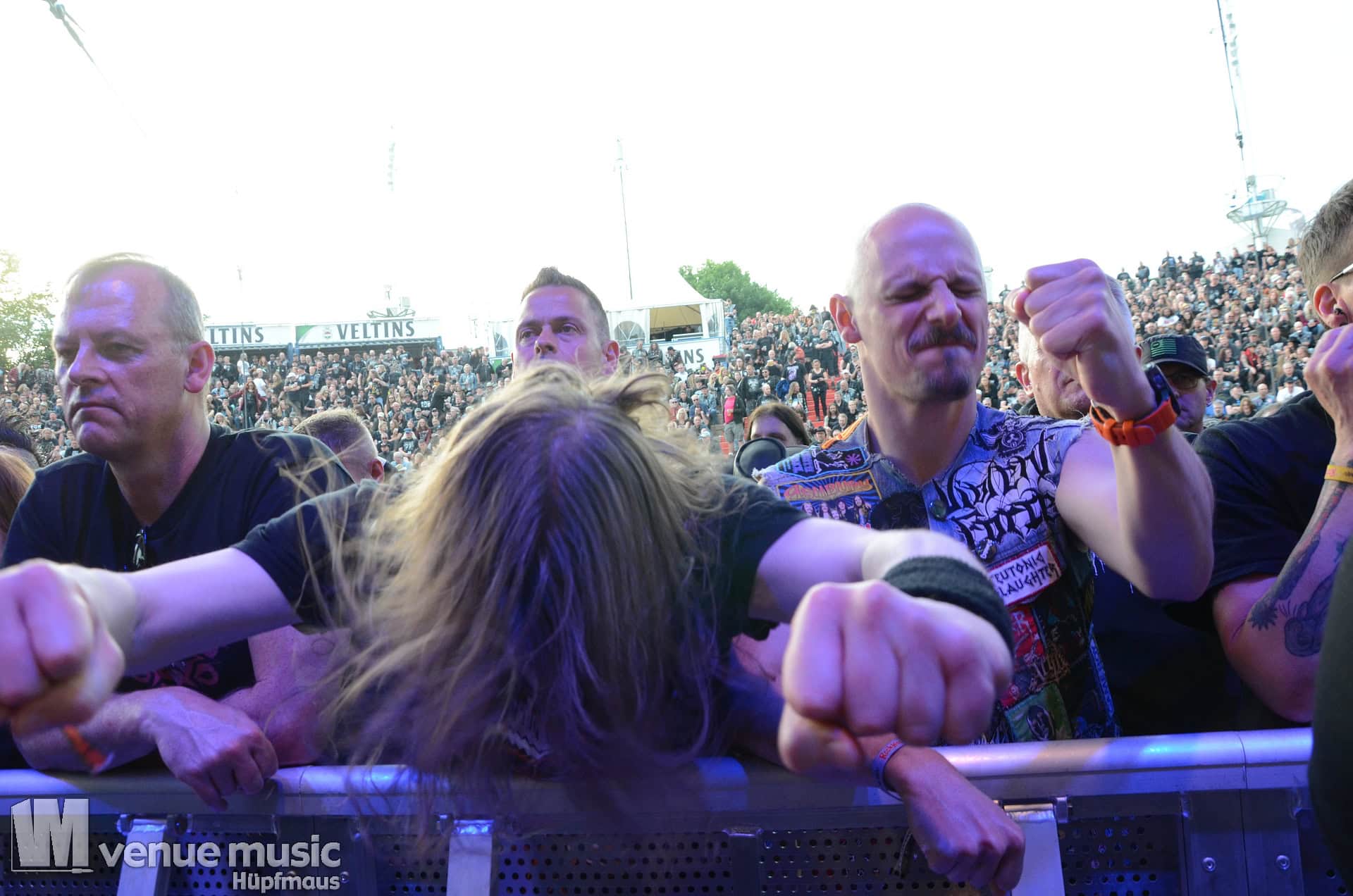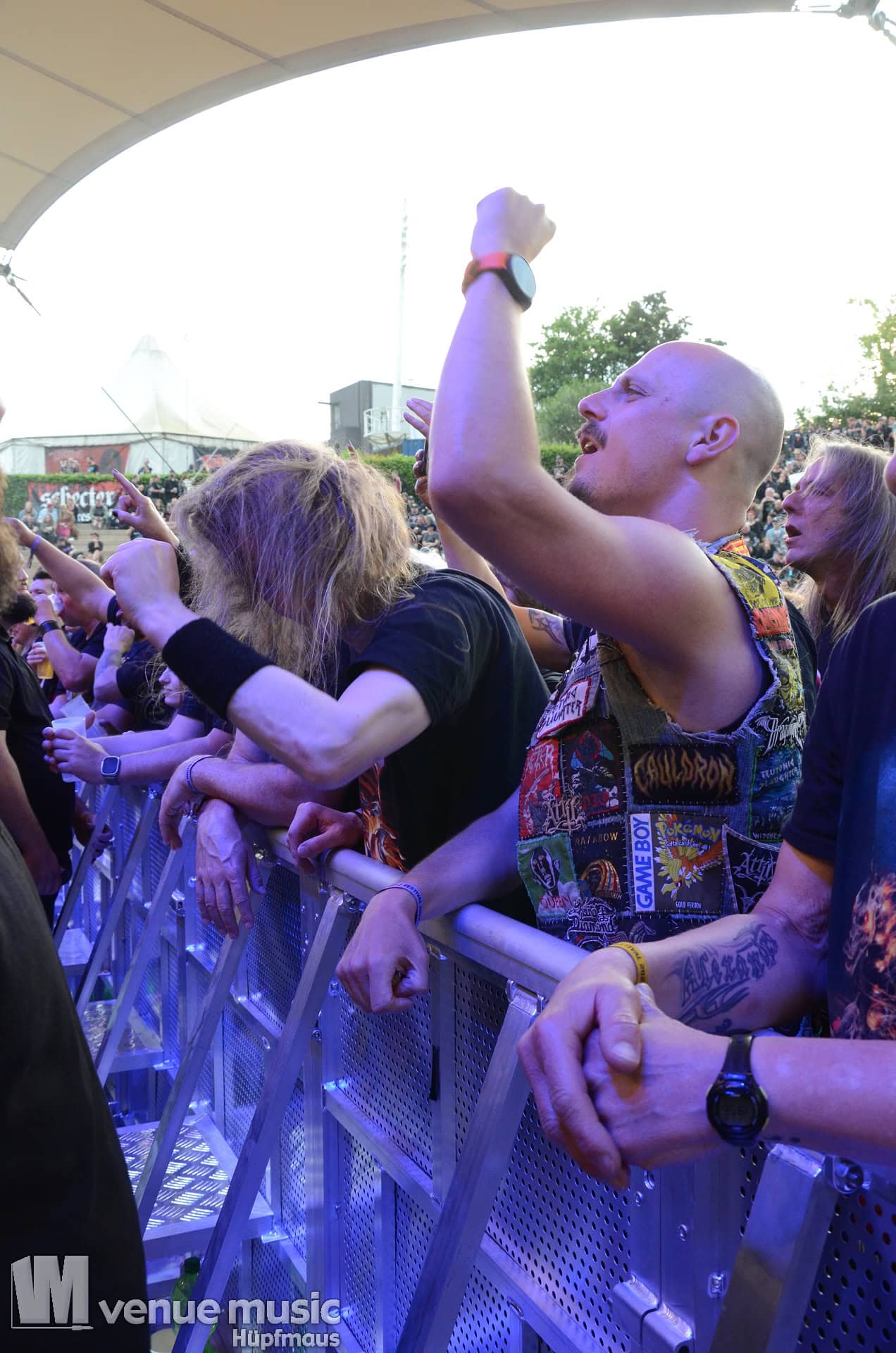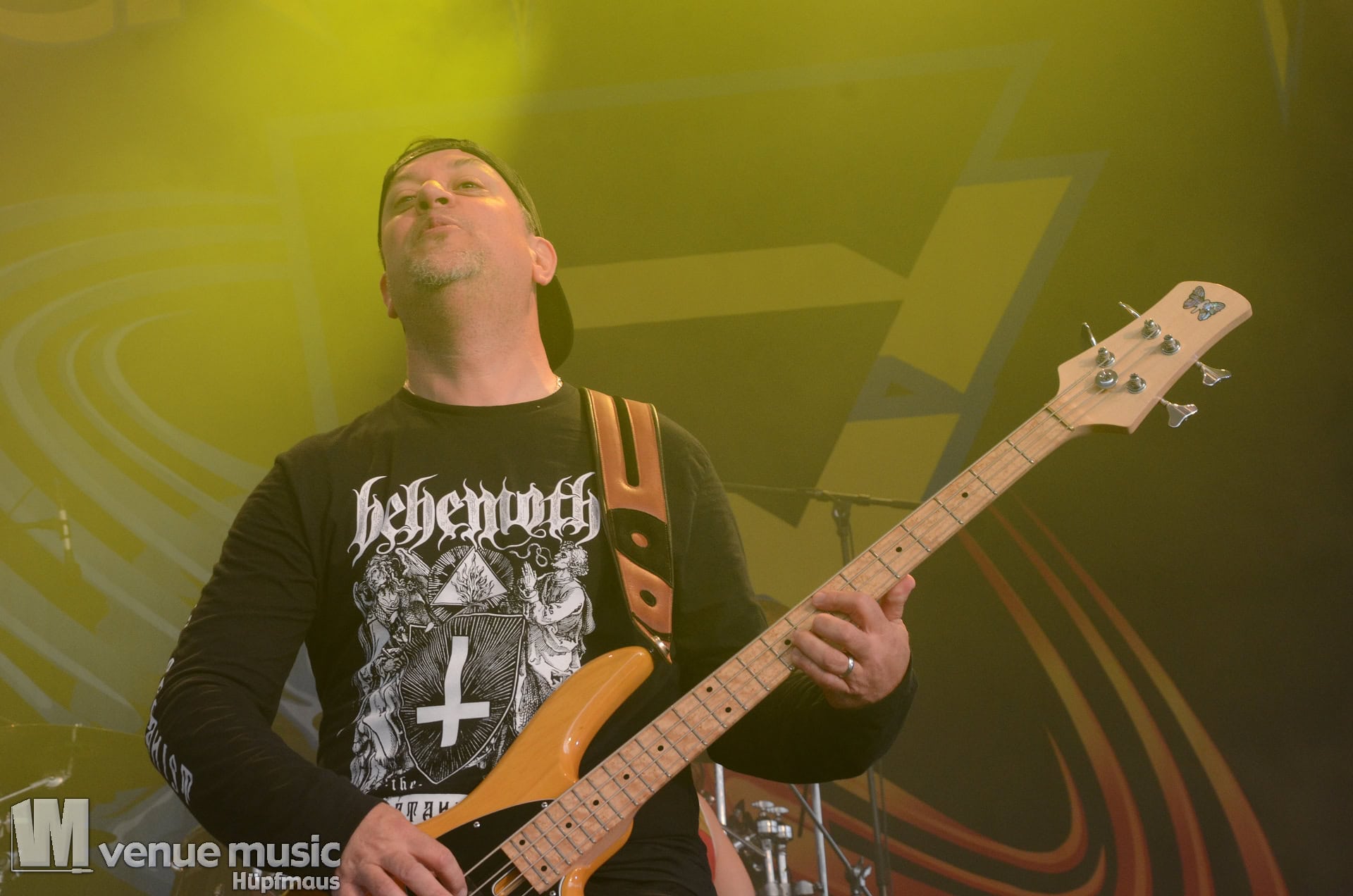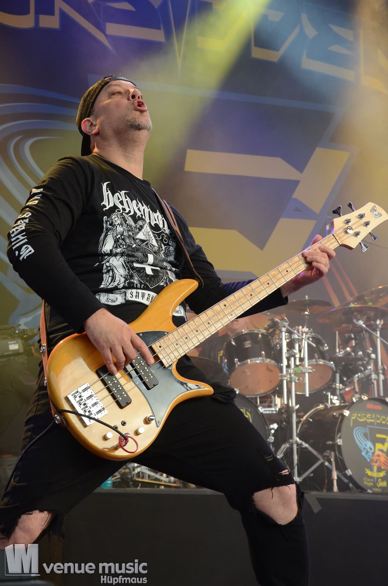 Als nächstes war dann eine der Bands dran, auf die wir uns sehr gefreut hatten: Forbidden. Grade erst wieder aktiv und mit zwei frischen Kräften an Drums und Vocals gaben sie auf der Bühne so richtig Gas. Thrash Metal aus der Bay Area vom Feinsten! Gelten doch auch ihre ersten beiden Alben „Forbidden Evil“ und „Twisted into Form“ aus den Jahren 1988 bzw. 1990 als Genre-Klassiker. Spätestens jetzt gab es im Publikum kein Halten mehr, das Amphitheater wurde zum Hexenkessel und die Graben-Security hatte ihre Mühe mit den Crowdsurfern. Denn leider muss man sagen, waren das auch alles keine Graben-Spezialisten um es mal gelinde auszudrücken. Glücklicherweise gab es bei den meisten Bands kaum Crowdsurfer. Doch hier mussten sie richtig ran.