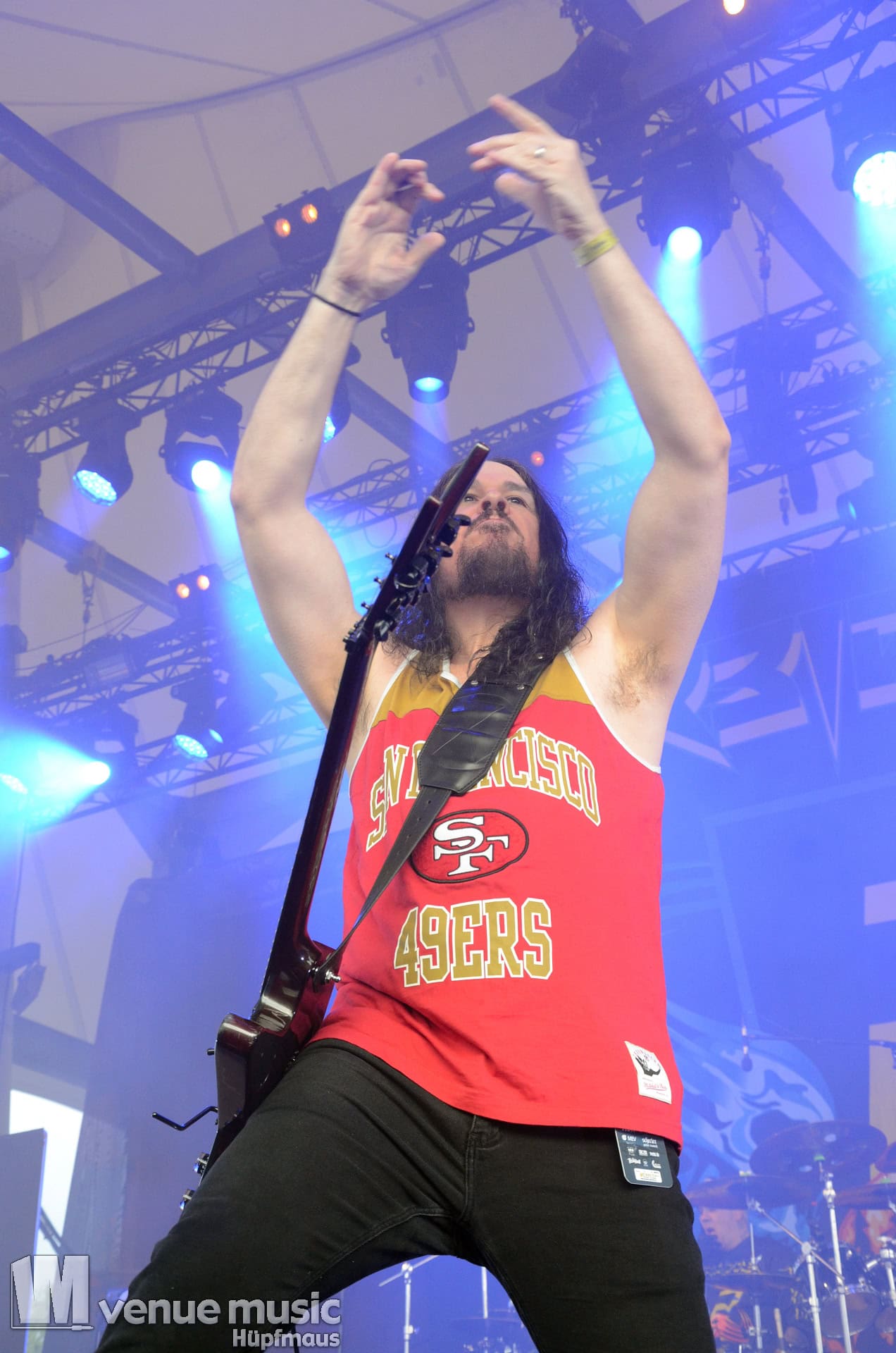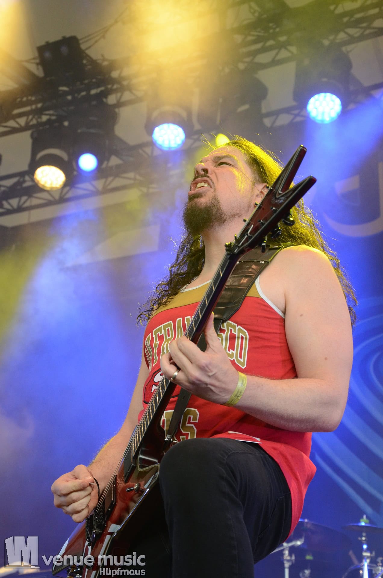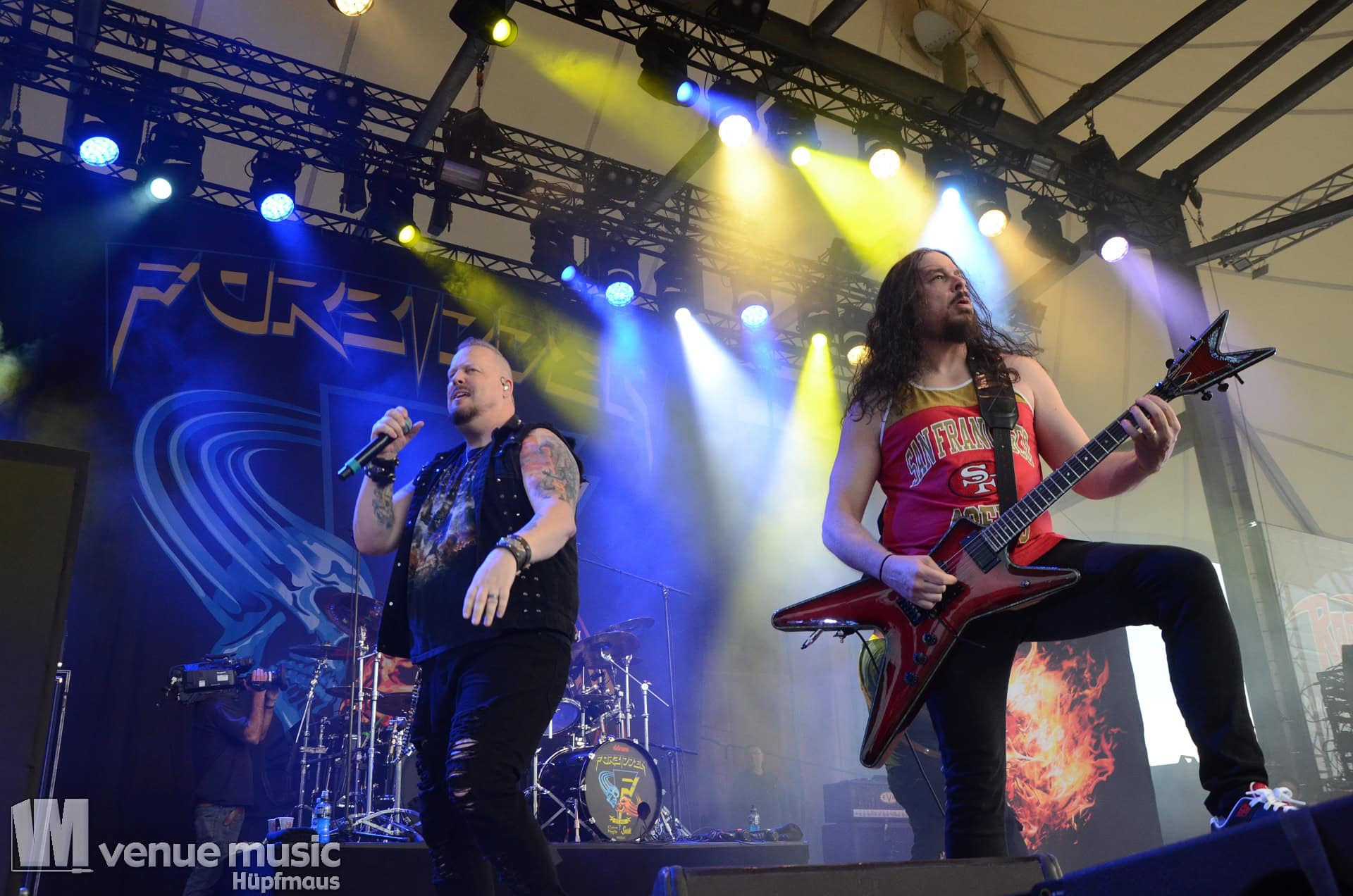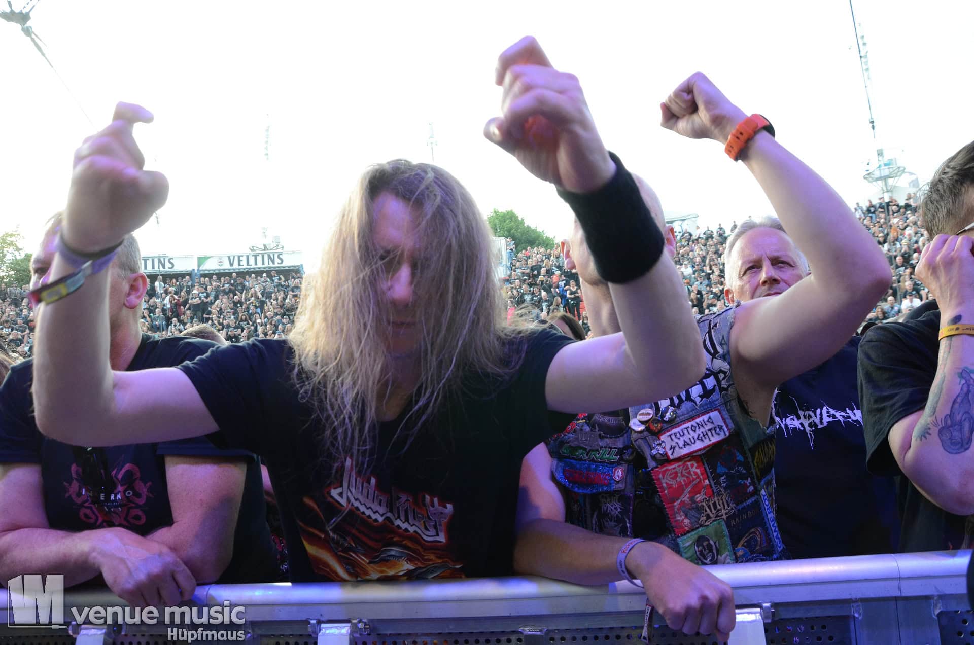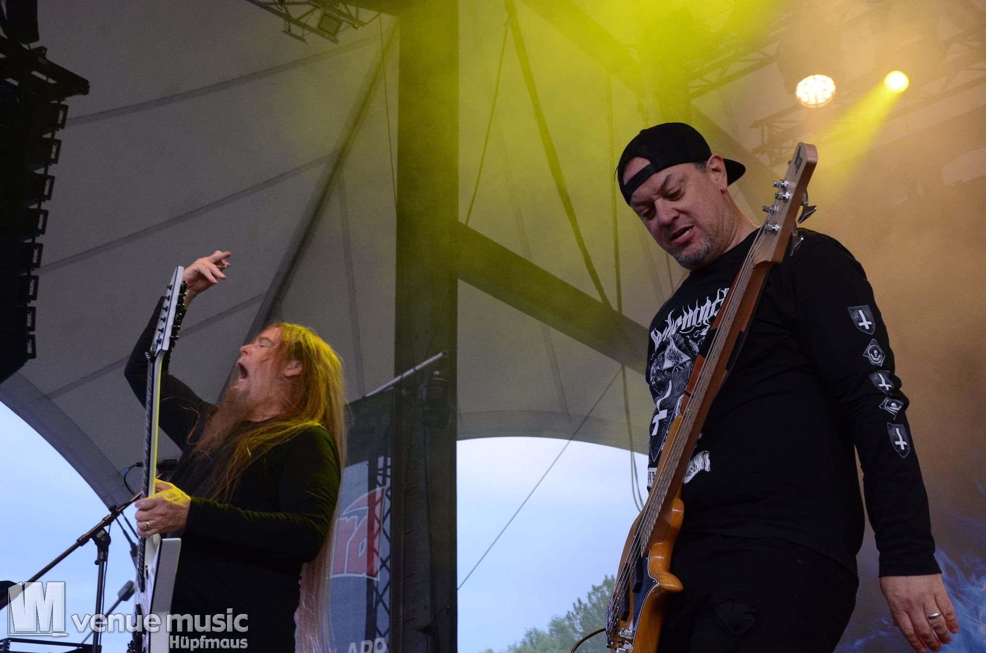 Als nächstes war dann eine der Bands dran, auf die wir uns sehr gefreut hatten: Forbidden. Grade erst wieder aktiv und mit zwei frischen Kräften an Drums und Vocals gaben sie auf der Bühne so richtig Gas. Thrash Metal aus der Bay Area vom Feinsten! Gelten doch auch ihre ersten beiden Alben „Forbidden Evil“ und „Twisted into Form“ aus den Jahren 1988 bzw. 1990 als Genre-Klassiker. Spätestens jetzt gab es im Publikum kein Halten mehr, das Amphitheater wurde zum Hexenkessel und die Graben-Security hatte ihre Mühe mit den Crowdsurfern. Denn leider muss man sagen, waren das auch alles keine Graben-Spezialisten um es mal gelinde auszudrücken. Glücklicherweise gab es bei den meisten Bands kaum Crowdsurfer. Doch hier mussten sie richtig ran.
