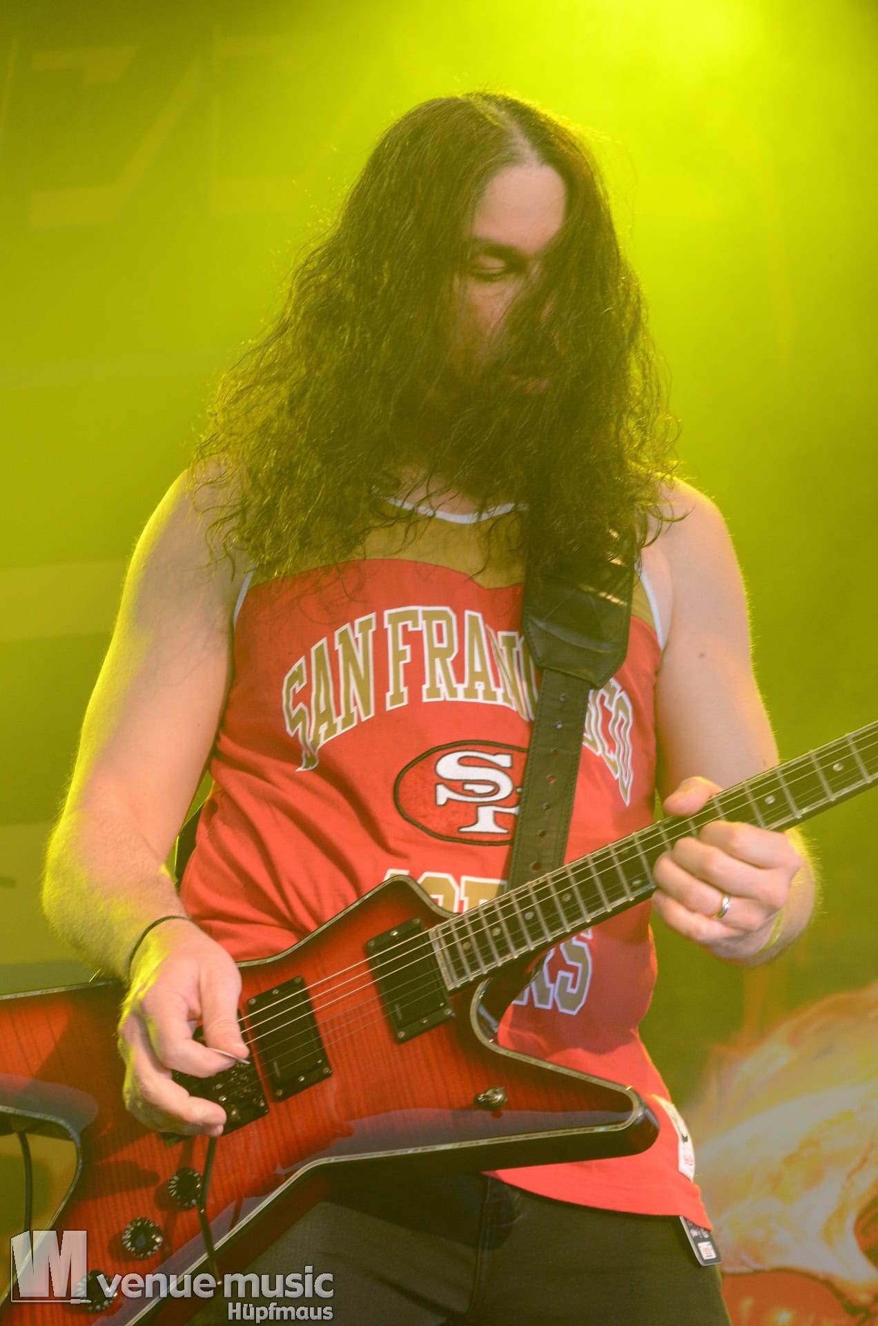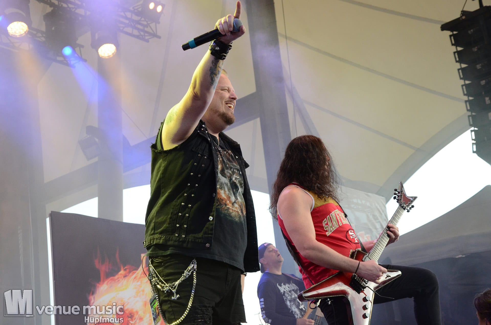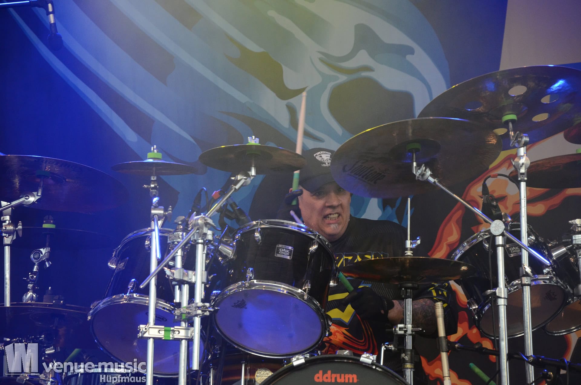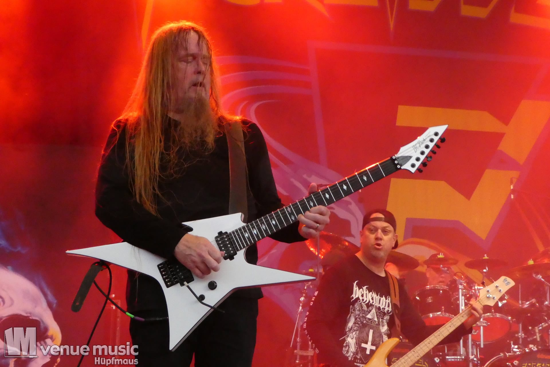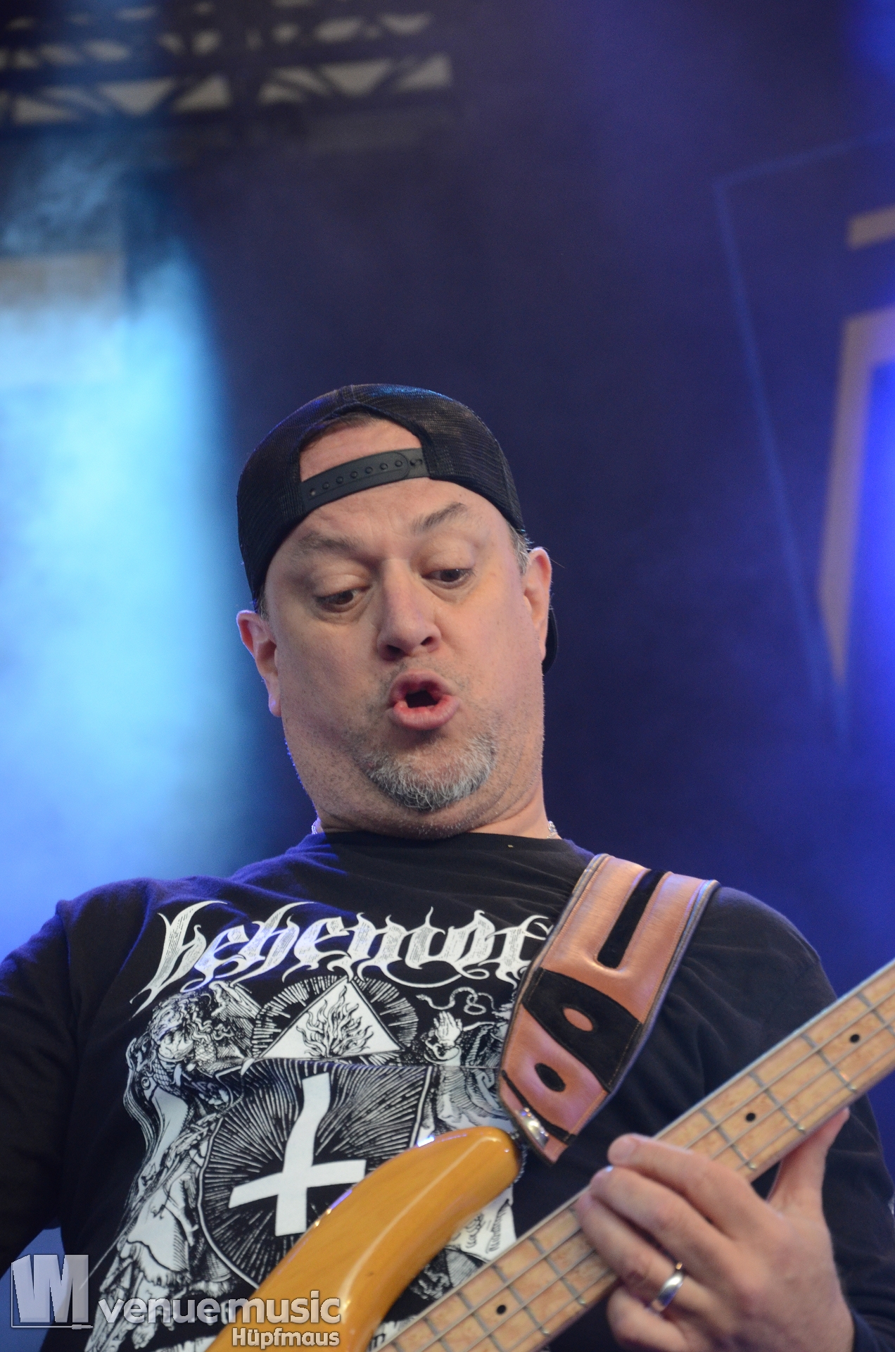 Als nächstes war dann eine der Bands dran, auf die wir uns sehr gefreut hatten: Forbidden. Grade erst wieder aktiv und mit zwei frischen Kräften an Drums und Vocals gaben sie auf der Bühne so richtig Gas. Thrash Metal aus der Bay Area vom Feinsten! Gelten doch auch ihre ersten beiden Alben „Forbidden Evil“ und „Twisted into Form“ aus den Jahren 1988 bzw. 1990 als Genre-Klassiker. Spätestens jetzt gab es im Publikum kein Halten mehr, das Amphitheater wurde zum Hexenkessel und die Graben-Security hatte ihre Mühe mit den Crowdsurfern. Denn leider muss man sagen, waren das auch alles keine Graben-Spezialisten um es mal gelinde auszudrücken. Glücklicherweise gab es bei den meisten Bands kaum Crowdsurfer. Doch hier mussten sie richtig ran.