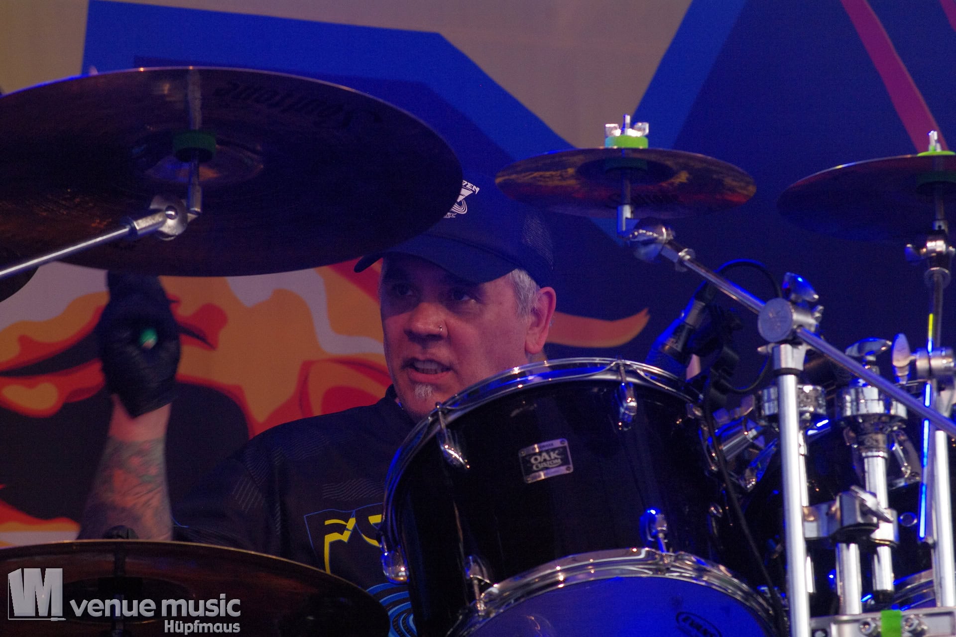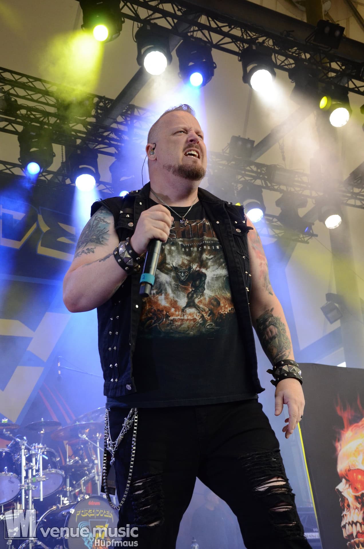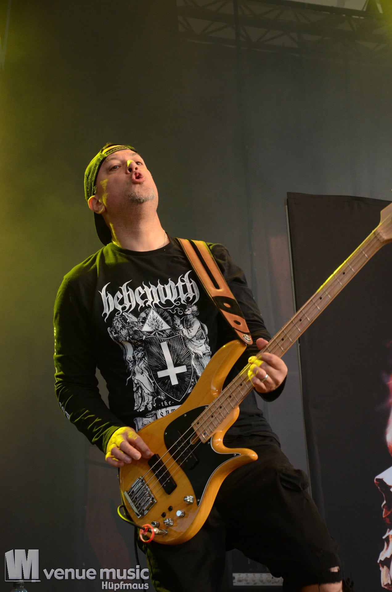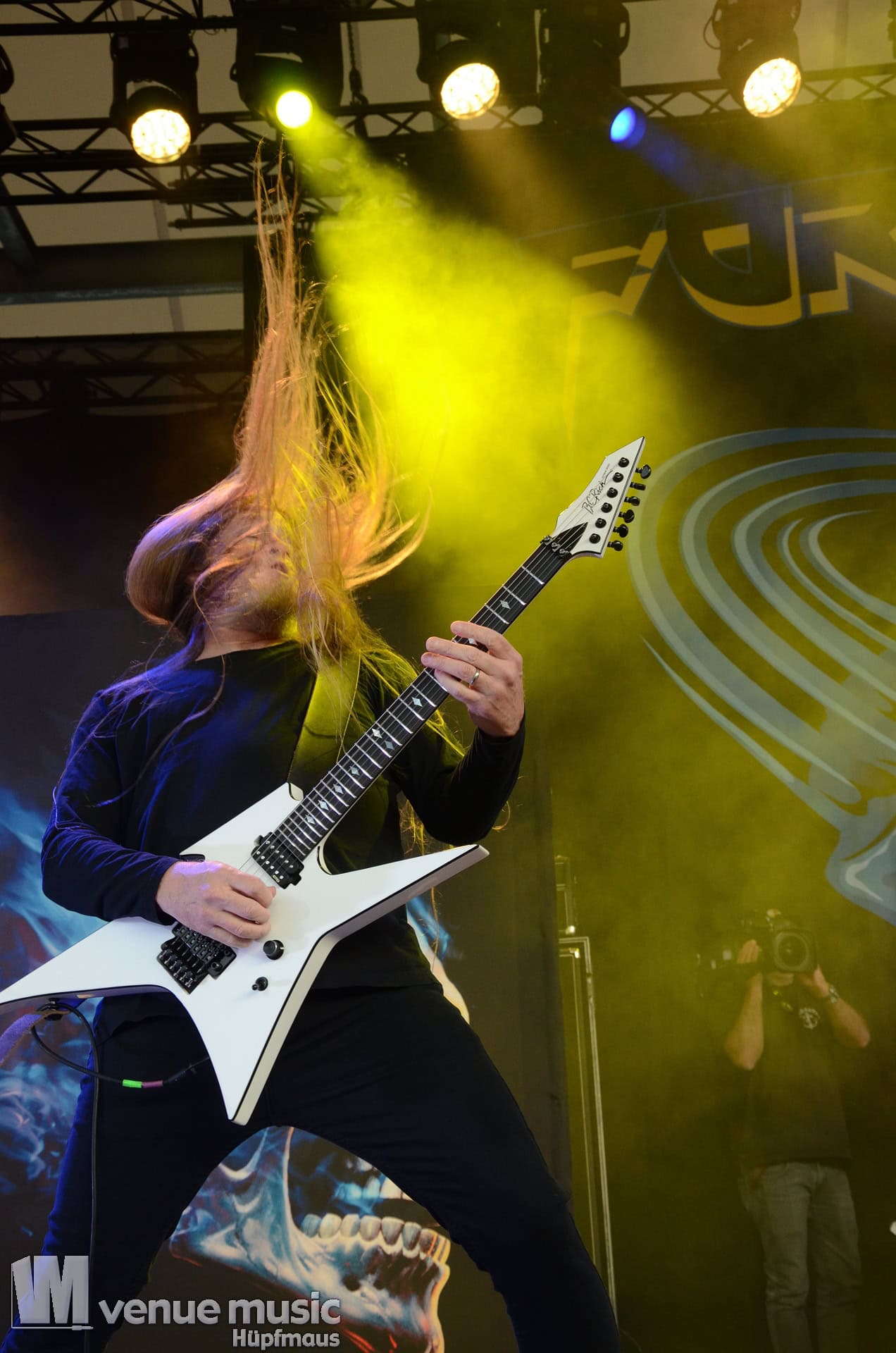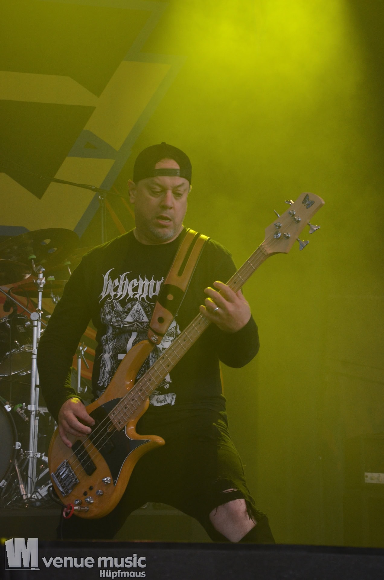 Als nächstes war dann eine der Bands dran, auf die wir uns sehr gefreut hatten: Forbidden. Grade erst wieder aktiv und mit zwei frischen Kräften an Drums und Vocals gaben sie auf der Bühne so richtig Gas. Thrash Metal aus der Bay Area vom Feinsten! Gelten doch auch ihre ersten beiden Alben „Forbidden Evil“ und „Twisted into Form“ aus den Jahren 1988 bzw. 1990 als Genre-Klassiker. Spätestens jetzt gab es im Publikum kein Halten mehr, das Amphitheater wurde zum Hexenkessel und die Graben-Security hatte ihre Mühe mit den Crowdsurfern. Denn leider muss man sagen, waren das auch alles keine Graben-Spezialisten um es mal gelinde auszudrücken. Glücklicherweise gab es bei den meisten Bands kaum Crowdsurfer. Doch hier mussten sie richtig ran.