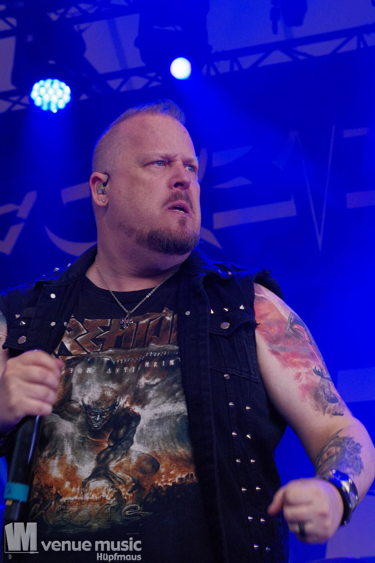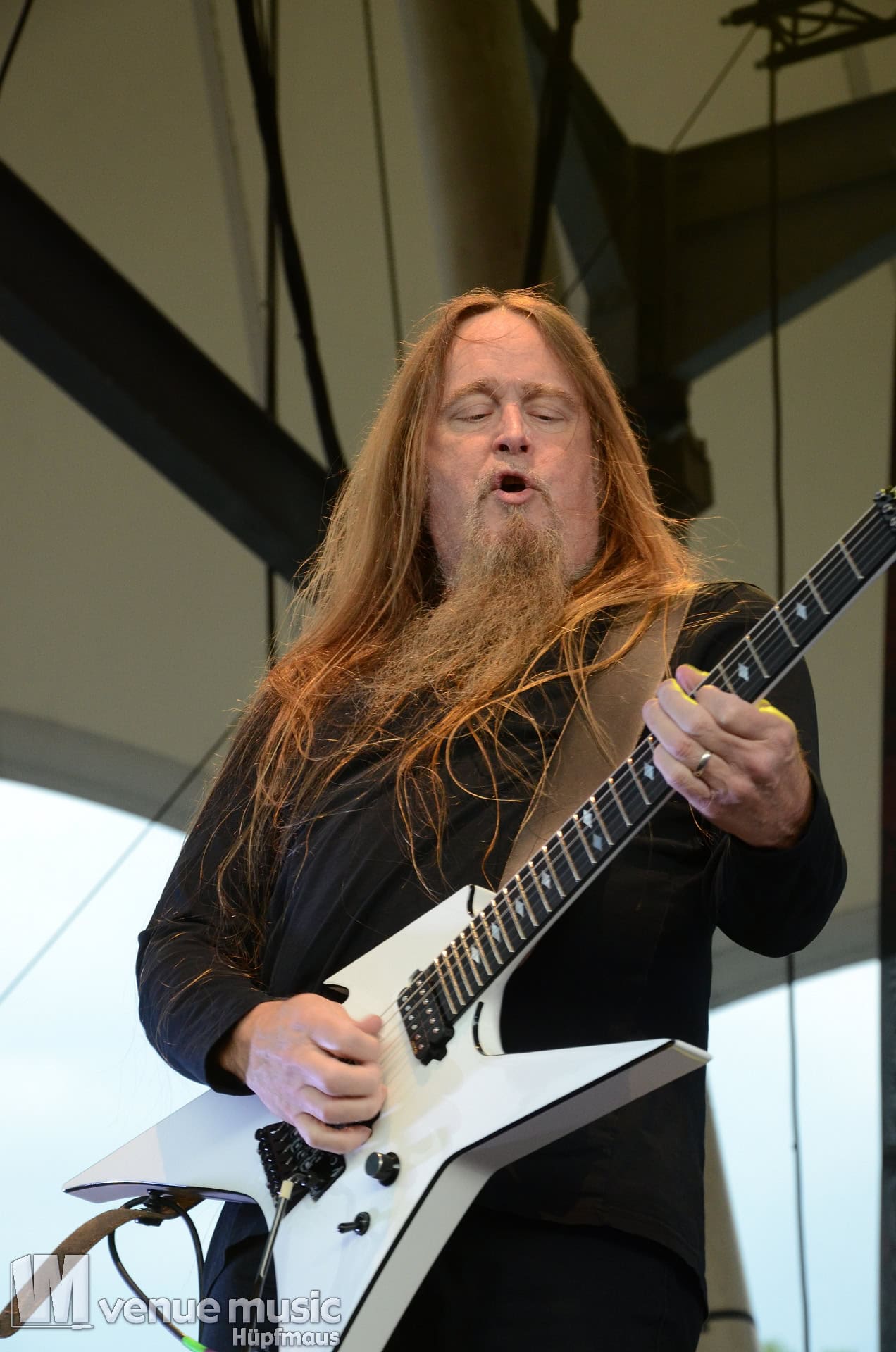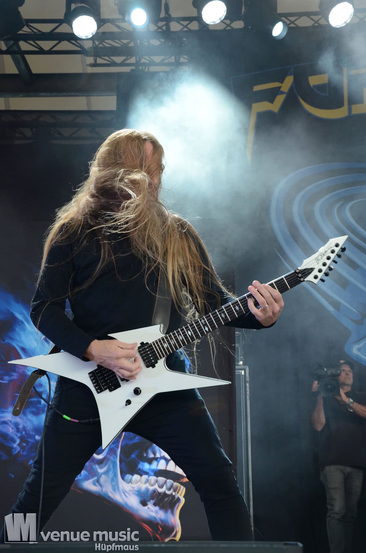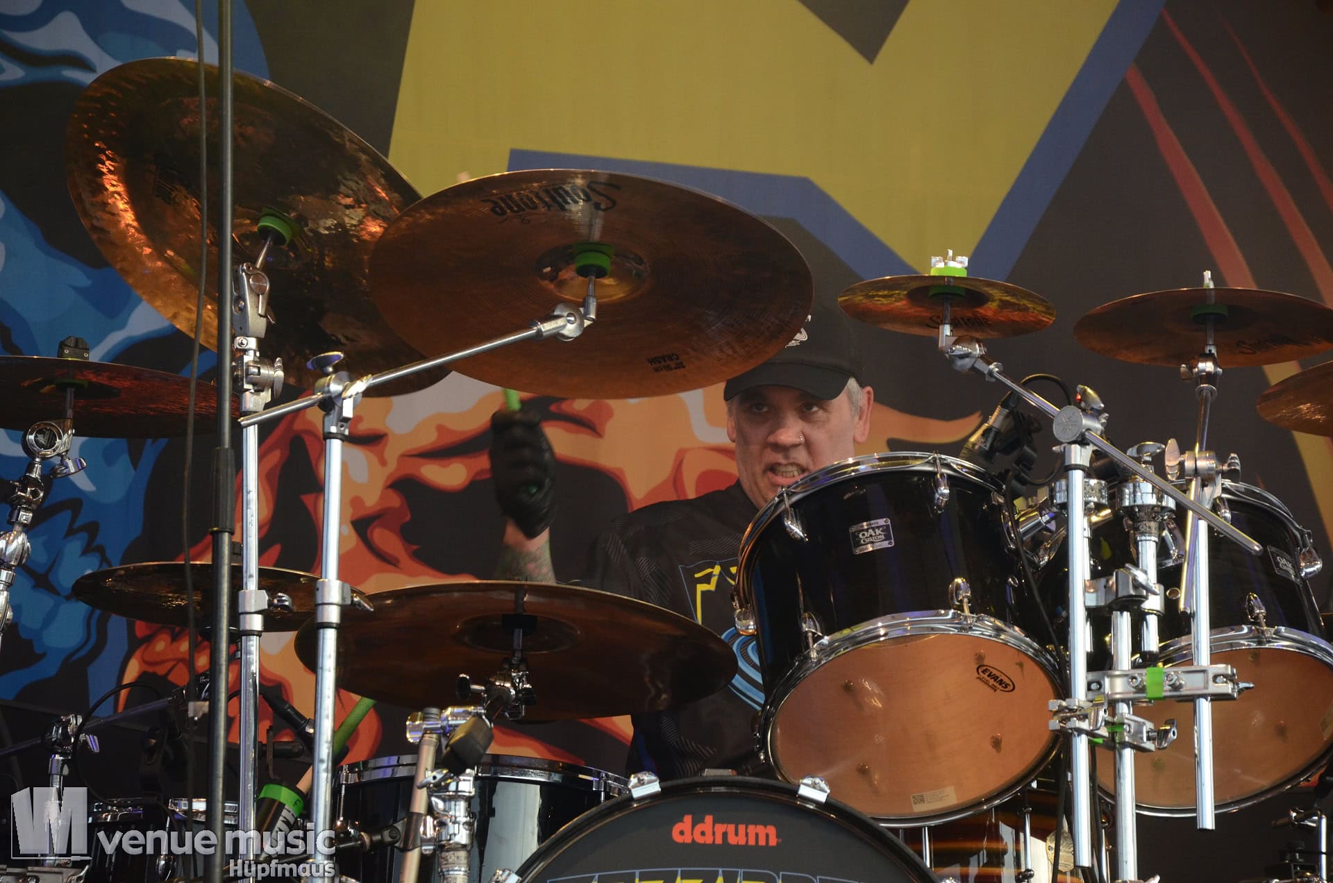 Als nächstes war dann eine der Bands dran, auf die wir uns sehr gefreut hatten: Forbidden. Grade erst wieder aktiv und mit zwei frischen Kräften an Drums und Vocals gaben sie auf der Bühne so richtig Gas. Thrash Metal aus der Bay Area vom Feinsten! Gelten doch auch ihre ersten beiden Alben „Forbidden Evil“ und „Twisted into Form“ aus den Jahren 1988 bzw. 1990 als Genre-Klassiker. Spätestens jetzt gab es im Publikum kein Halten mehr, das Amphitheater wurde zum Hexenkessel und die Graben-Security hatte ihre Mühe mit den Crowdsurfern. Denn leider muss man sagen, waren das auch alles keine Graben-Spezialisten um es mal gelinde auszudrücken. Glücklicherweise gab es bei den meisten Bands kaum Crowdsurfer. Doch hier mussten sie richtig ran.