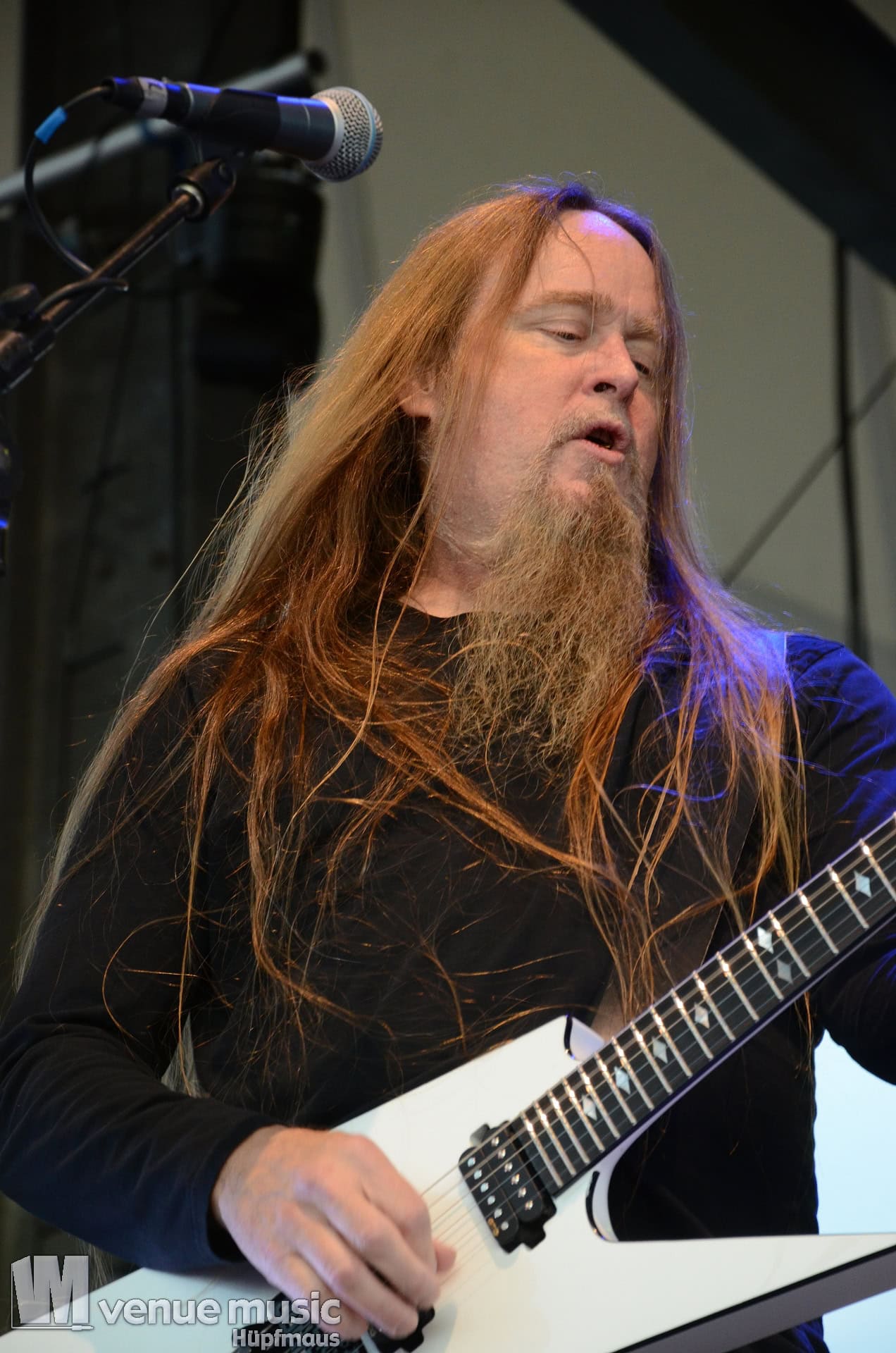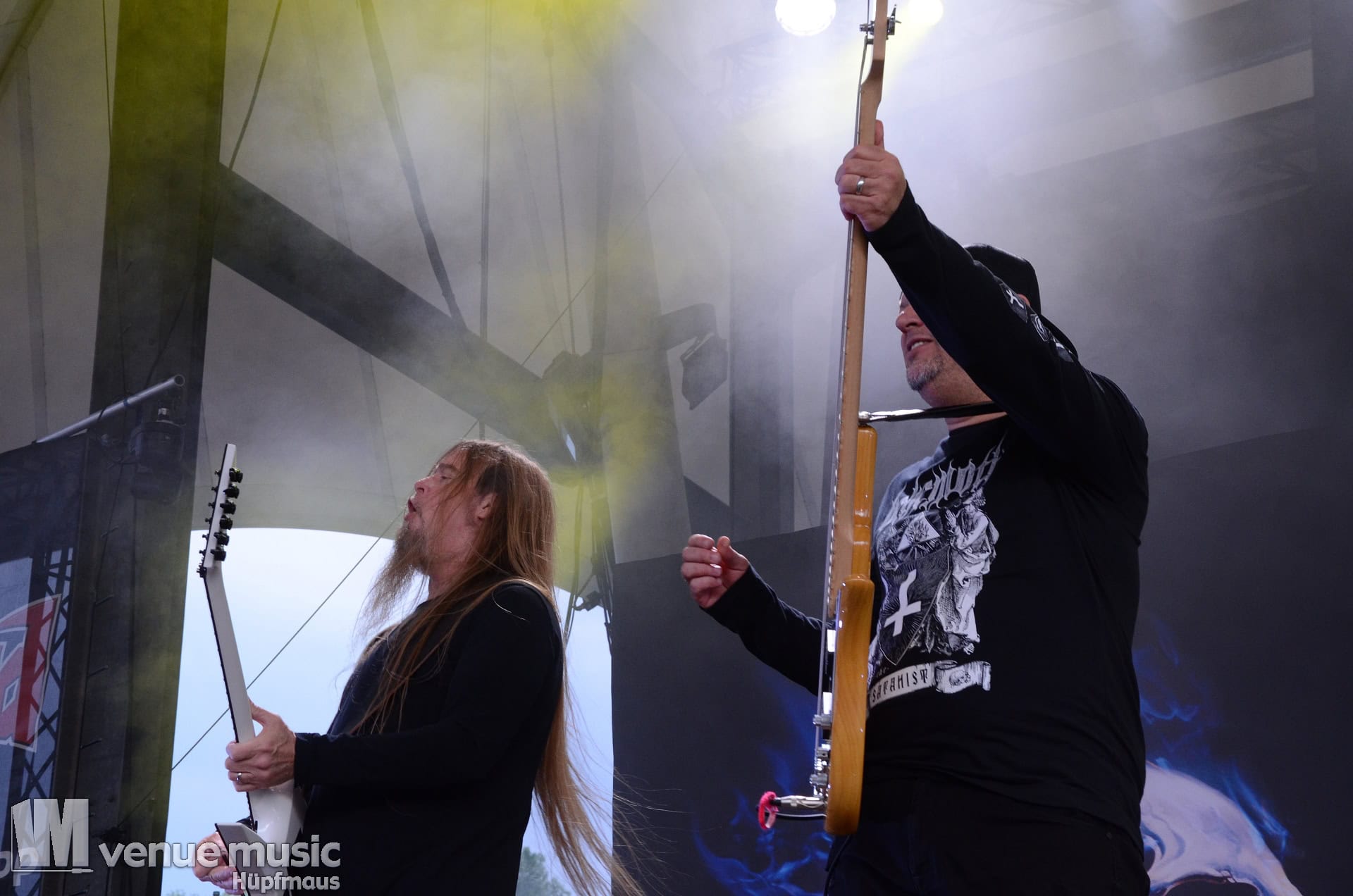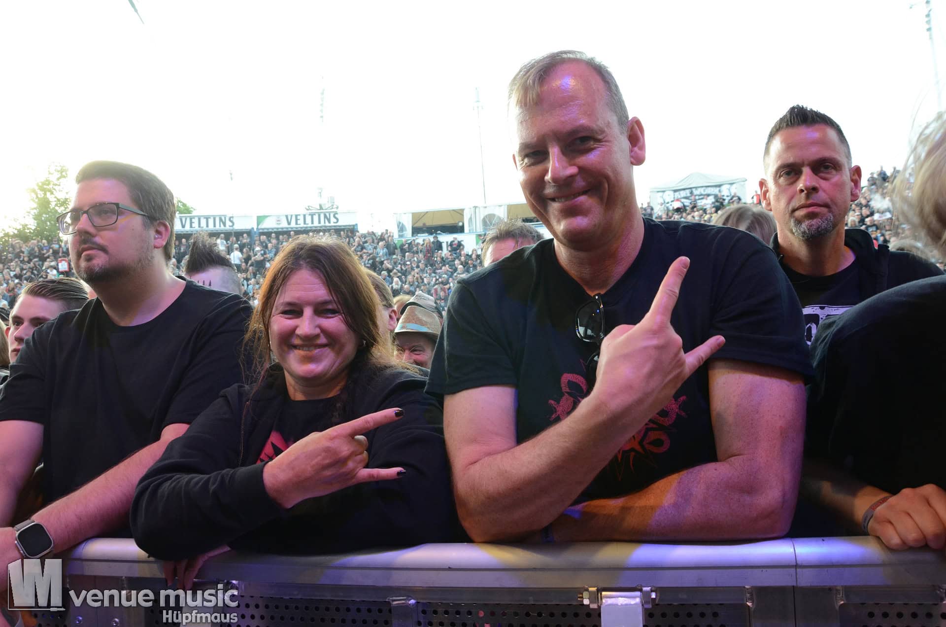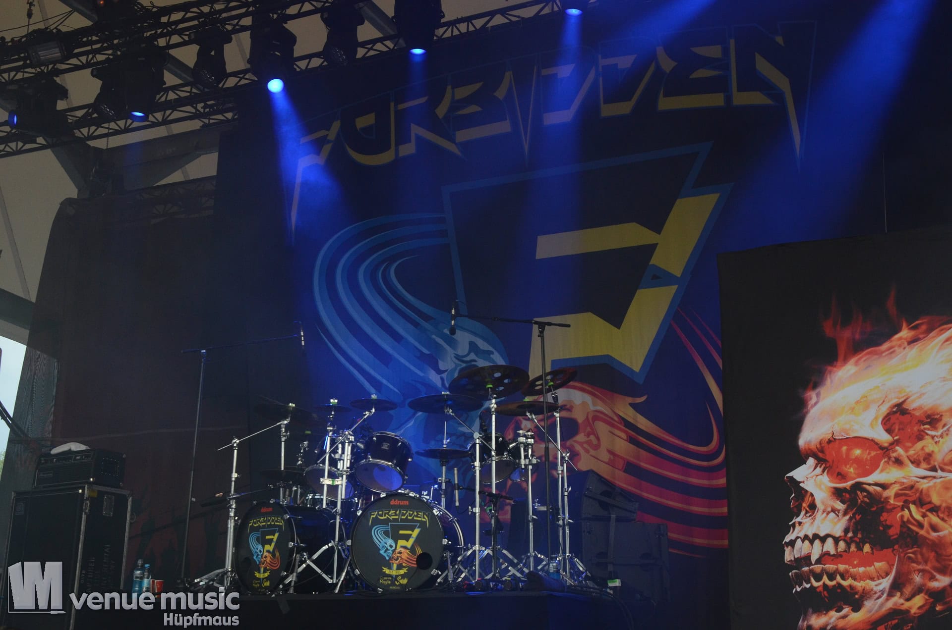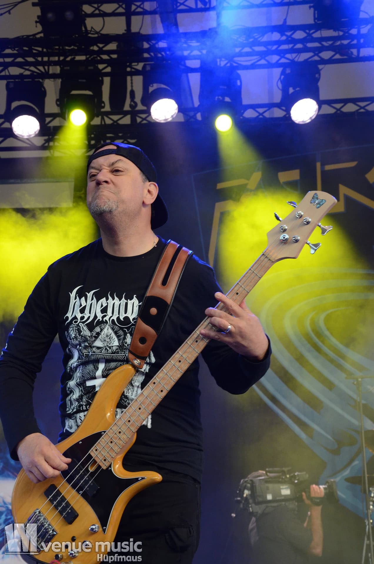 Als nächstes war dann eine der Bands dran, auf die wir uns sehr gefreut hatten: Forbidden. Grade erst wieder aktiv und mit zwei frischen Kräften an Drums und Vocals gaben sie auf der Bühne so richtig Gas. Thrash Metal aus der Bay Area vom Feinsten! Gelten doch auch ihre ersten beiden Alben „Forbidden Evil“ und „Twisted into Form“ aus den Jahren 1988 bzw. 1990 als Genre-Klassiker. Spätestens jetzt gab es im Publikum kein Halten mehr, das Amphitheater wurde zum Hexenkessel und die Graben-Security hatte ihre Mühe mit den Crowdsurfern. Denn leider muss man sagen, waren das auch alles keine Graben-Spezialisten um es mal gelinde auszudrücken. Glücklicherweise gab es bei den meisten Bands kaum Crowdsurfer. Doch hier mussten sie richtig ran.