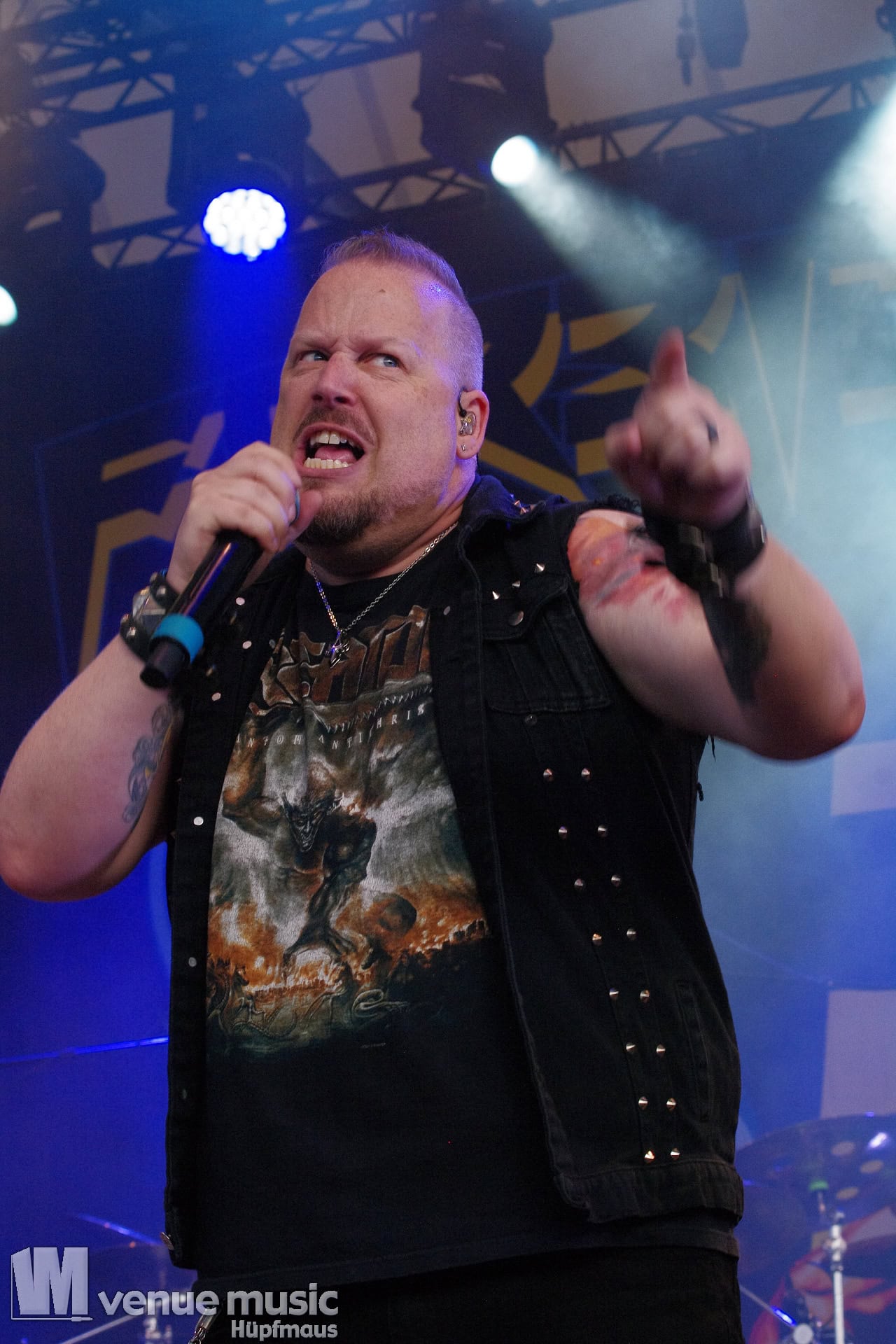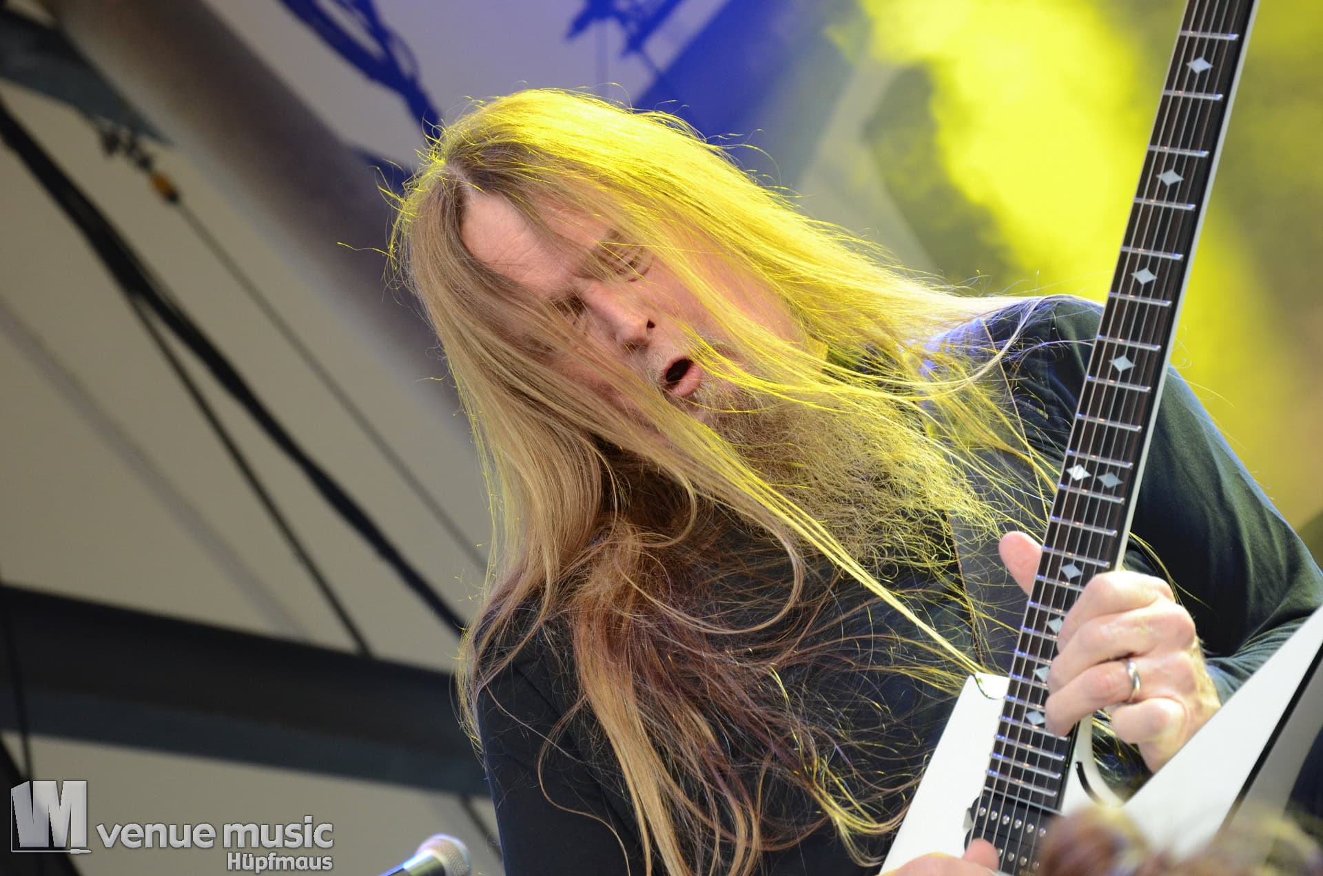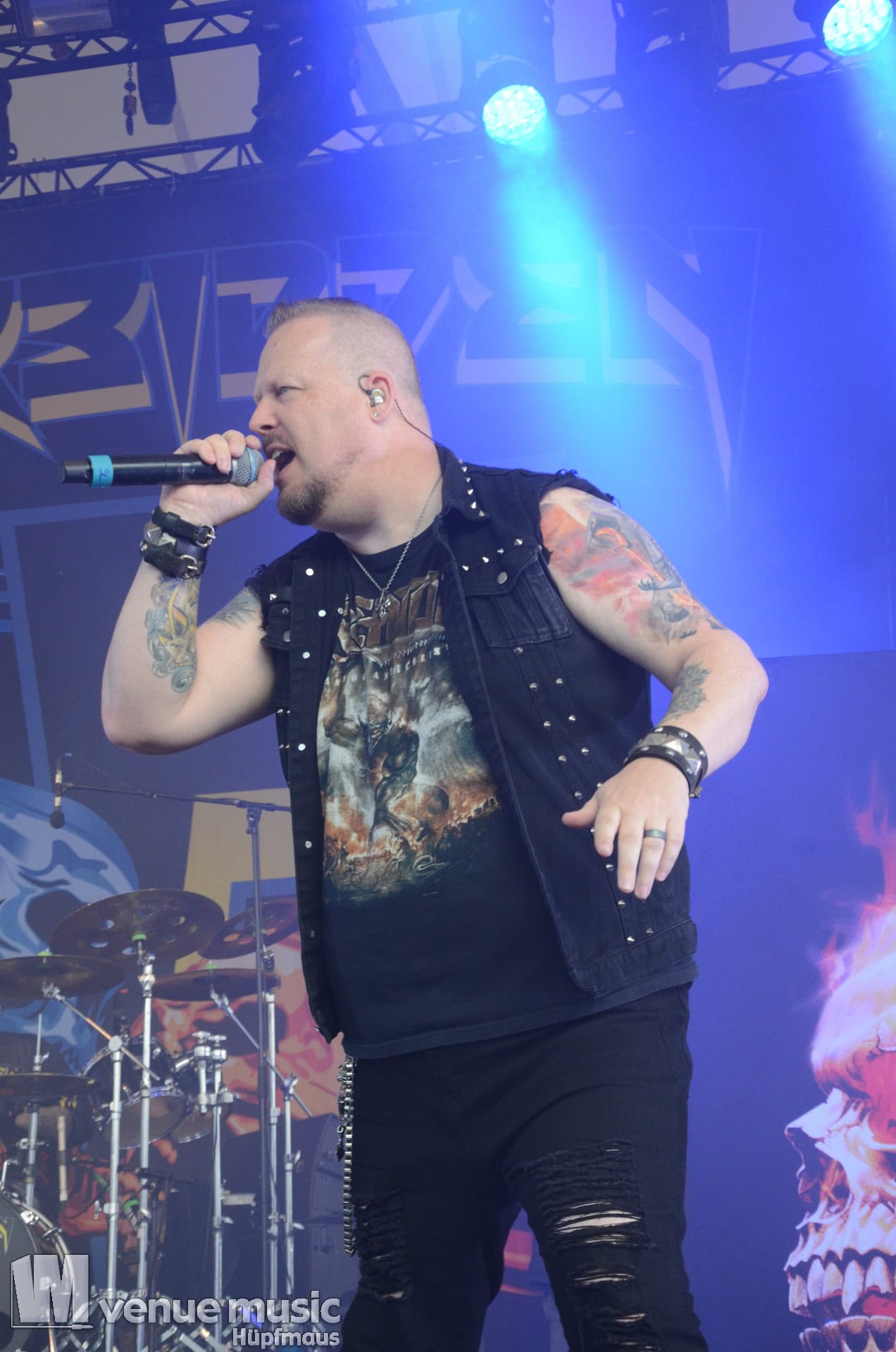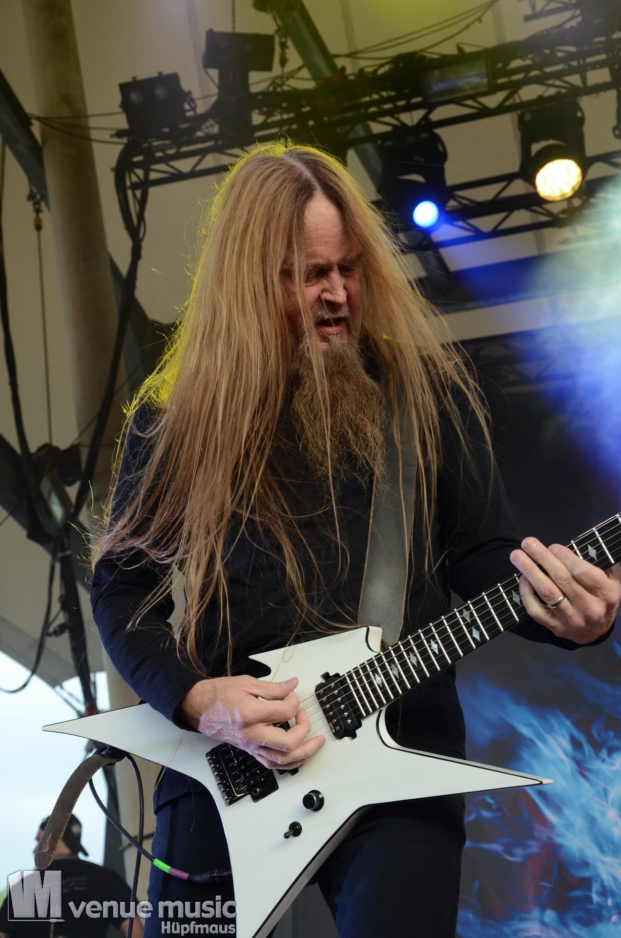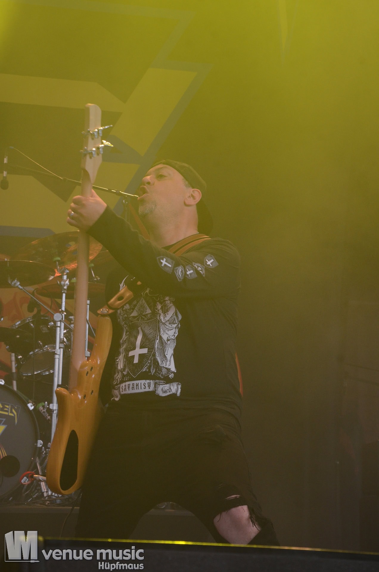 Als nächstes war dann eine der Bands dran, auf die wir uns sehr gefreut hatten: Forbidden. Grade erst wieder aktiv und mit zwei frischen Kräften an Drums und Vocals gaben sie auf der Bühne so richtig Gas. Thrash Metal aus der Bay Area vom Feinsten! Gelten doch auch ihre ersten beiden Alben „Forbidden Evil“ und „Twisted into Form“ aus den Jahren 1988 bzw. 1990 als Genre-Klassiker. Spätestens jetzt gab es im Publikum kein Halten mehr, das Amphitheater wurde zum Hexenkessel und die Graben-Security hatte ihre Mühe mit den Crowdsurfern. Denn leider muss man sagen, waren das auch alles keine Graben-Spezialisten um es mal gelinde auszudrücken. Glücklicherweise gab es bei den meisten Bands kaum Crowdsurfer. Doch hier mussten sie richtig ran.