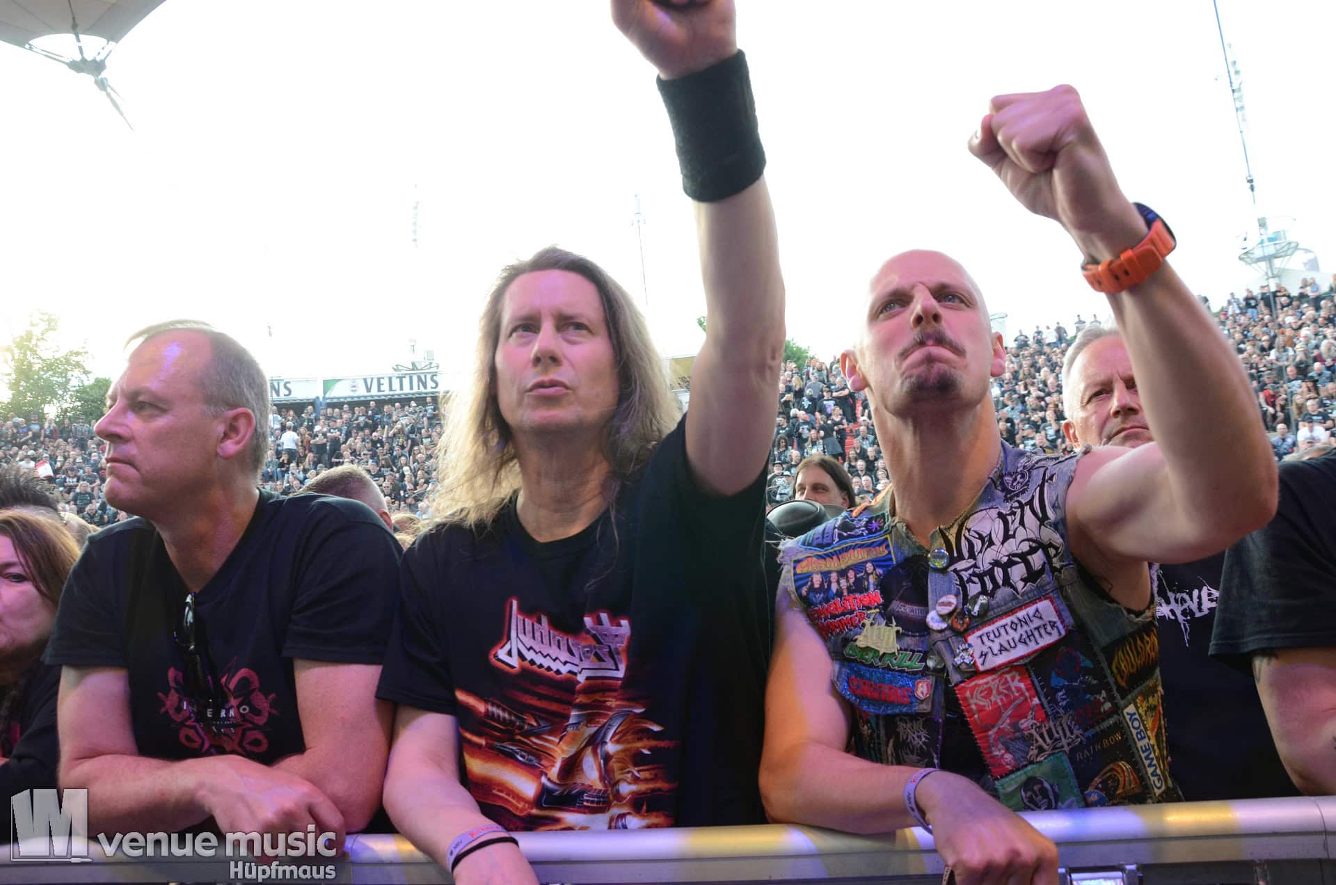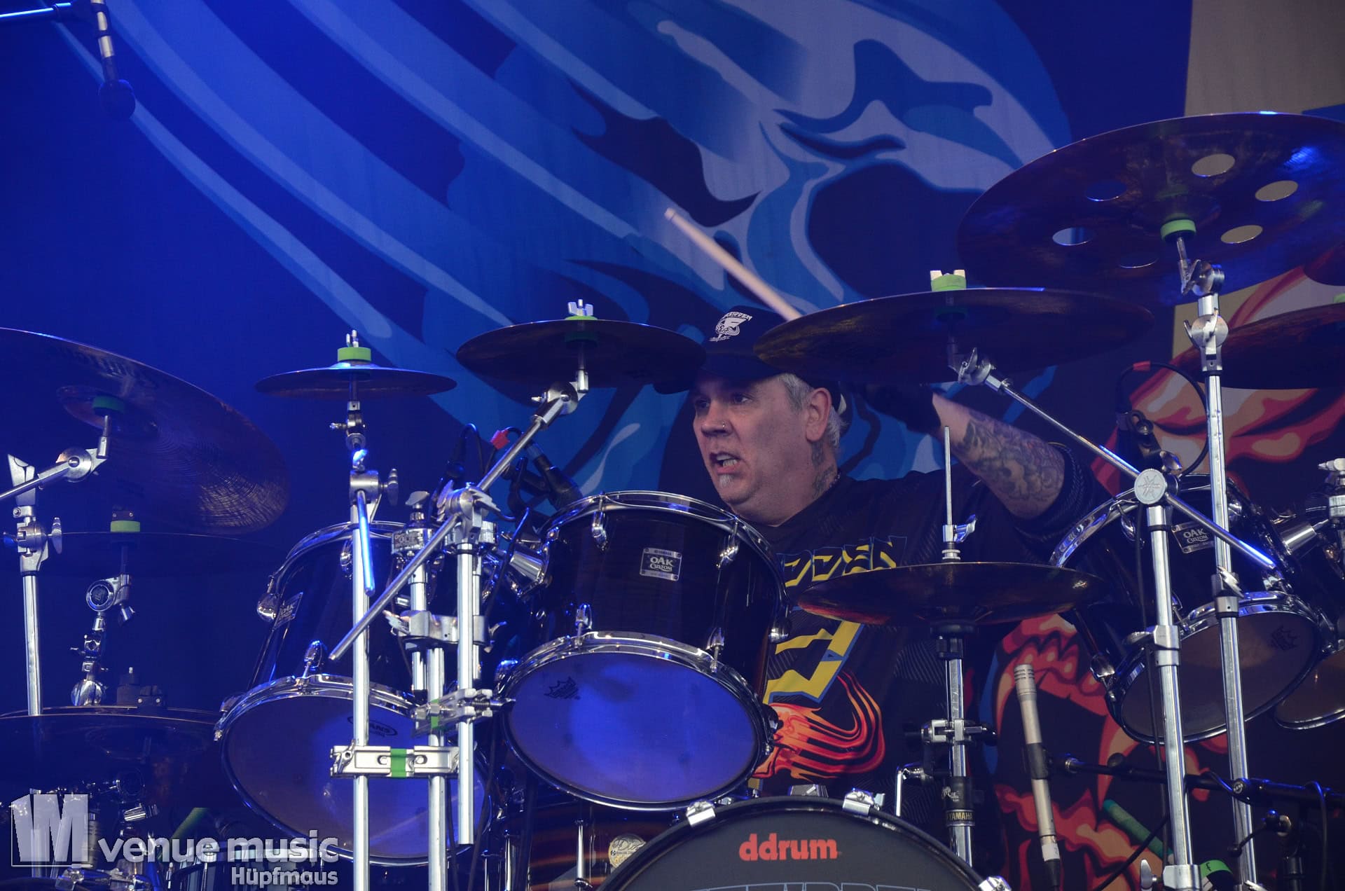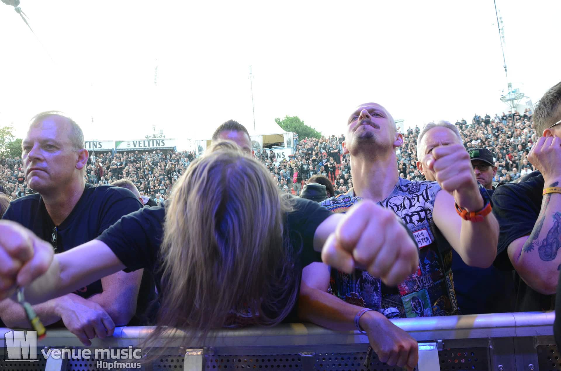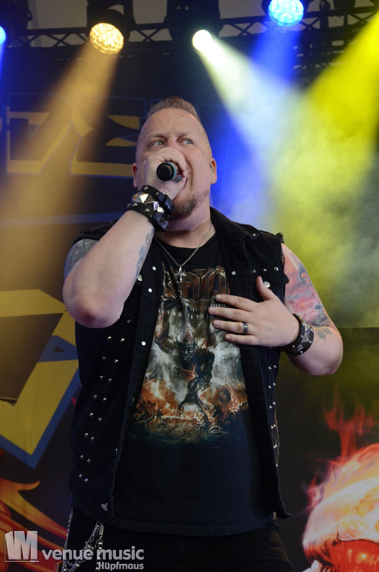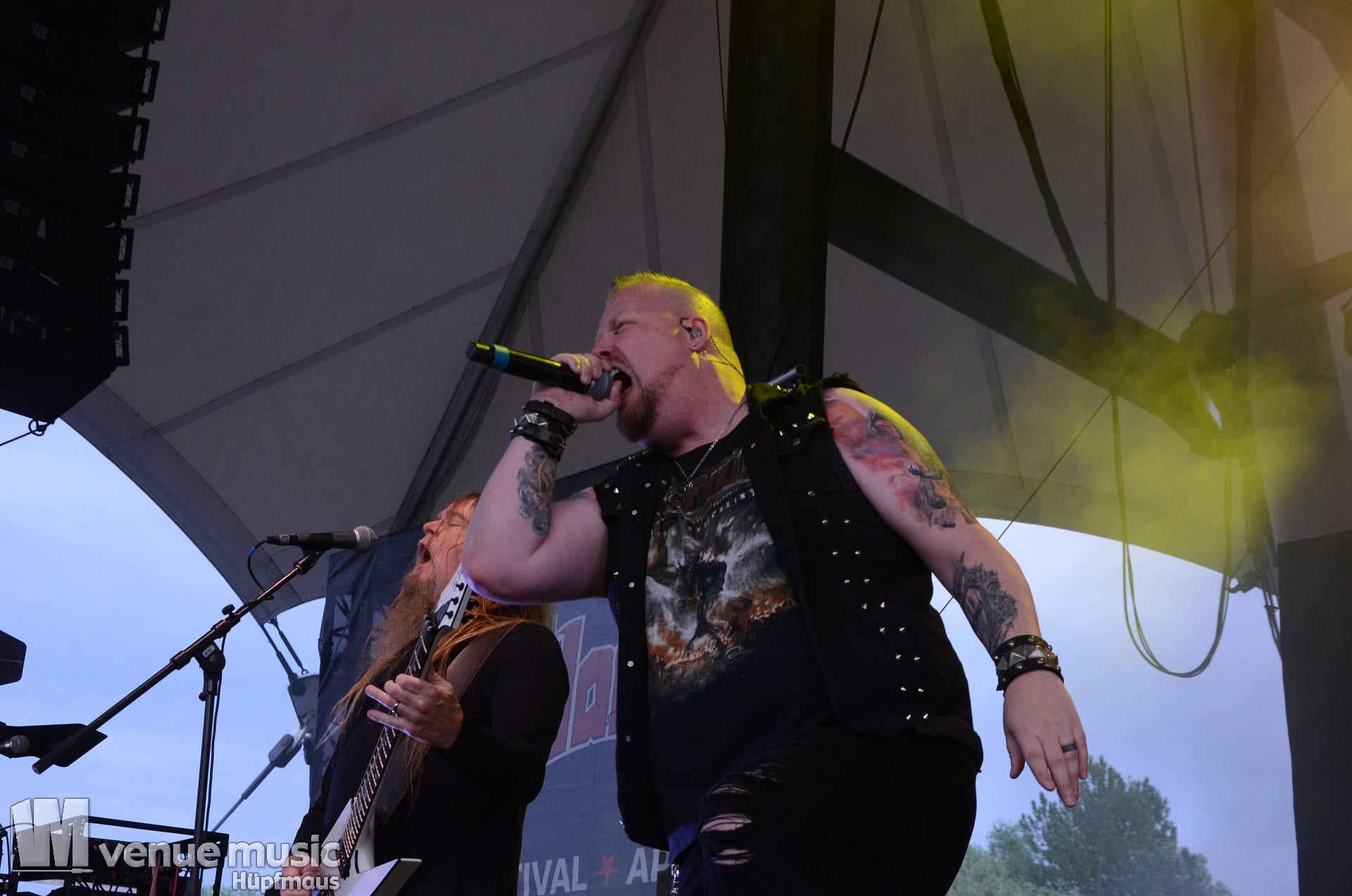 Als nächstes war dann eine der Bands dran, auf die wir uns sehr gefreut hatten: Forbidden. Grade erst wieder aktiv und mit zwei frischen Kräften an Drums und Vocals gaben sie auf der Bühne so richtig Gas. Thrash Metal aus der Bay Area vom Feinsten! Gelten doch auch ihre ersten beiden Alben „Forbidden Evil“ und „Twisted into Form“ aus den Jahren 1988 bzw. 1990 als Genre-Klassiker. Spätestens jetzt gab es im Publikum kein Halten mehr, das Amphitheater wurde zum Hexenkessel und die Graben-Security hatte ihre Mühe mit den Crowdsurfern. Denn leider muss man sagen, waren das auch alles keine Graben-Spezialisten um es mal gelinde auszudrücken. Glücklicherweise gab es bei den meisten Bands kaum Crowdsurfer. Doch hier mussten sie richtig ran.