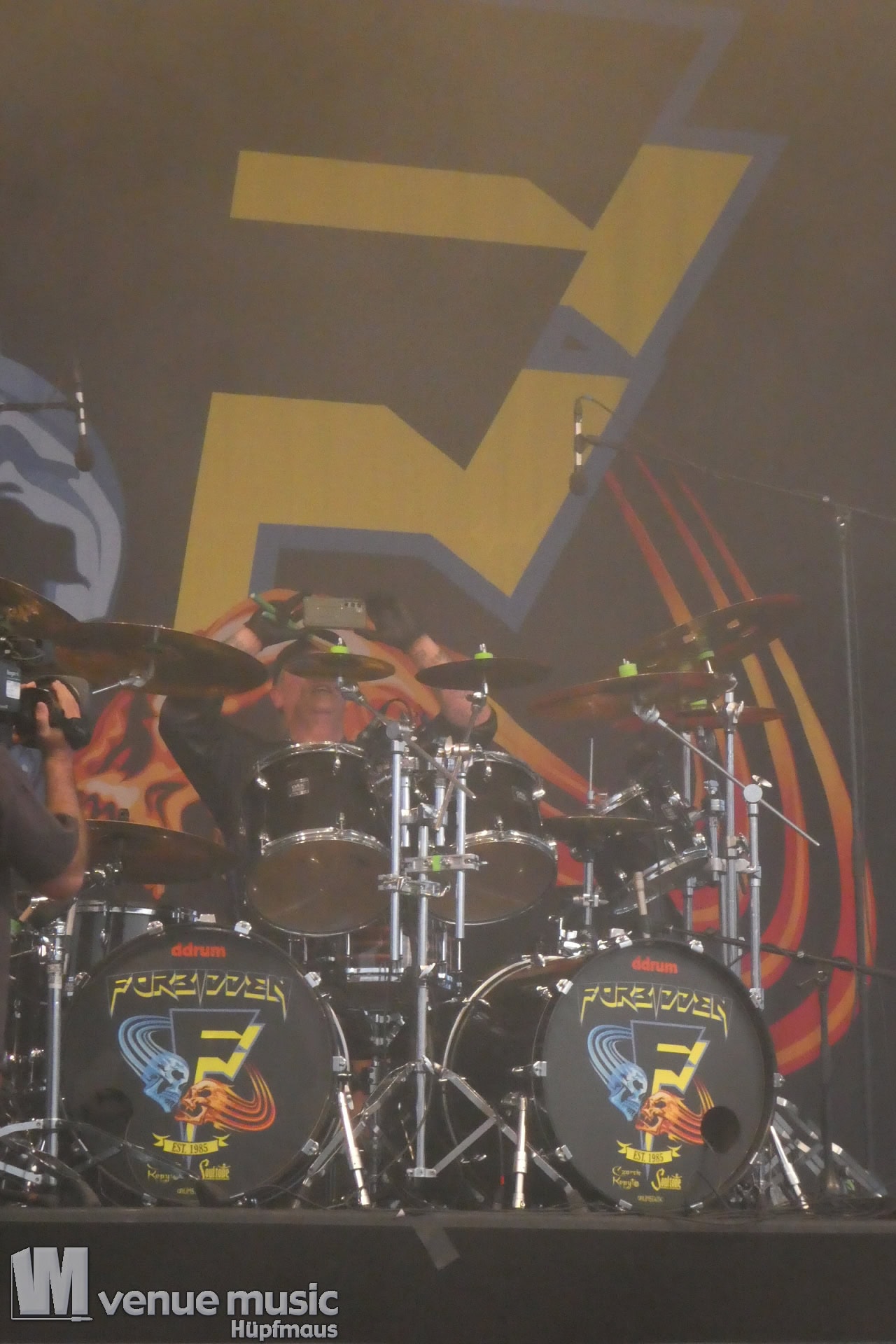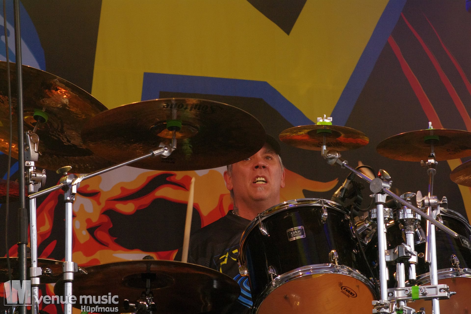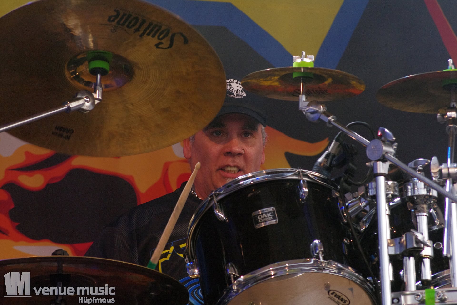 War ich froh, meinen Kamerakram wieder bei Freunden auf den Rängen lassen zu können, um noch vorne mit dabei zu sein. Im Amphitheater sieht man natürlich überall super und der Sound auf den Treppen ist toll und alles, aber so ein richtiges Konzert ist es für mich eben erst, wenn ich vorne (möglichst in der ersten Reihe) mit dabei bin. Und nicht nur zum Auspowern und mitfeiern hat es sich gelohnt, sondern ich bekam auch persönlich einen Drumstick von Chris Kontos zugeworfen und als sich den wer anderes (ich hatte meine Hand dran und der auch) schnappen wollte sagte er „it´s for her!!!“. Geil! Bekommt daheim einen Ehrenplatz!