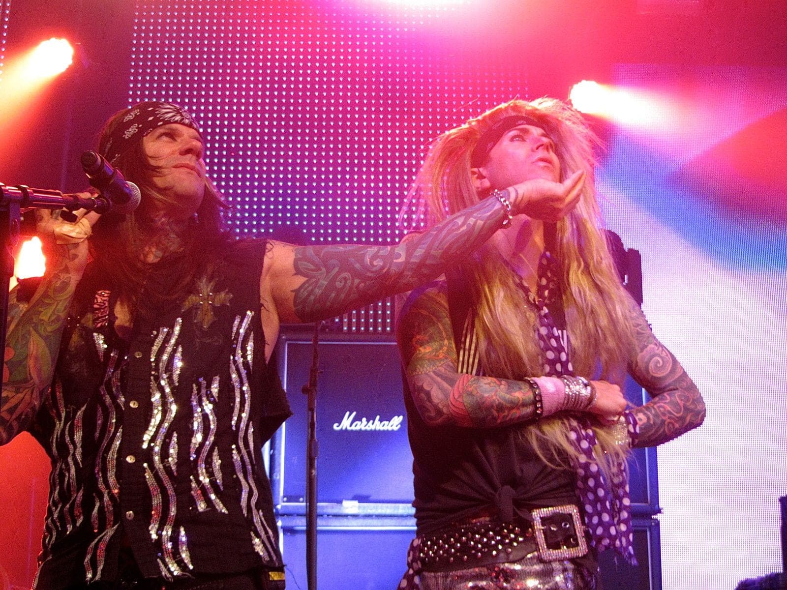 Irgendwie lustig war übrigens der arme Kerl hinter uns, der auf seinem ersten Steel Panther Konzert war und wohl nicht wusste, dass Michael Starr sich gerne mal eine Kamera aus dem Publikum greift mit der gerade gefilmt wird und dem Fan so einige wirklich einmalige Aufnahmen beschert. Im ersten Moment geriet er dann schon leicht in Panik, als Michael ihm das Handy aus der Hand nahm. Die Security wurde auch leicht panisch, als zwei Fans in der ersten Reihe eine kleine Pyro-Show starteten. Tipp an die Fans: Es reicht eine Wunderkerze anzuzünden, man muss nicht gleich eine ganze Hand voll abfackeln (und irgendwie schauten Lexxi und Stix in dem Moment auch etwas seltsam, ich nehme mal an, ihre Perücken sind nicht feuerfest ;)). Und Tipp an die Security: Mit richtiger Einlasskontrolle wäre das wahrscheinlich nicht passiert…