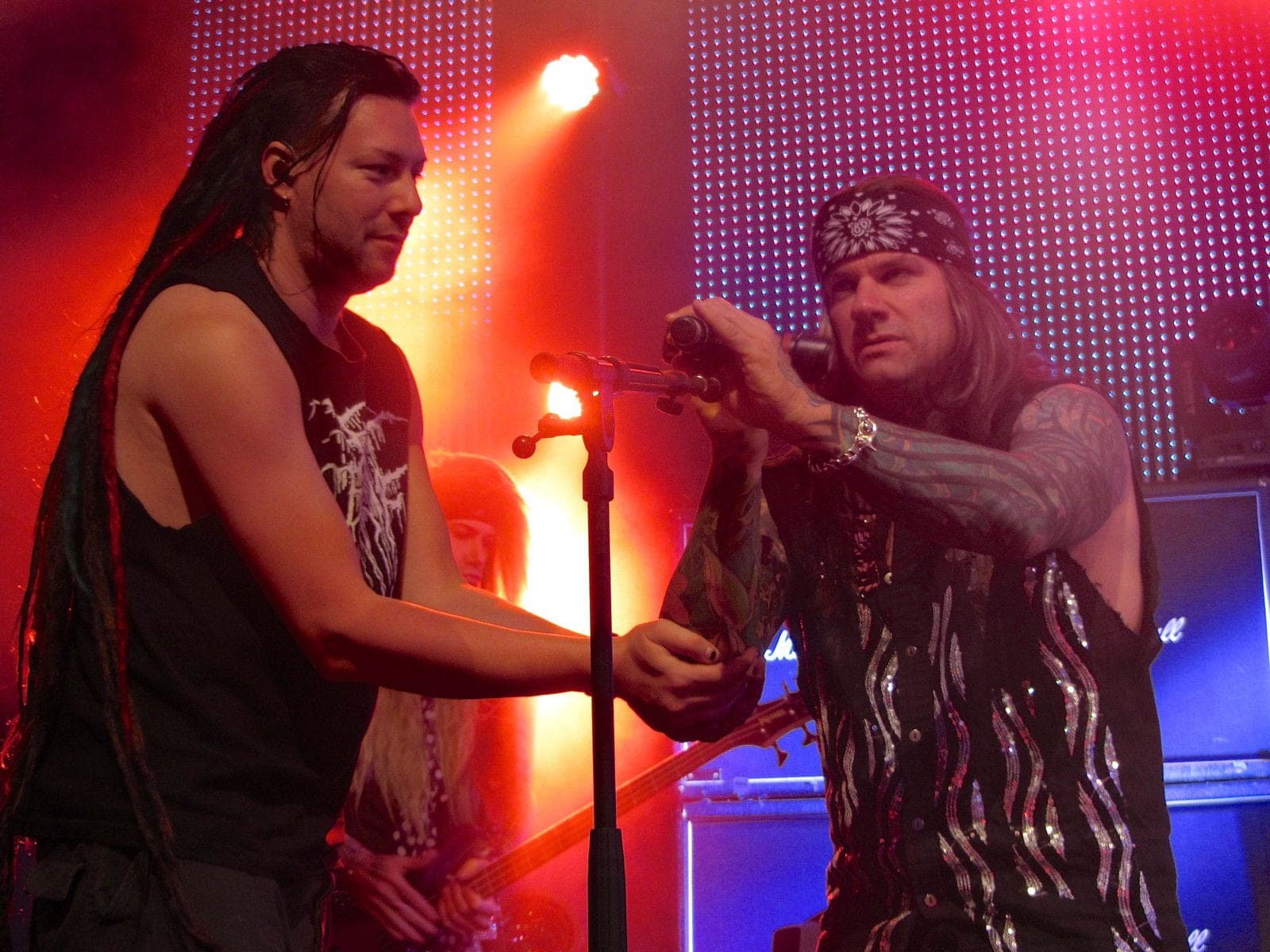 Der Einlass zog sich trotz mehr als lascher Kontrollen ziemlich in die Länge – aber offenbar hatten die Security-Mitarbeiter in dem Club nicht wirklich viel Erfahrung mit Metal-Konzerten. Anders kann ich mir nicht erklären, wie die auf die idiotische Idee kommen konnten anfangs zu versuchen vom Publikum einen Sicherheitsabstand von den Barricades zu verlangen. Ähnlich erfolglos blieb dann auch der Versuch dem Publikum die Benutzung von Handy- und Kompaktkameras zu untersagen. Und das bei einer Band, die regelmäßig erklärt, dass die vom Publikum mitgefilmten Teile und Foto gefälligst veröffentlicht werden sollen, damit alle was davon hätten. Und während der Einlass noch lief und eigentlich eine knappe halbe Stunde zu früh startete auch schon der Support: „Kobra and the Lotus“. Die waren gut, wirklich, aber nicht so gut, dass sie uns jetzt vom Hocker gehauen hätten.