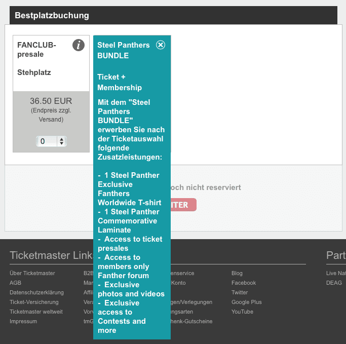 Heute startete der exklusive Pre-Sale für Tickets der Deutschland-Tour im März 2015 von Steel Panther(*). Dieser sollte exklusiv für Fanclub-Mitglieder sein. Also für diejenigen Fans, die für eine Mitgliedschaft $40 pro Jahr zahlen, um dafür u.a. einen Code zu erhalten, der den Zugriff auf den exklusiven Vorverkauf frei schaltet. Aber man kann auch als Nicht-Mitglied am Vorverkauf teilnehmen, dafür gibt es ein Bundle: zusammen mit einem Ticket erhält man dann eine Fanclub-Mitgliedschaft. Soweit so gut, aber einige Fans, die bereits Mitglied im Fanclub sind dürften sich jetzt ein klein wenig verarscht vorkommen: