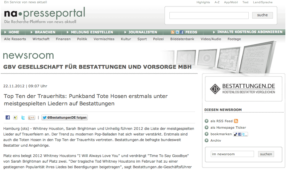 Es gibt tatsächlich Statistiken darüber, welche Songs wie oft bei Beerdigungen gespielt werden. Diese Charts werden aber nicht wöchentlich zusammen gestellt und ganz ehrlich: Ständig