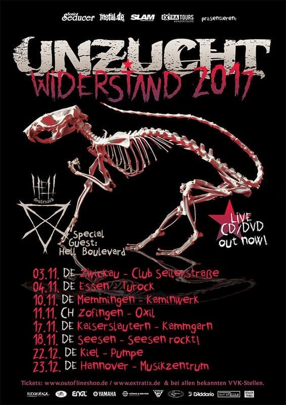 Die Band Unzucht aus Hannover gönnt sich keine Pause: Erst kürzlich waren die Jungs auf großer „Sturmfahrt“-Tour mit Eisbrecher und pünktlich zu Beginn dieser Tour veröffentlichten Unzucht am 01. September 2017 ihr erstes Live-Album „Widerstand (Live in Hamburg)“(*). Nun folgt im November und Dezember 2017 eine eigene Clubtour, die einen Tag vor Weihnachten mit einem Heimspiel in Hannover beendet wird.