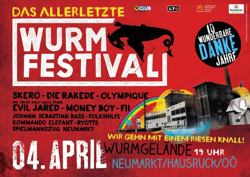 Am 4. April 2015 wird das Wurmfestival zum letzten Mal stattfinden, dementsprechend steht das Festival dieses Mal unter dem Motto „The End“. Deswegen wird aber nicht beim Programm gespart, ganz im Gegenteil. Dieses letzte Wurmfestival ist ein Abschied und ein Dankeschön für 10 Festival-Jahre in Neumarkt: